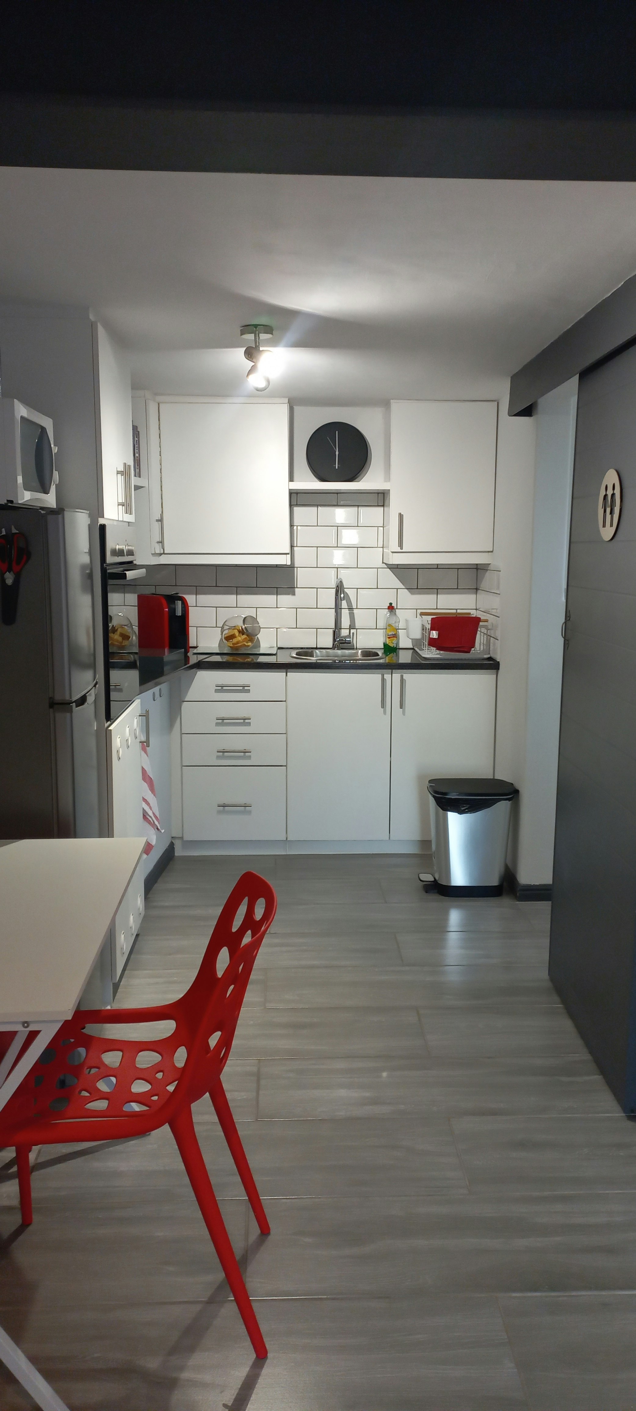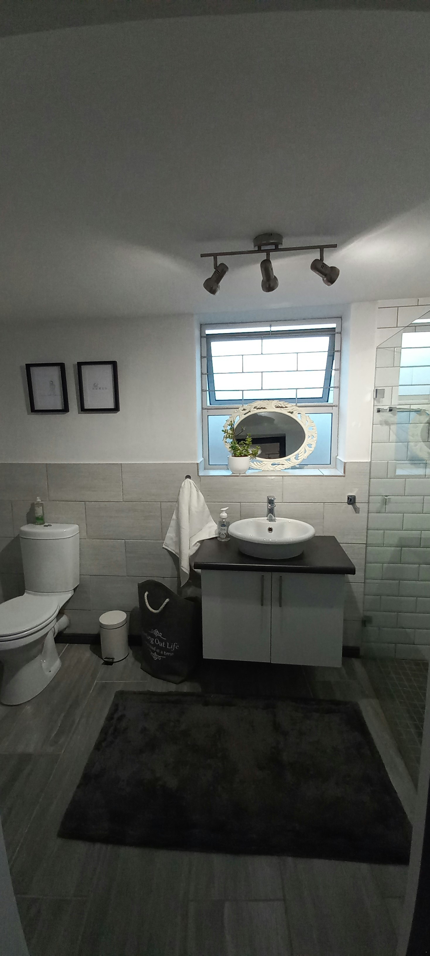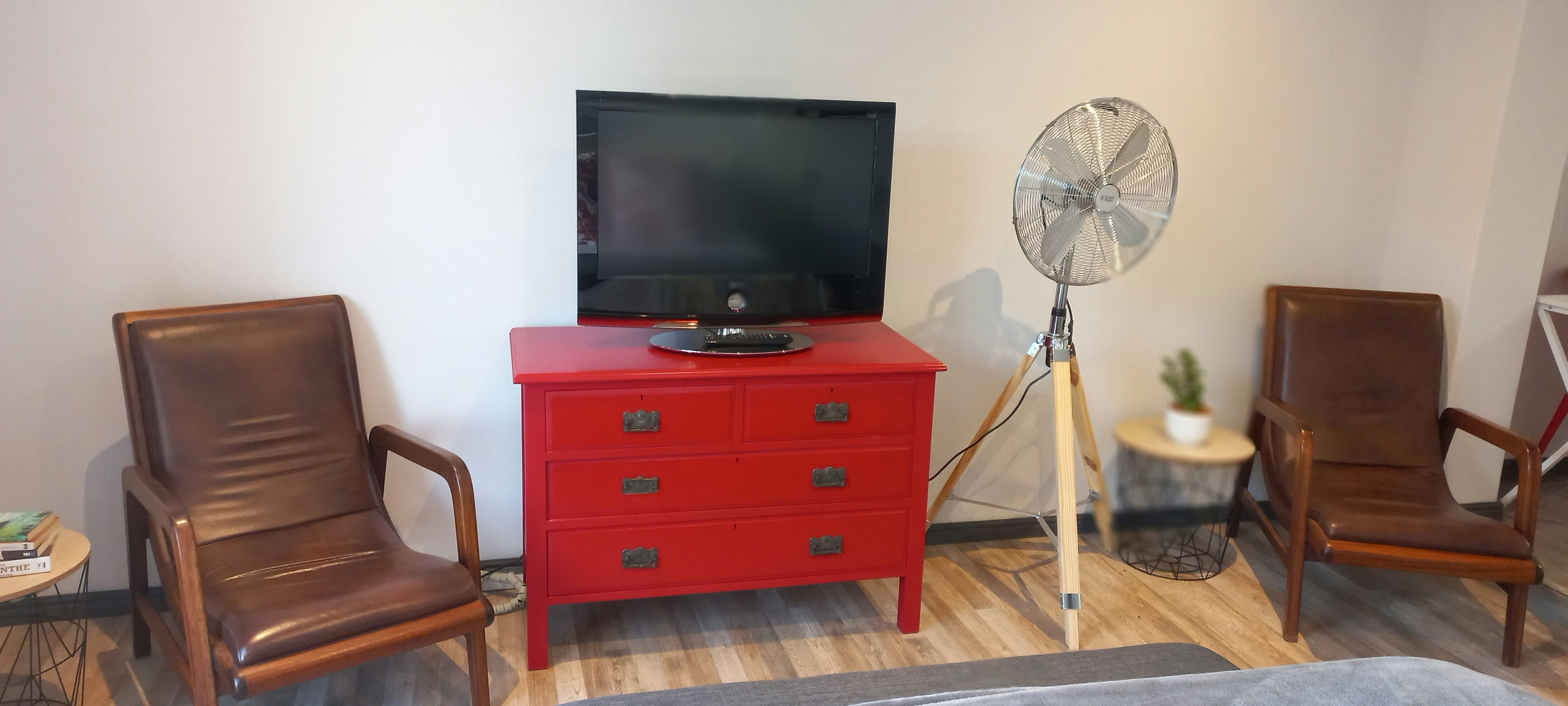 Die oopplan-woonstel het 'n koninggrootte-bed, 'n TV, etenstafel met sitplek vir 2, 'n kombuisie, en 'n en suite-badkamer met 'n stort, toilet en wasbak.