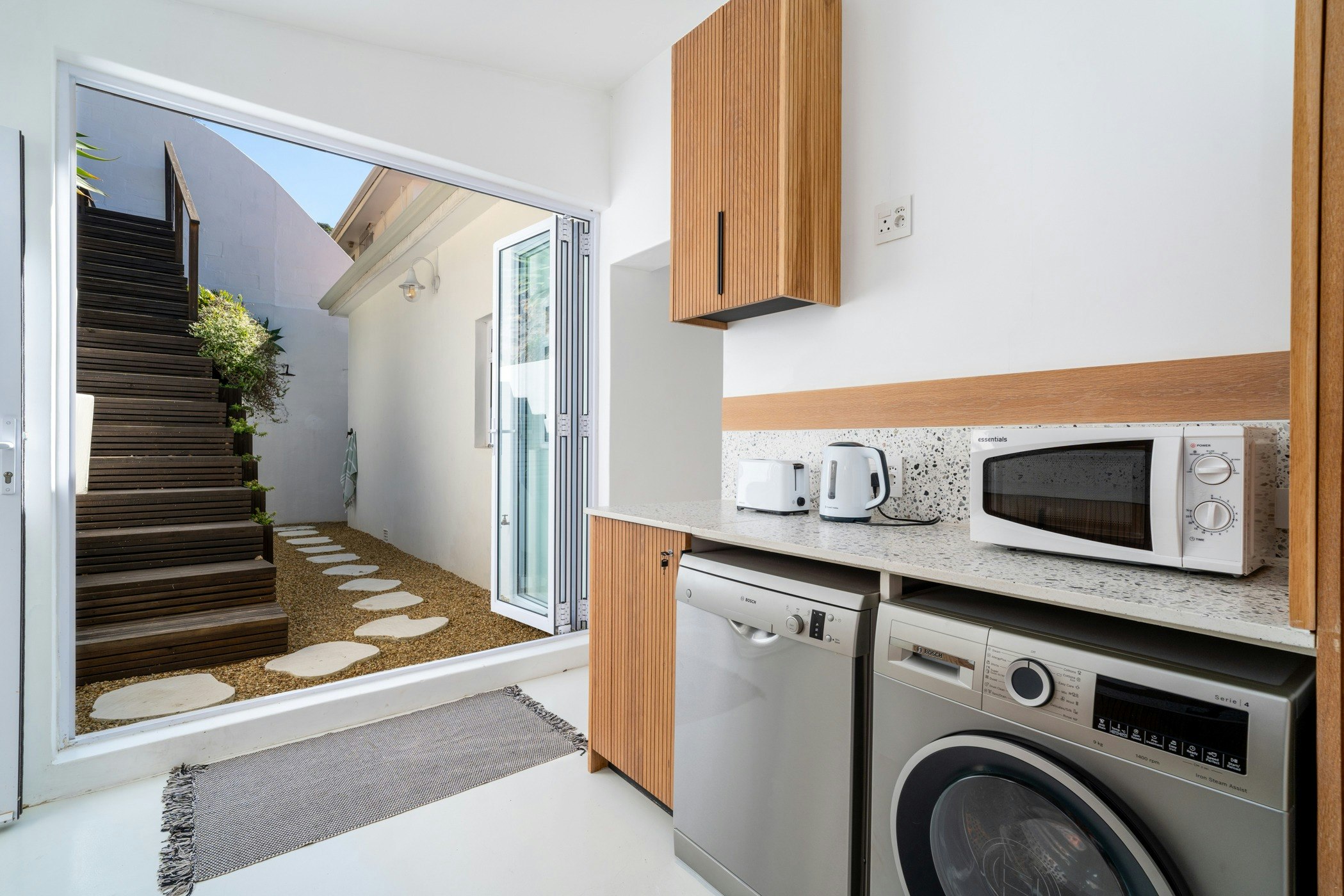 Die leefarea sluit 'n moderne kombuis in wat toegerus is met 'n yskas-vrieskas, gasstoof, oond, mikrogolfoond, eetgerei en breekware, en tee- en koffiemaakgeriewe, sowel as 'n ontbyttoonbank met stoele. 'n Wasmasjien en skottelgoedwasser is beskikbaar in die aparte opwaskamer vir ekstra gerief. Aangrensend aan die kombuis beskik die eetarea oor 'n houtkaggel en 'n tafel met 6 sitplekke, wat lei na die gemaklik gemeubileerde sitkamer met 'n slim-TV teen die muur wat stromingsdienste en asemrowende see-uitsigte bied. WiFi is regdeur die eiendom beskikbaar.
