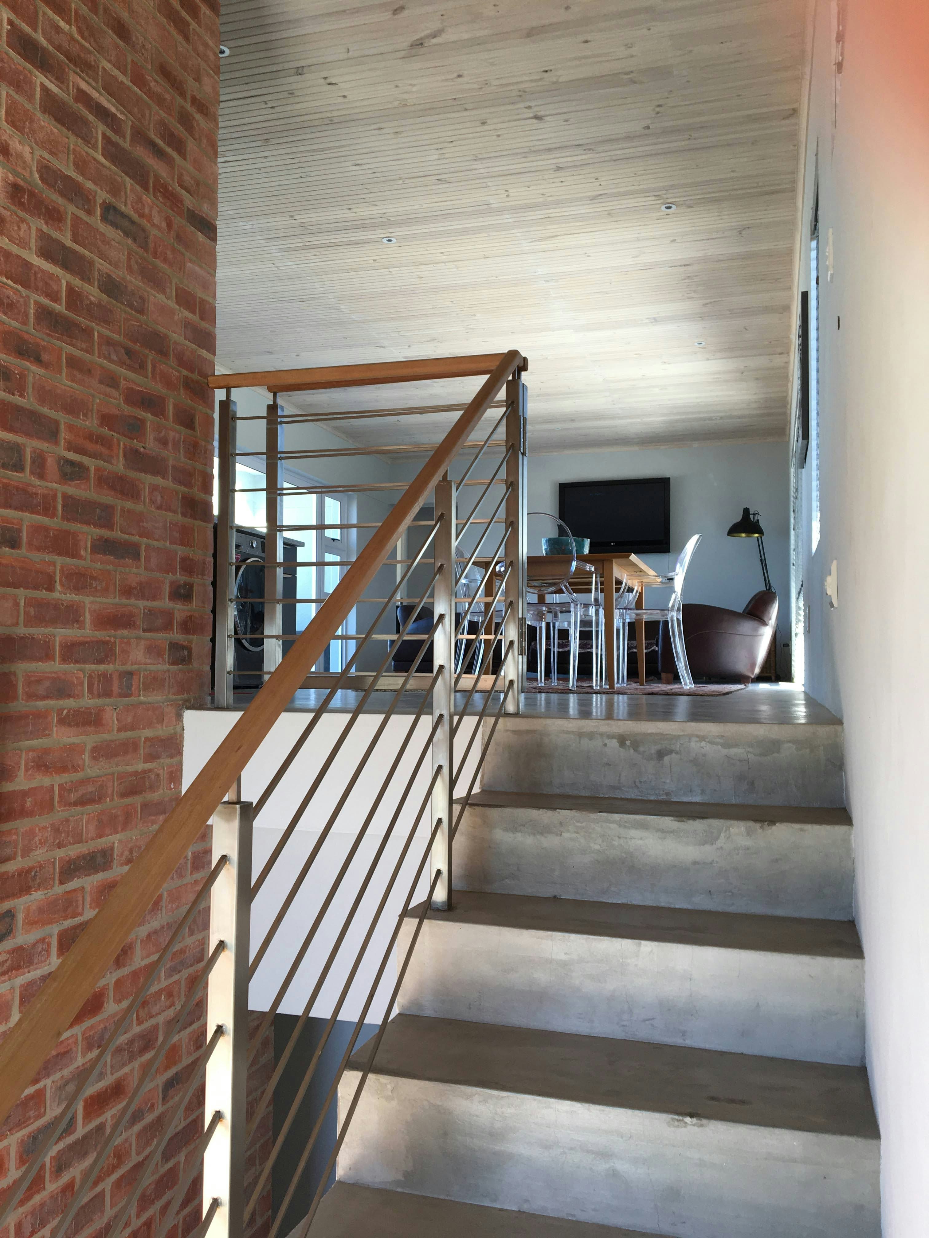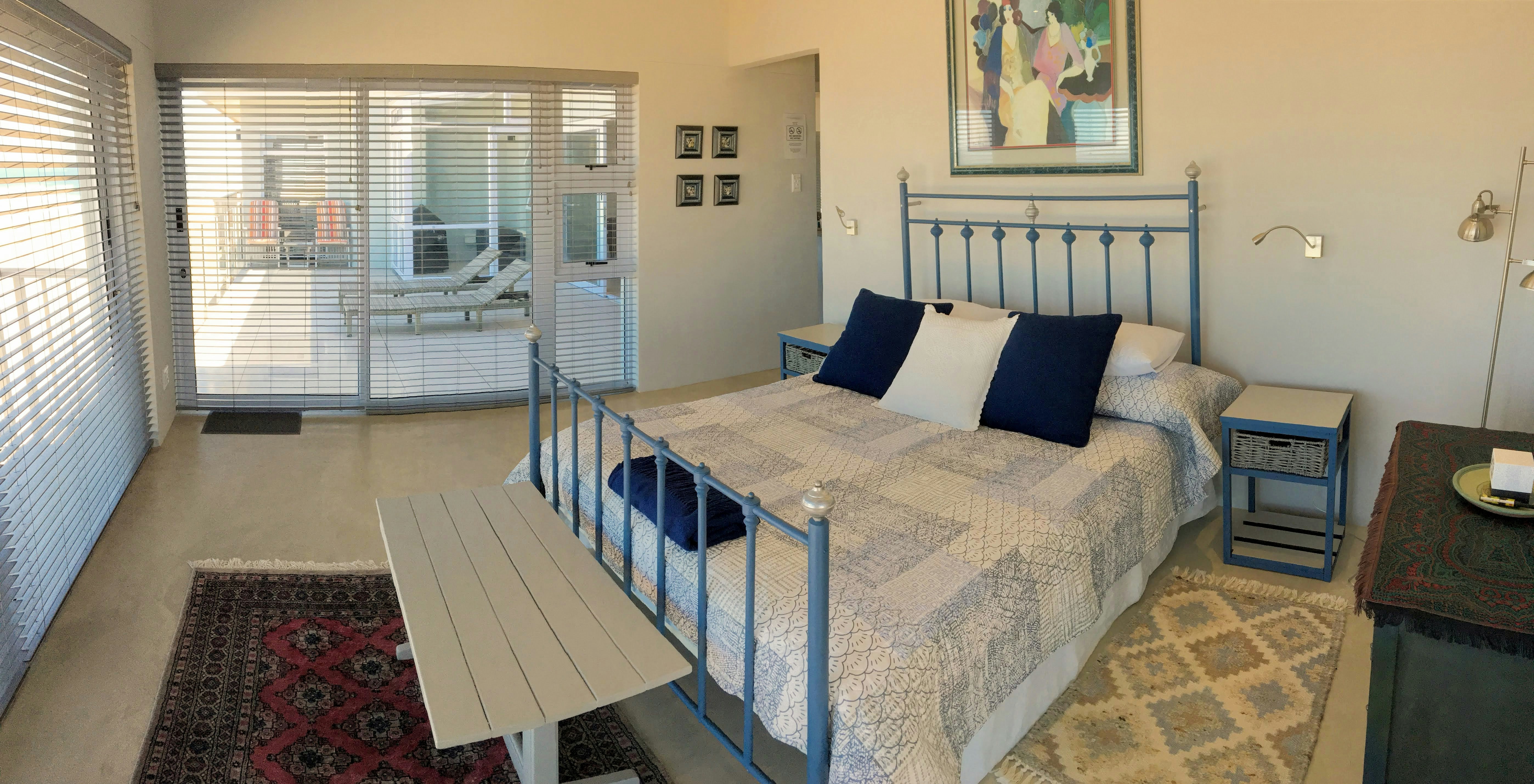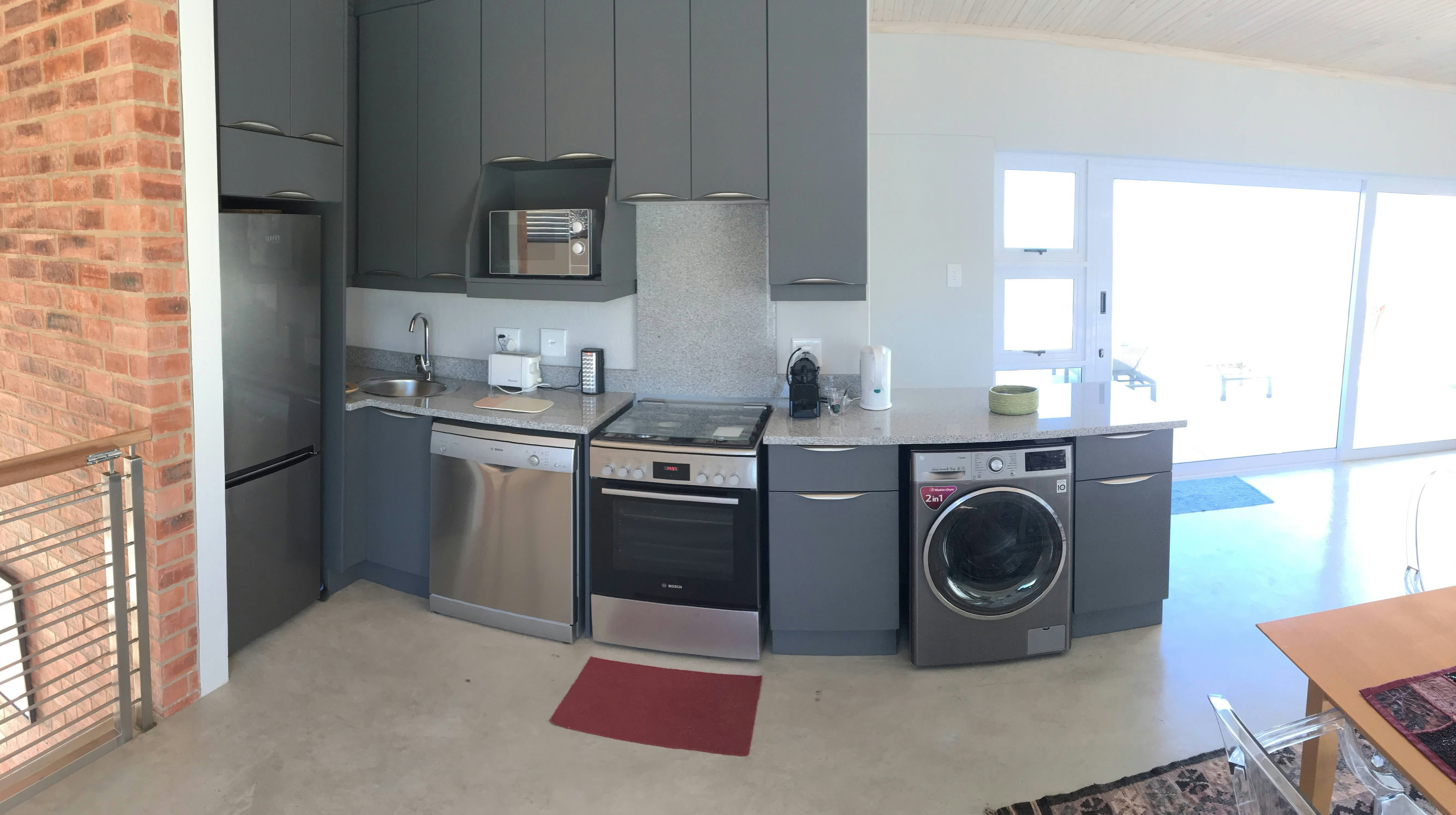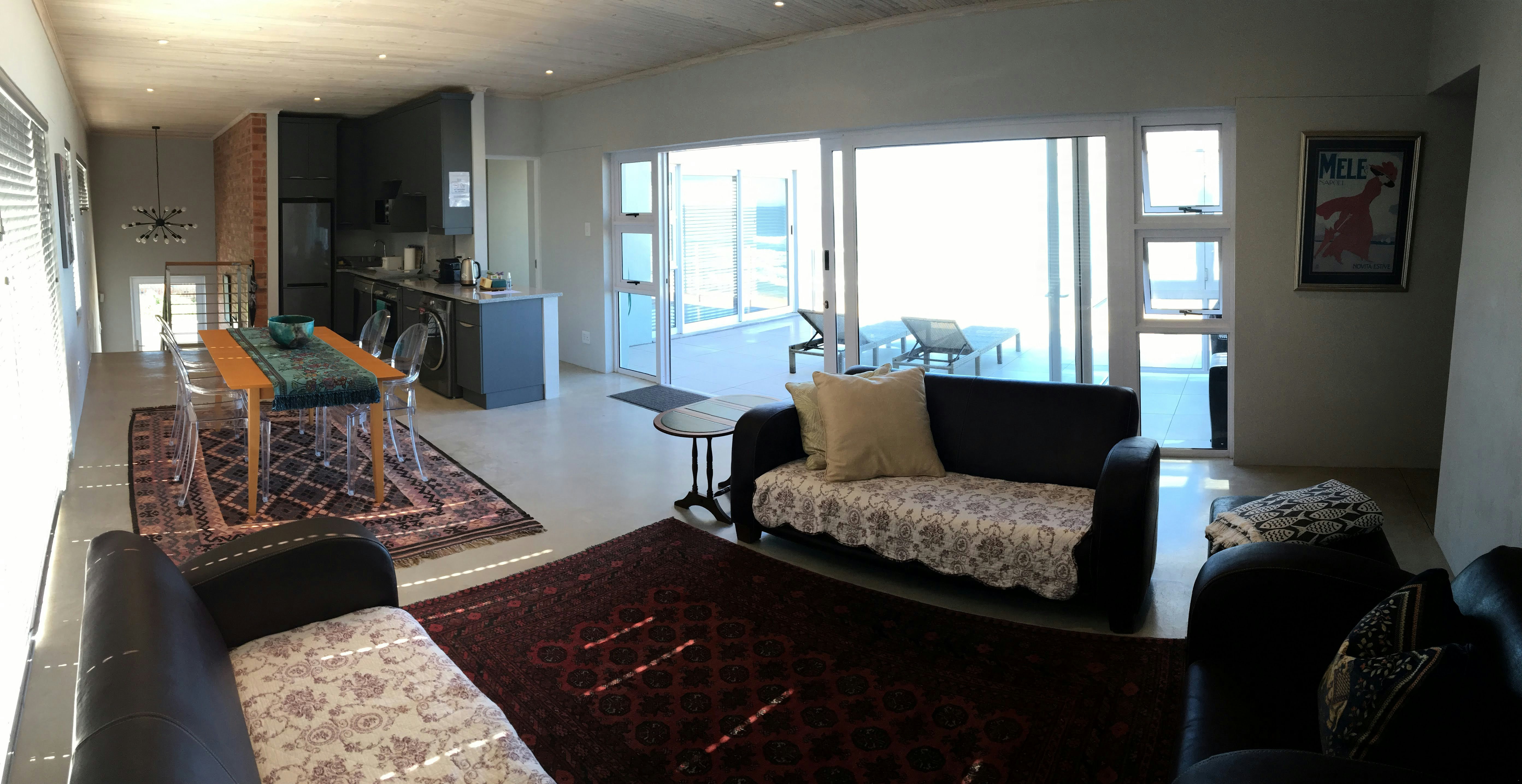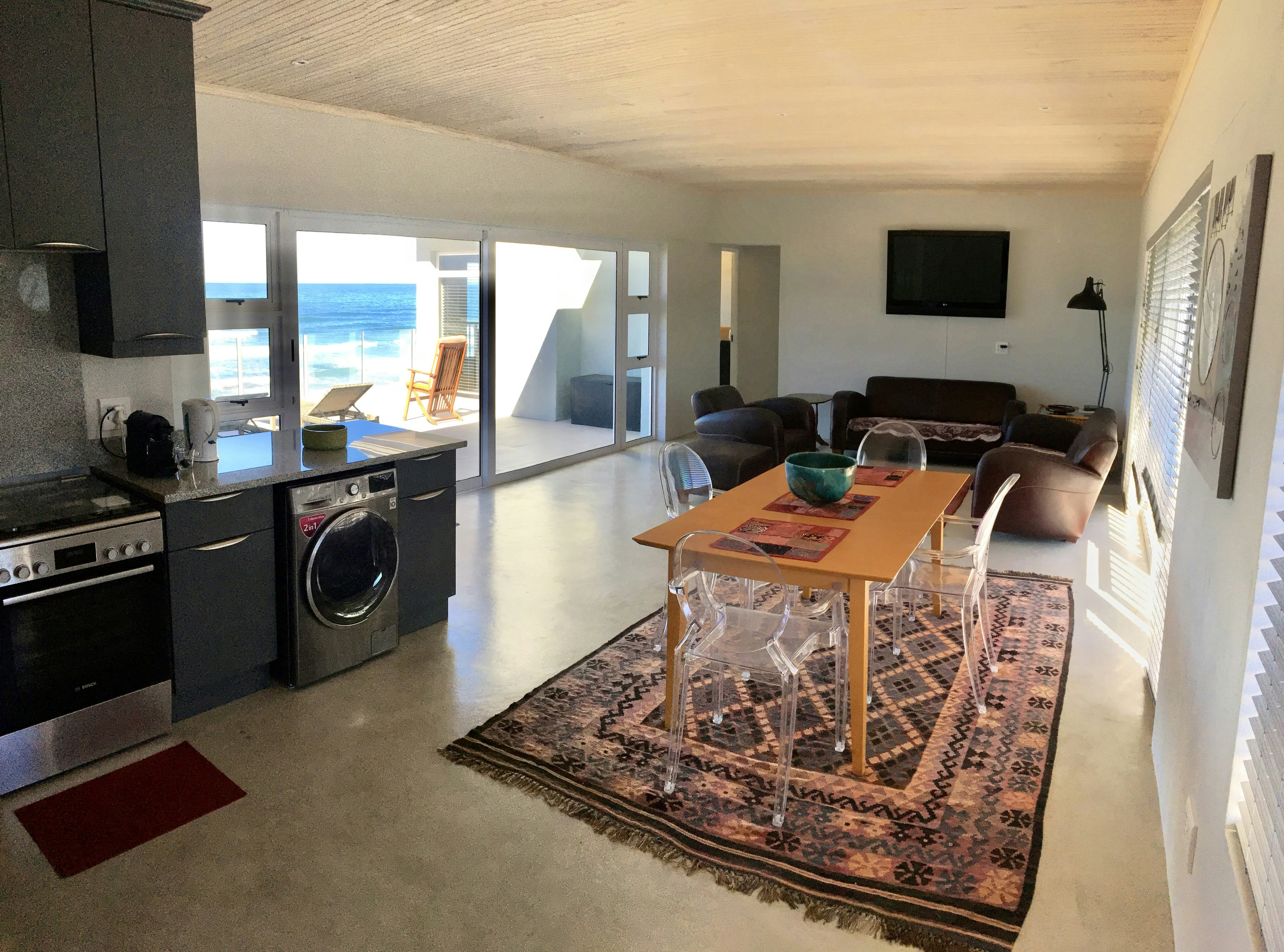 The living area has a TV with Netflix, Showmax, YouTube and selected DStv channels. The living area leads onto a spacious patio with sun loungers for tanning in privacy. In addition, there is a glass-enclosed braai room on the patio, overlooking the sea, perfect for any weather conditions.