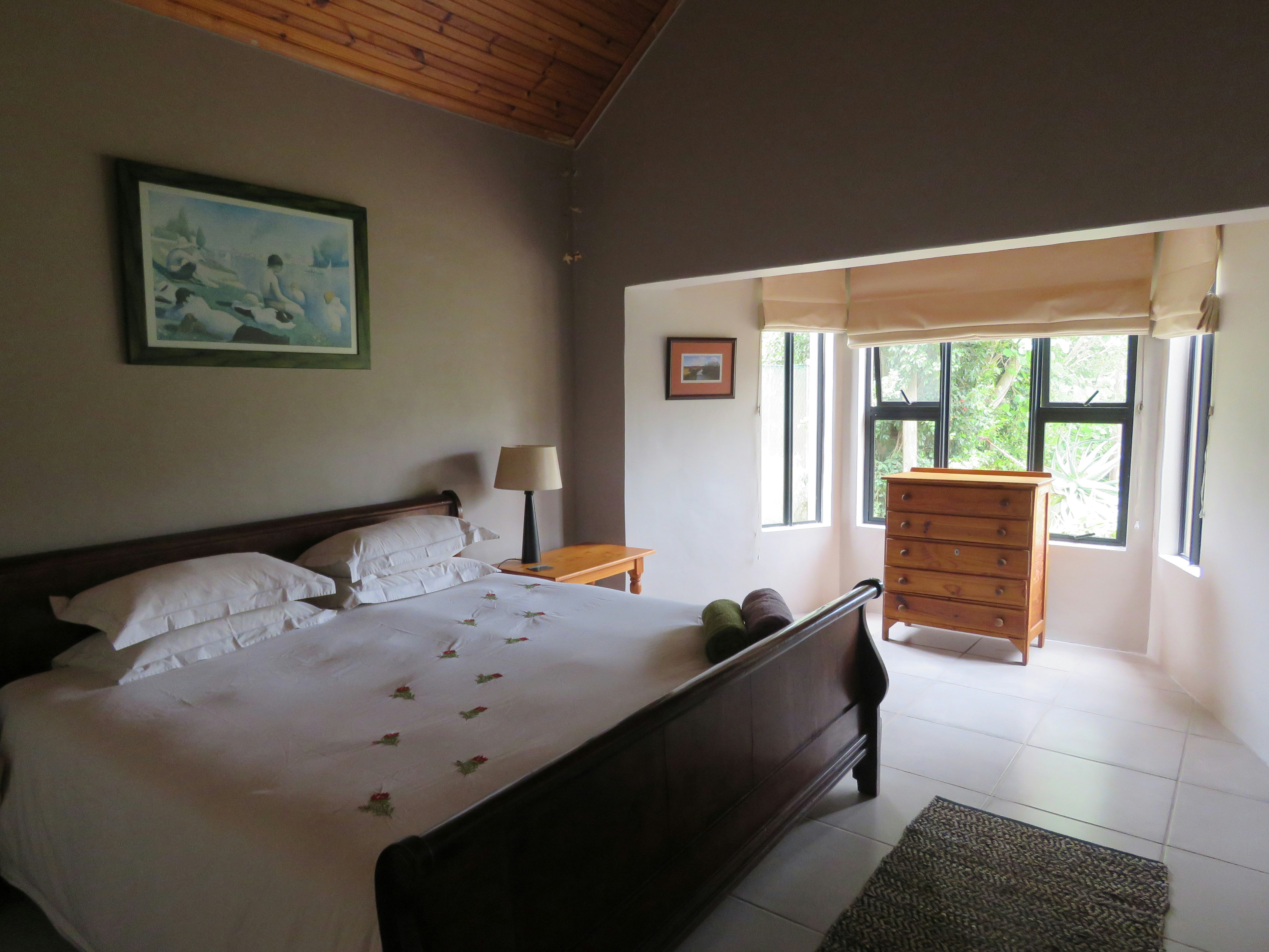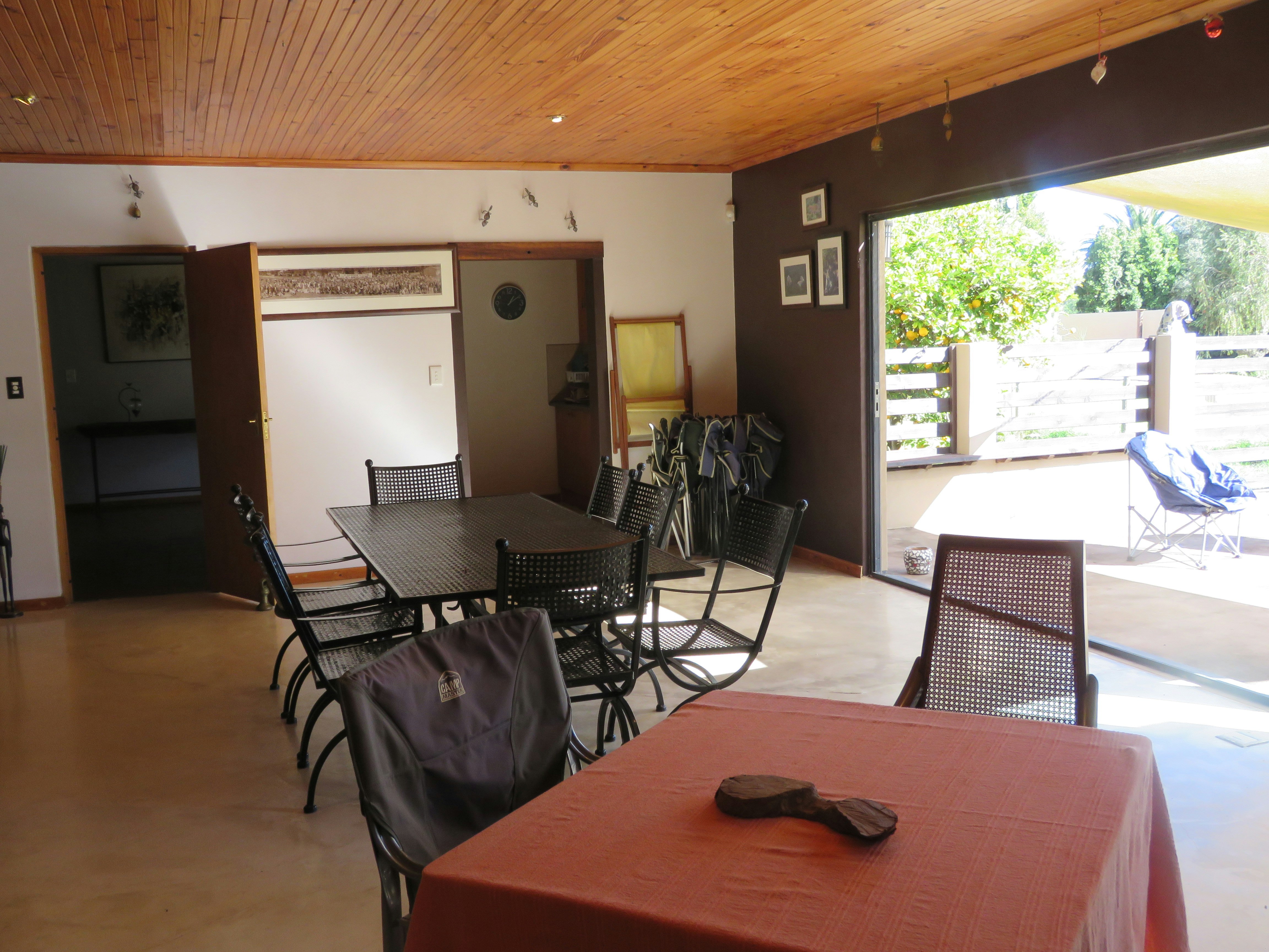 The dining room opens onto the patio, enclosed with seating space and a wooden slatted fence, and has an outdoor braai area. There’s also a swimming pool for guests' enjoyment.