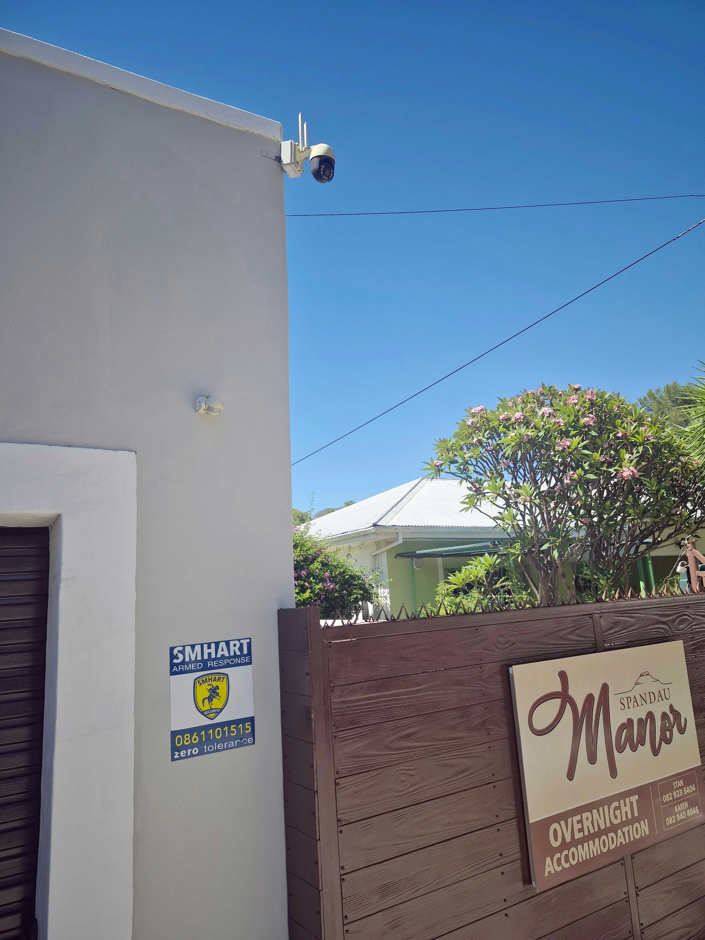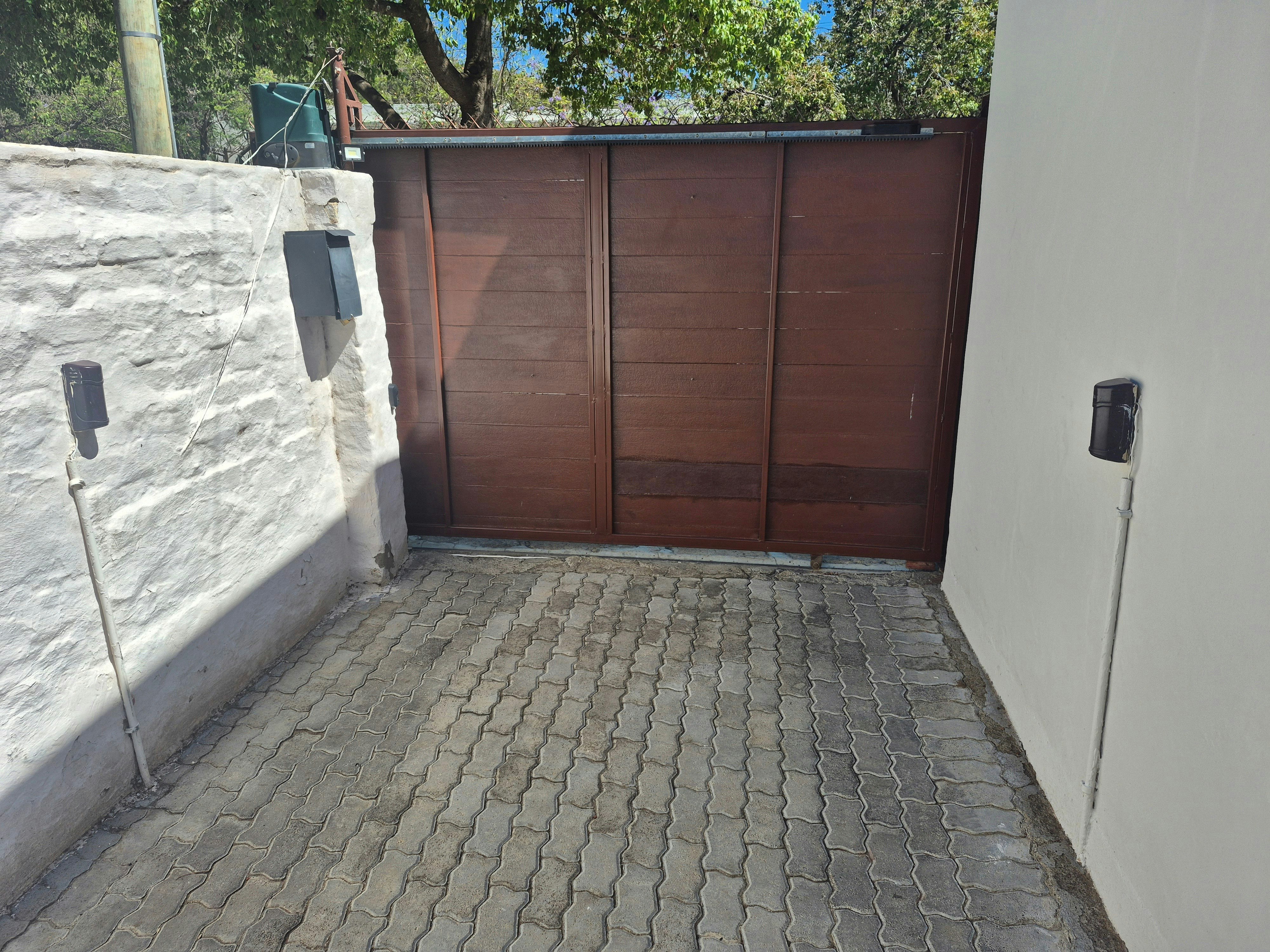 Secure parking behind a remote-controlled gate, out of sight of the street is available. The parking area is equipped with security lights, beams and cameras. The property has a security system with armed response.