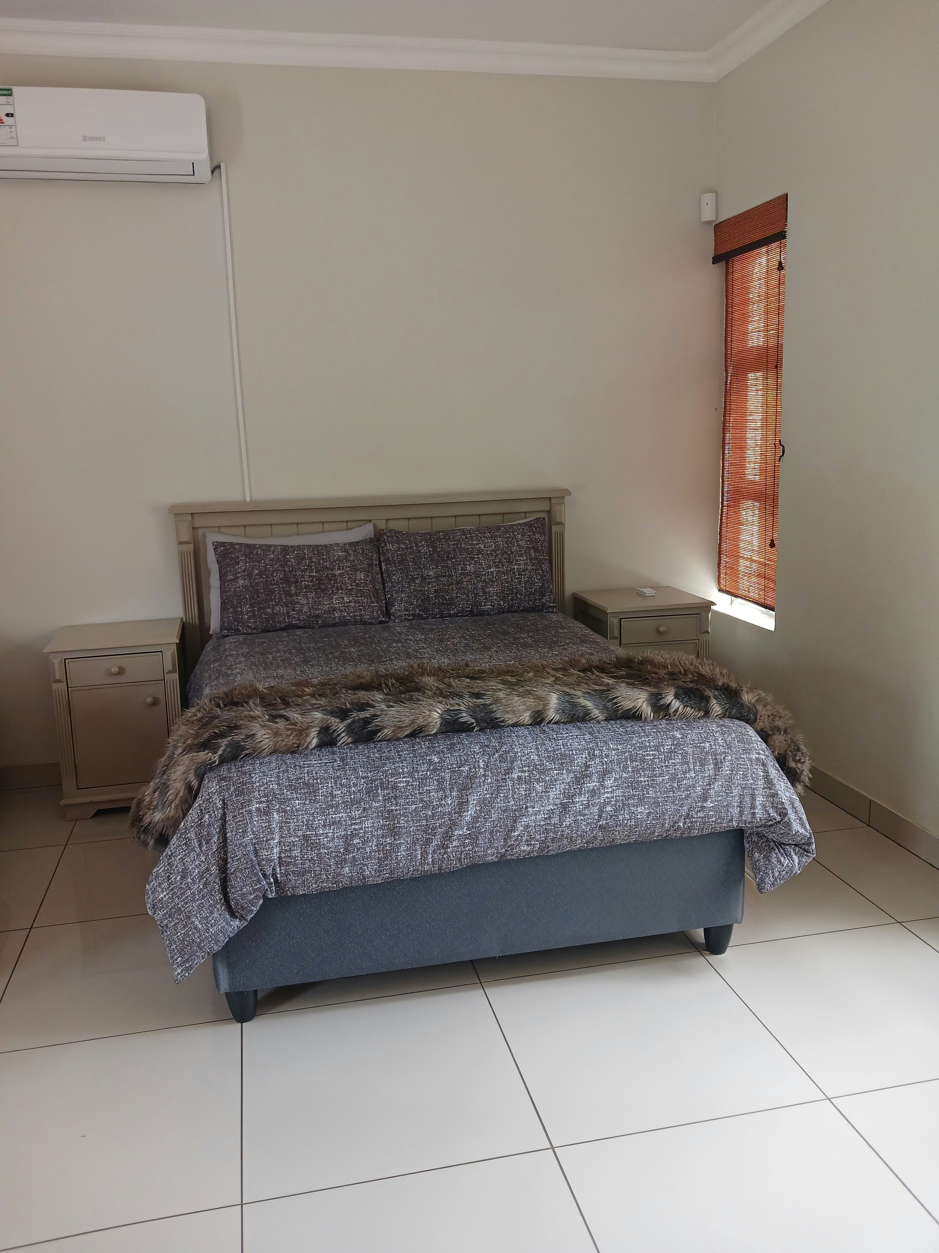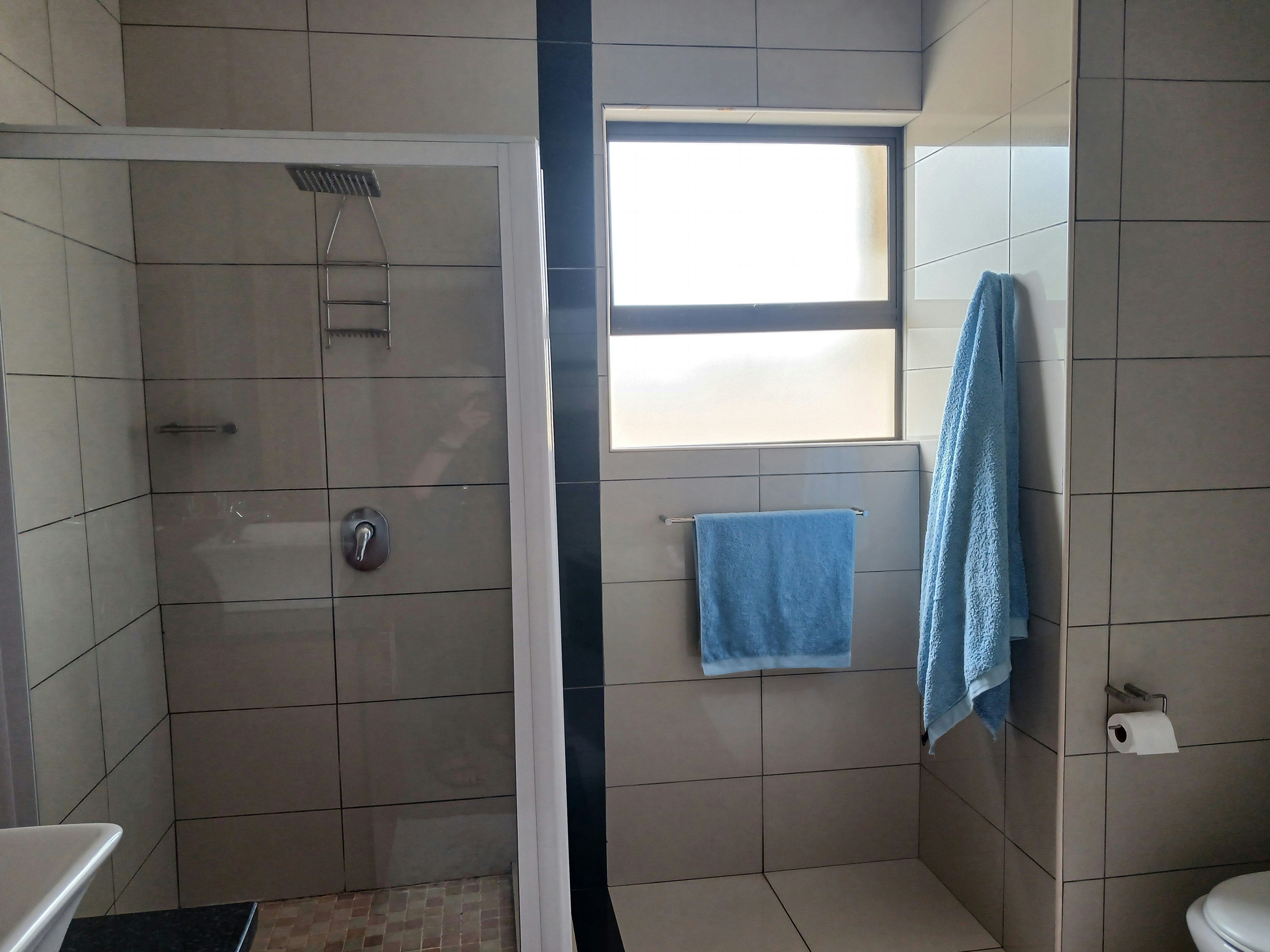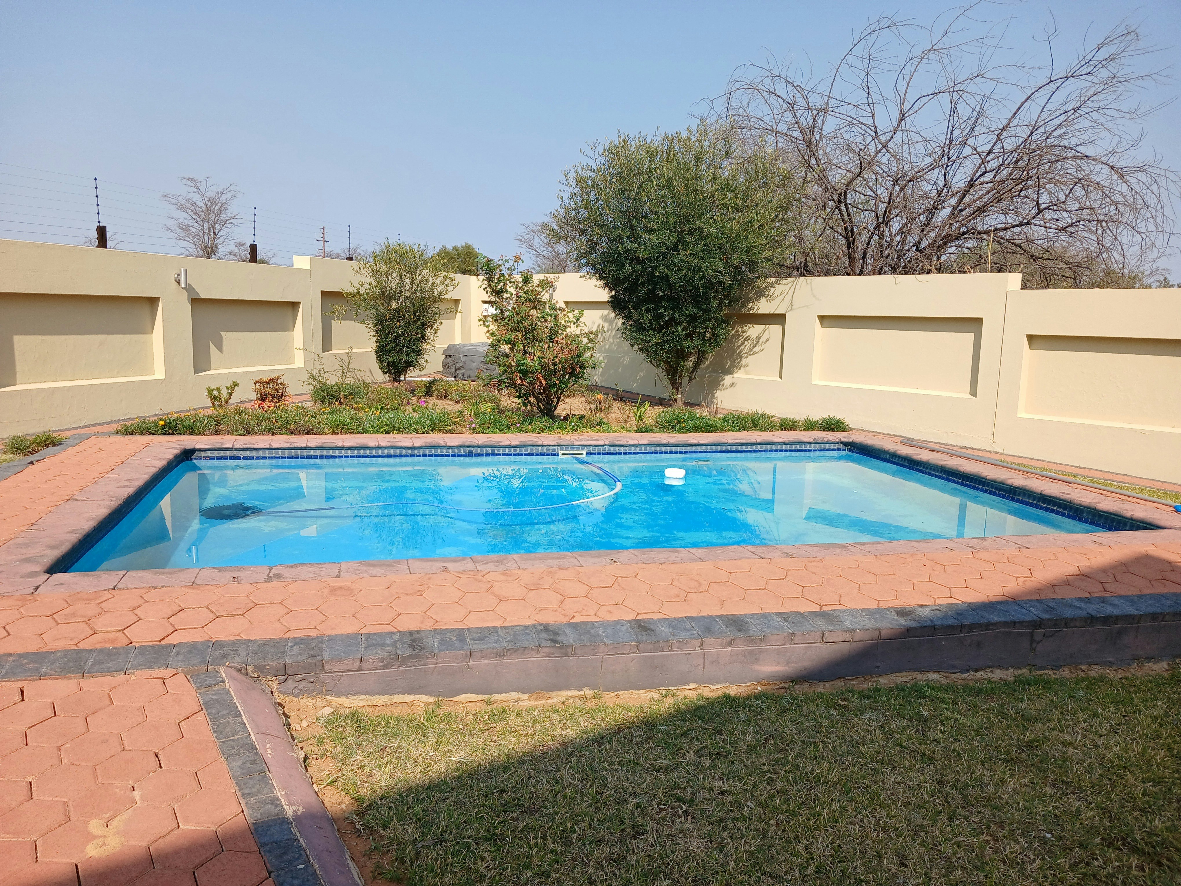 The kitchen is equipped with a fridge-freezer, stove, oven, microwave, kettle and toaster. Additional facilities include a gas braai, swimming pool, lapa, free Wi-Fi, air-conditioning, a TV, DStv and secure parking.