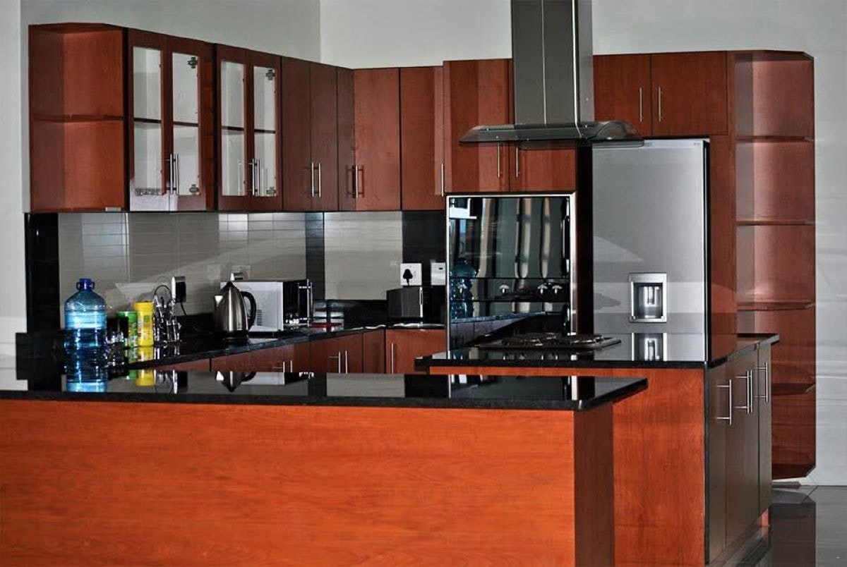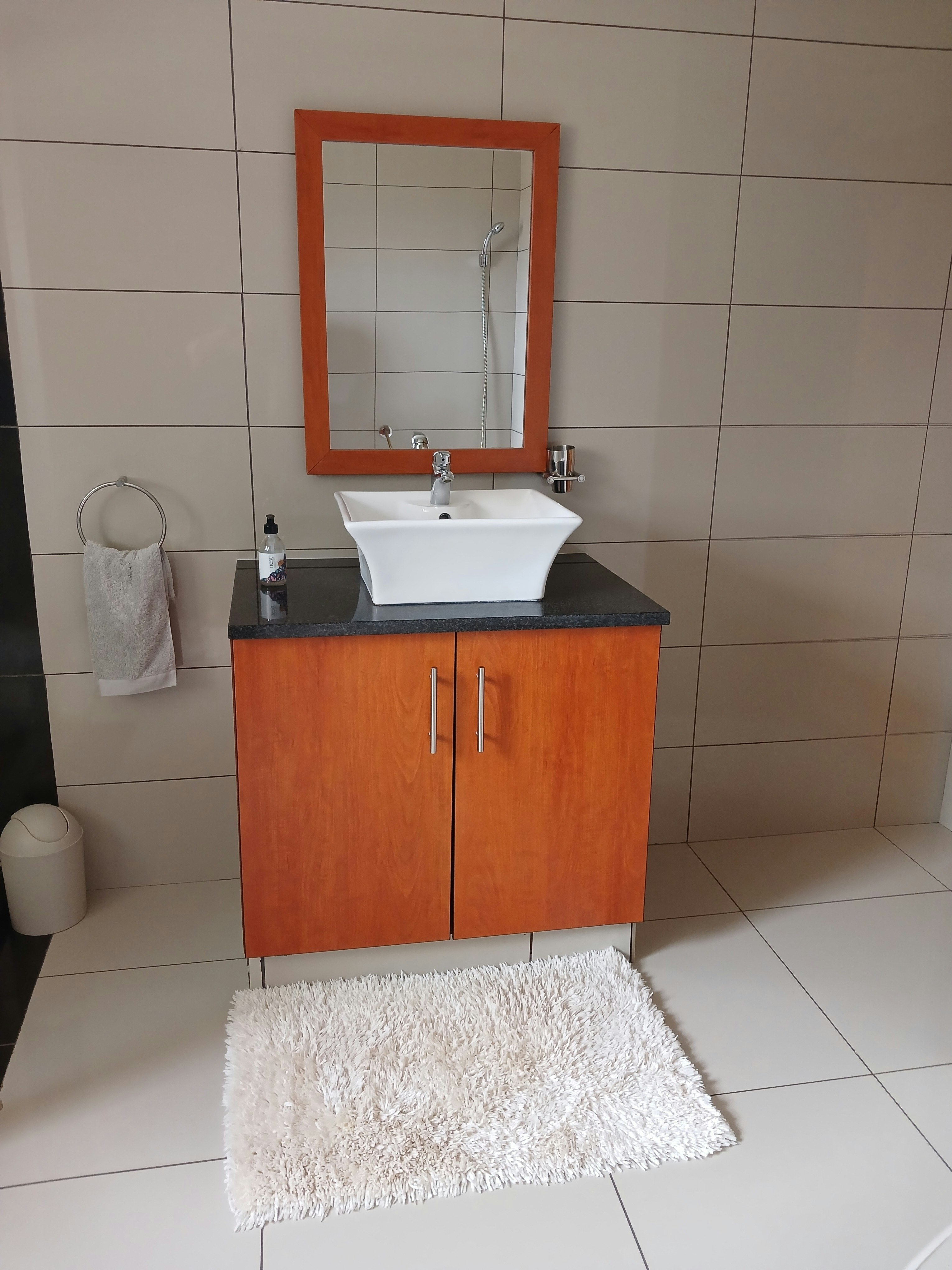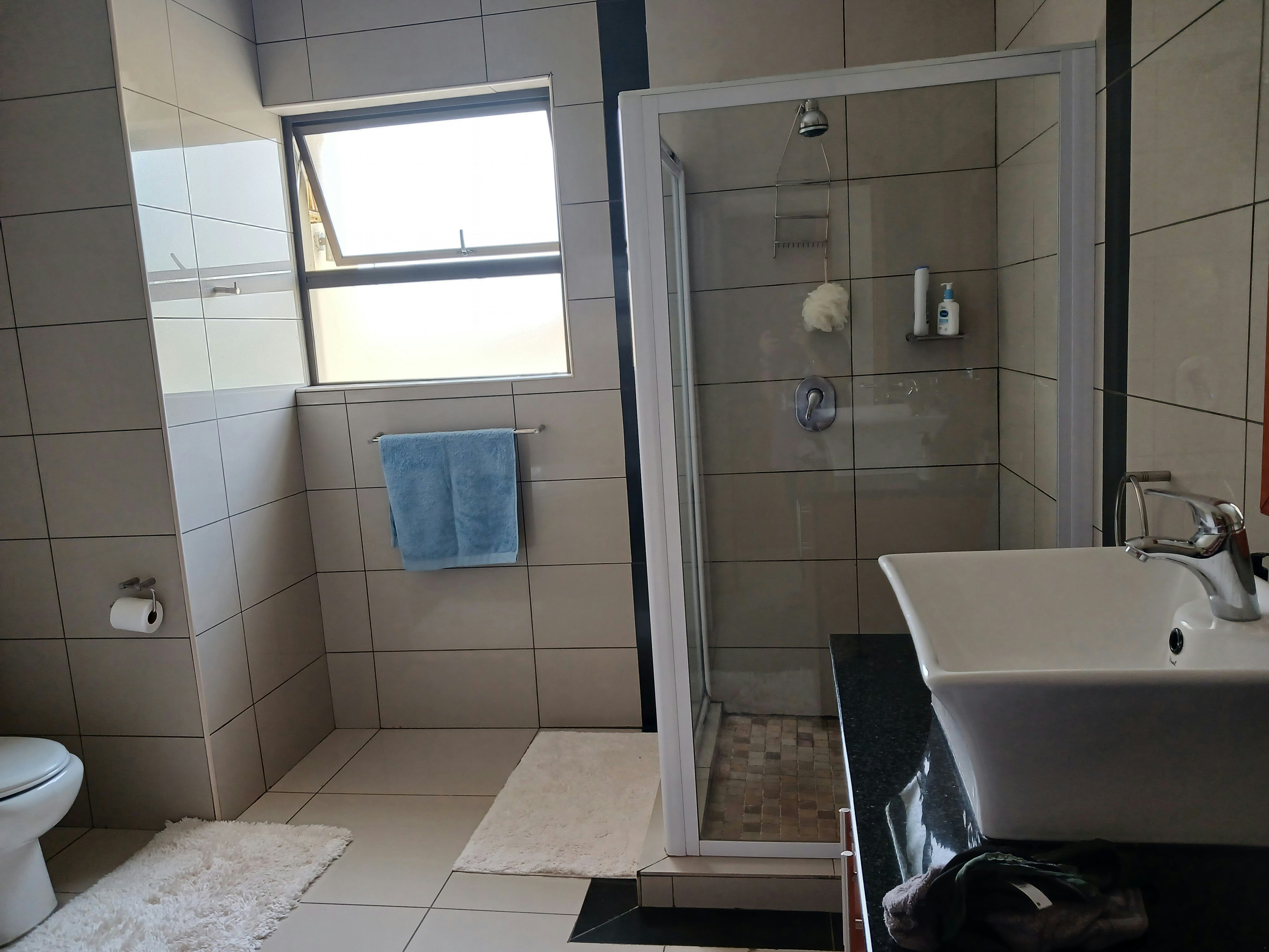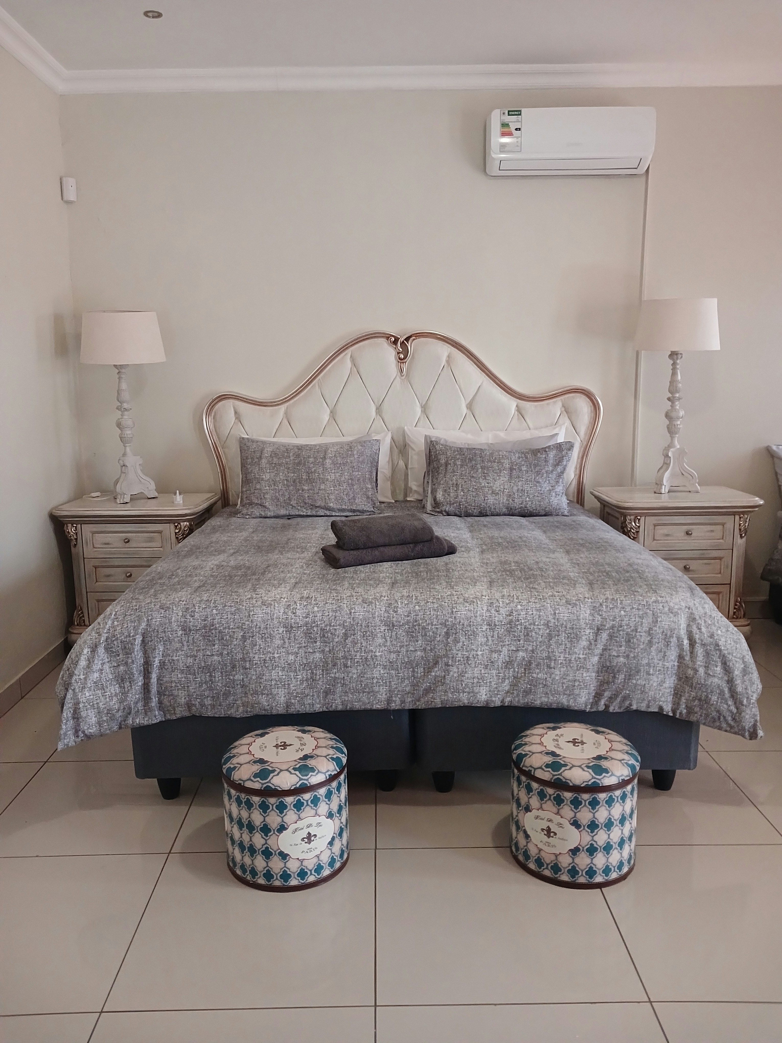 The kitchen is equipped with a fridge-freezer, stove, oven, microwave, kettle and toaster. Additional facilities include a gas braai, swimming pool, lapa, free Wi-Fi, air-conditioning, a TV, DStv and secure parking.