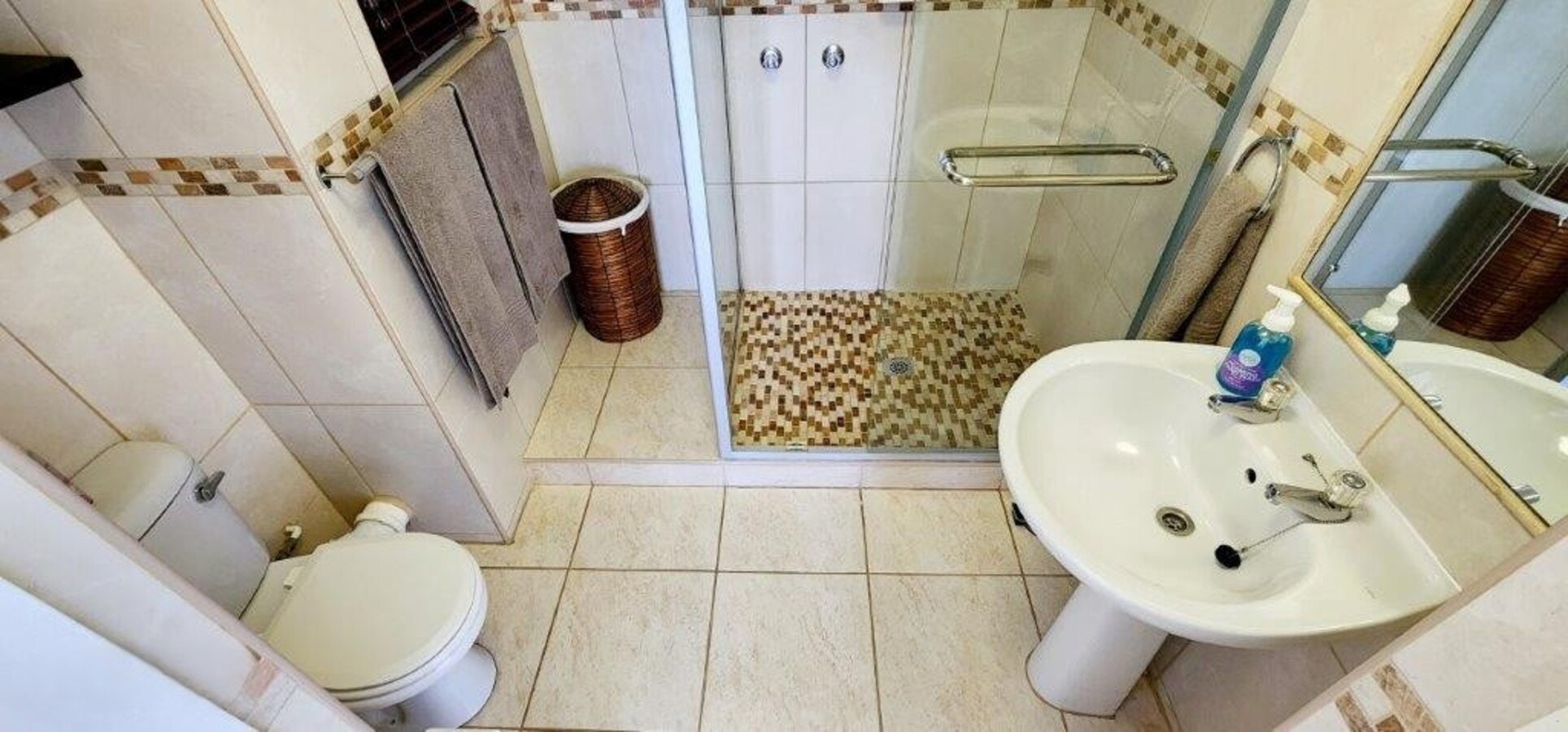 The kitchen is equipped with a fridge-freezer, stove, oven, microwave, cutlery and crockery, tea- and coffee-making facilities and a breakfast bar with stools. A washing machine and dishwasher are available for the guests’ convenience. The living room is furnished with comfortable couches and a Smart TV with a DStv decoder. Access to Wi-Fi is available.