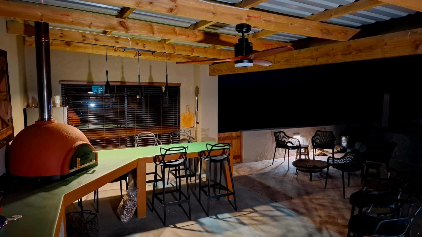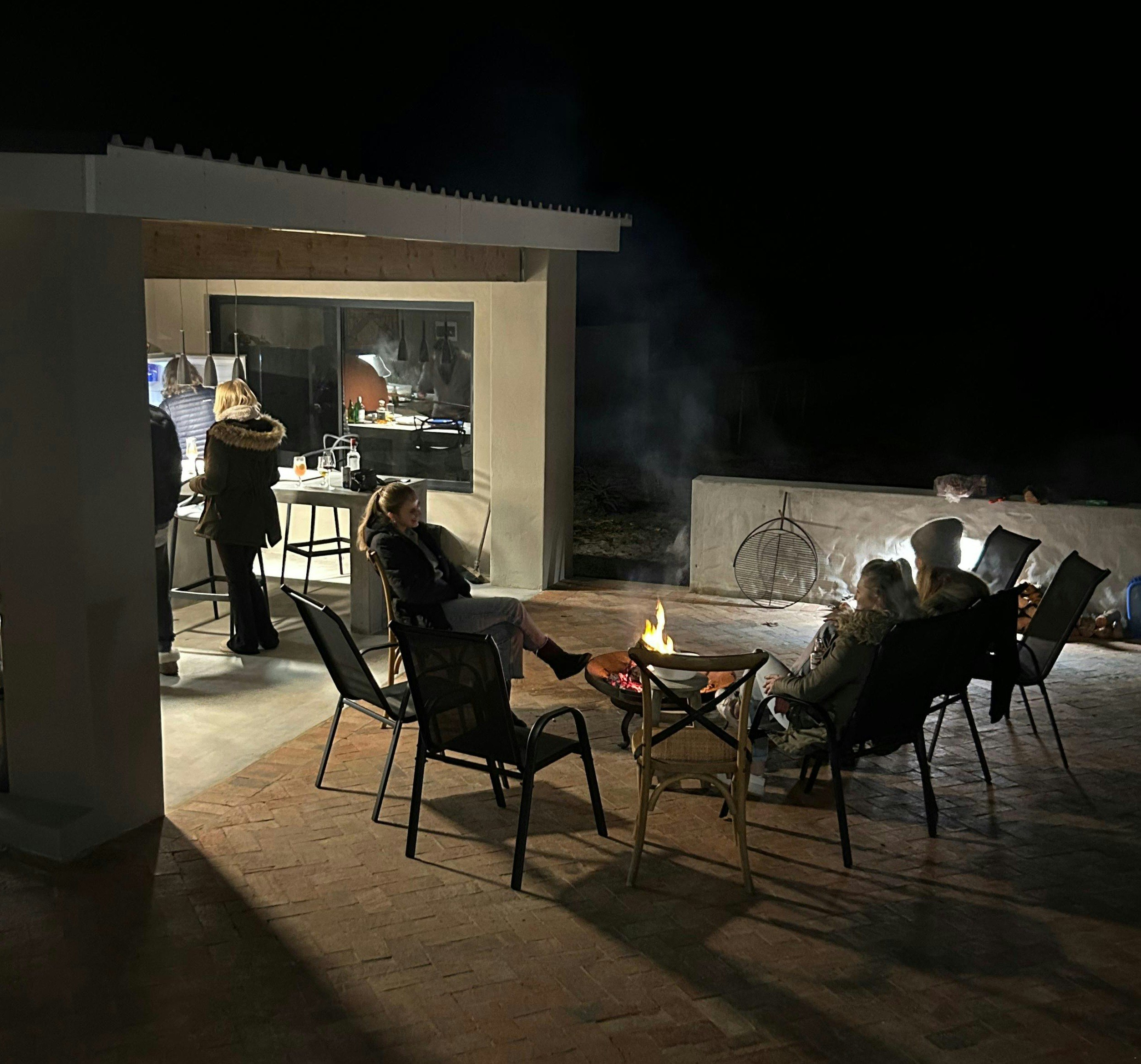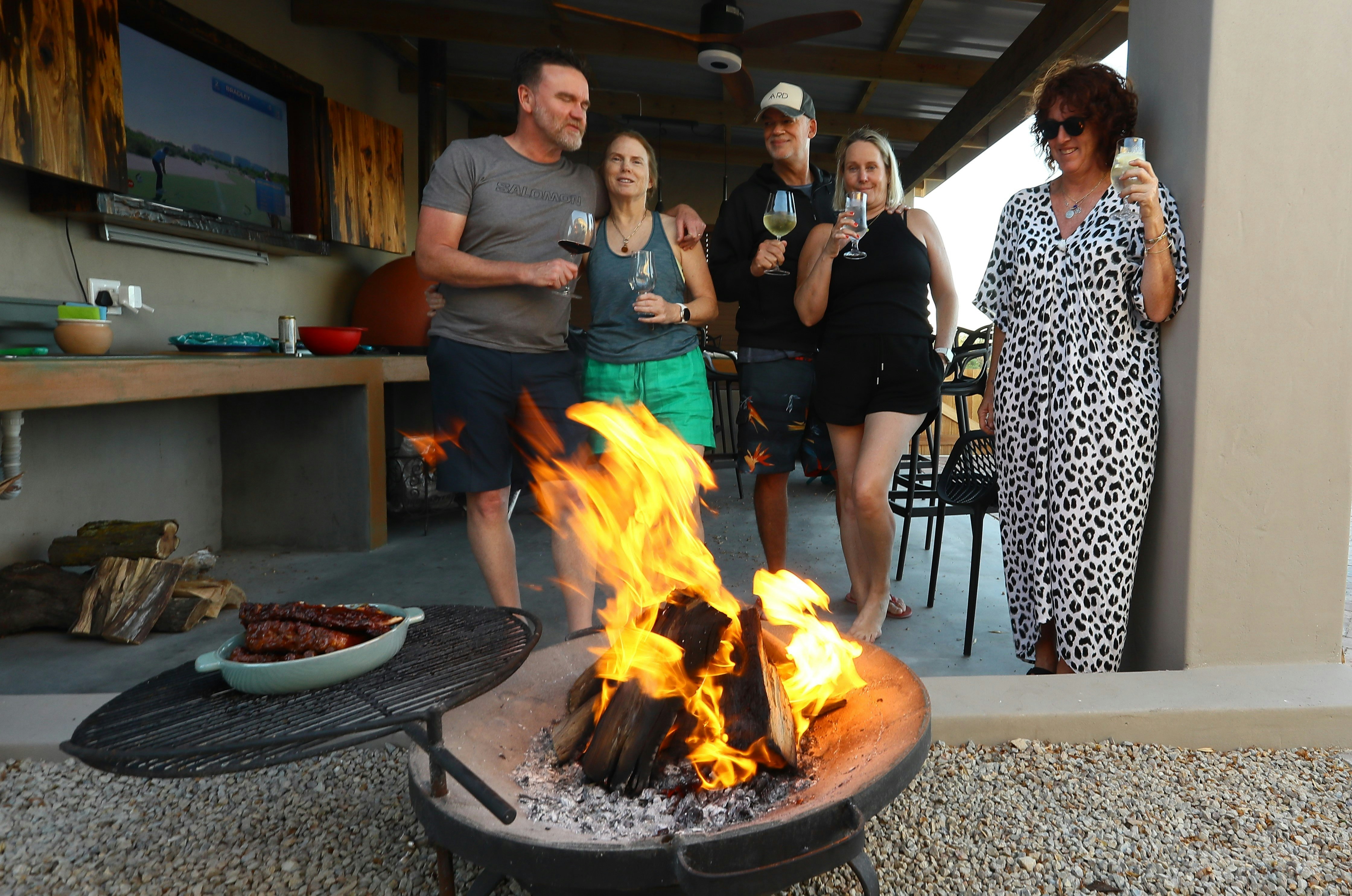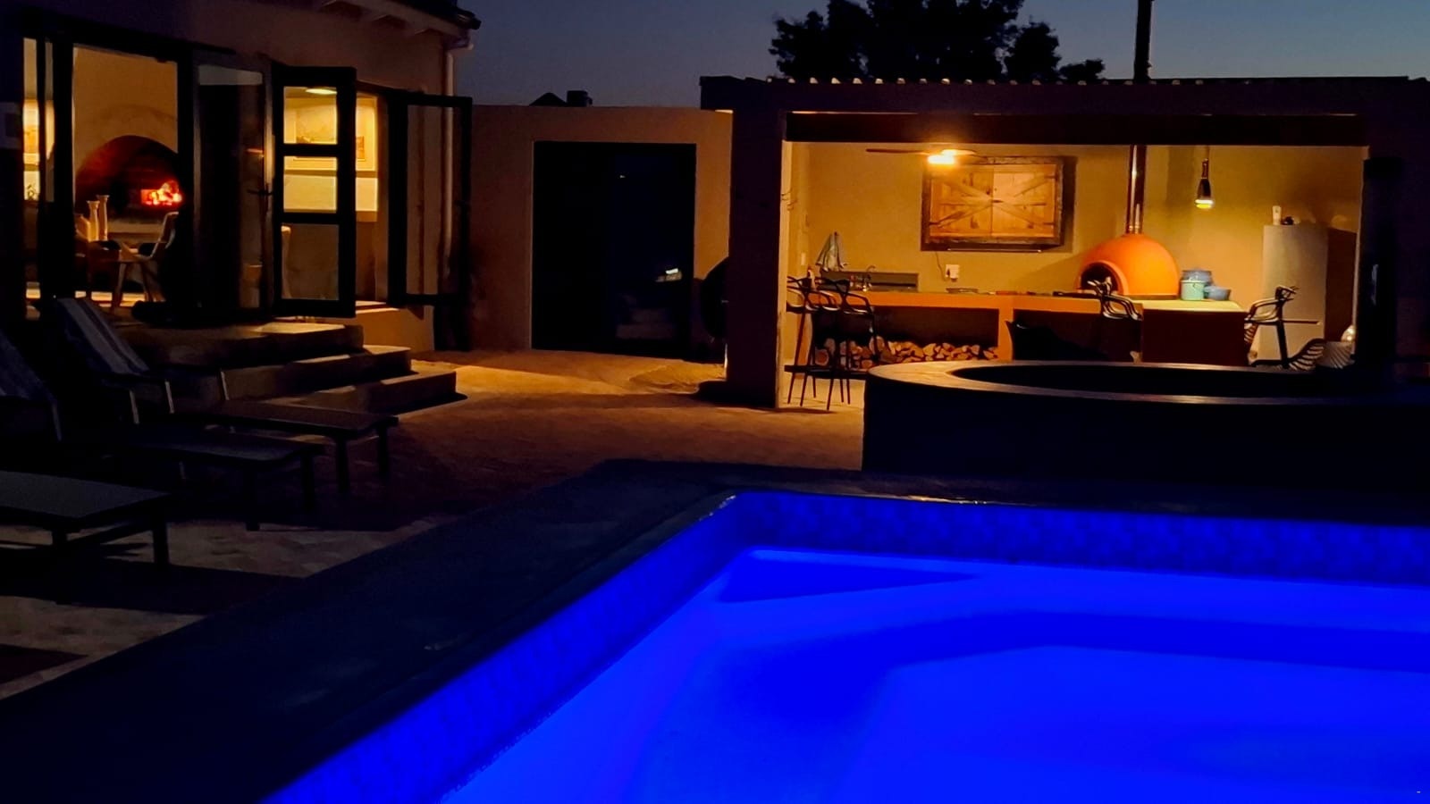 Additional features include an outdoor kitchen with a wood-fired pizza oven, a braai pit, a Weber, a Kol Kol hot tub, a swimming pool, loungers, and umbrellas. A Smart TV with Netflix, DStv, and YouTube is available.