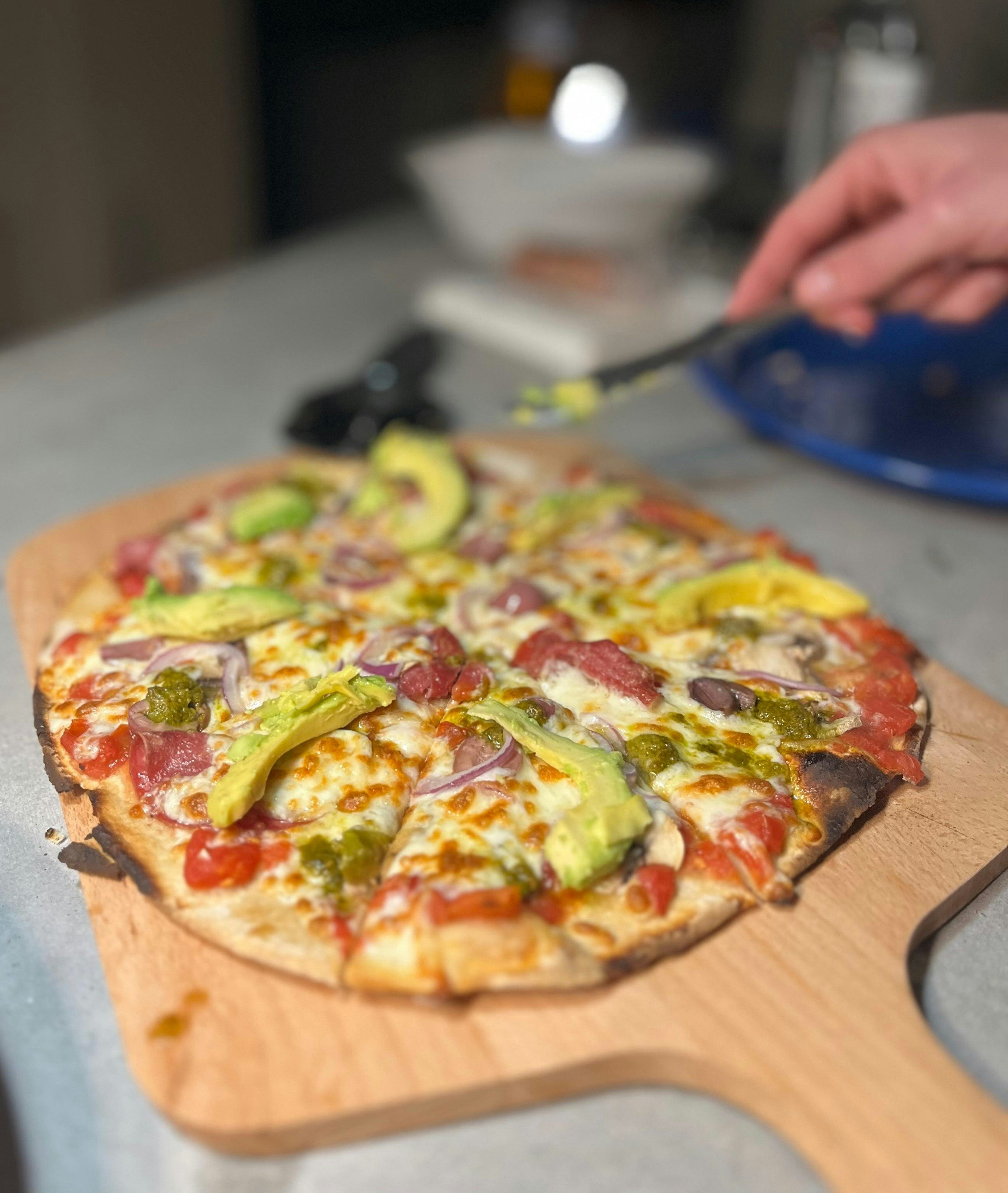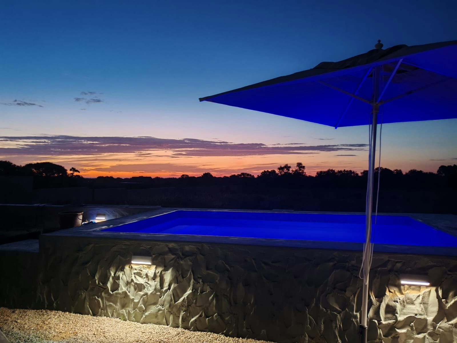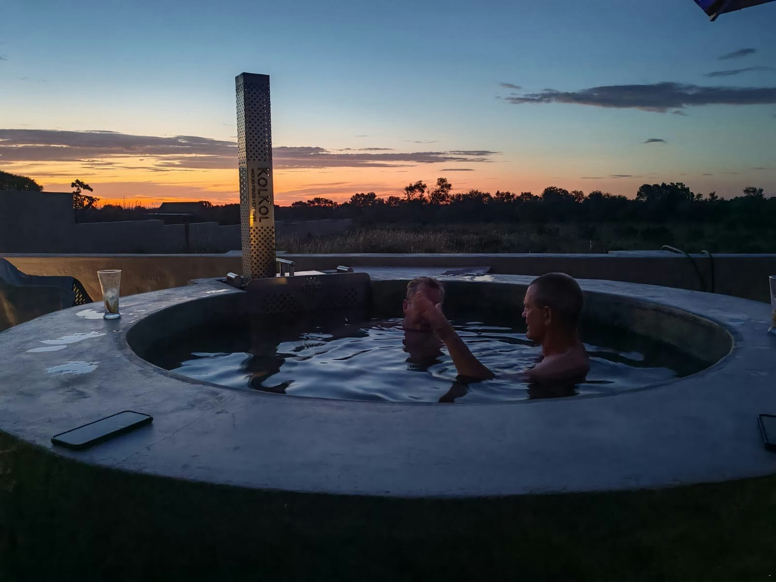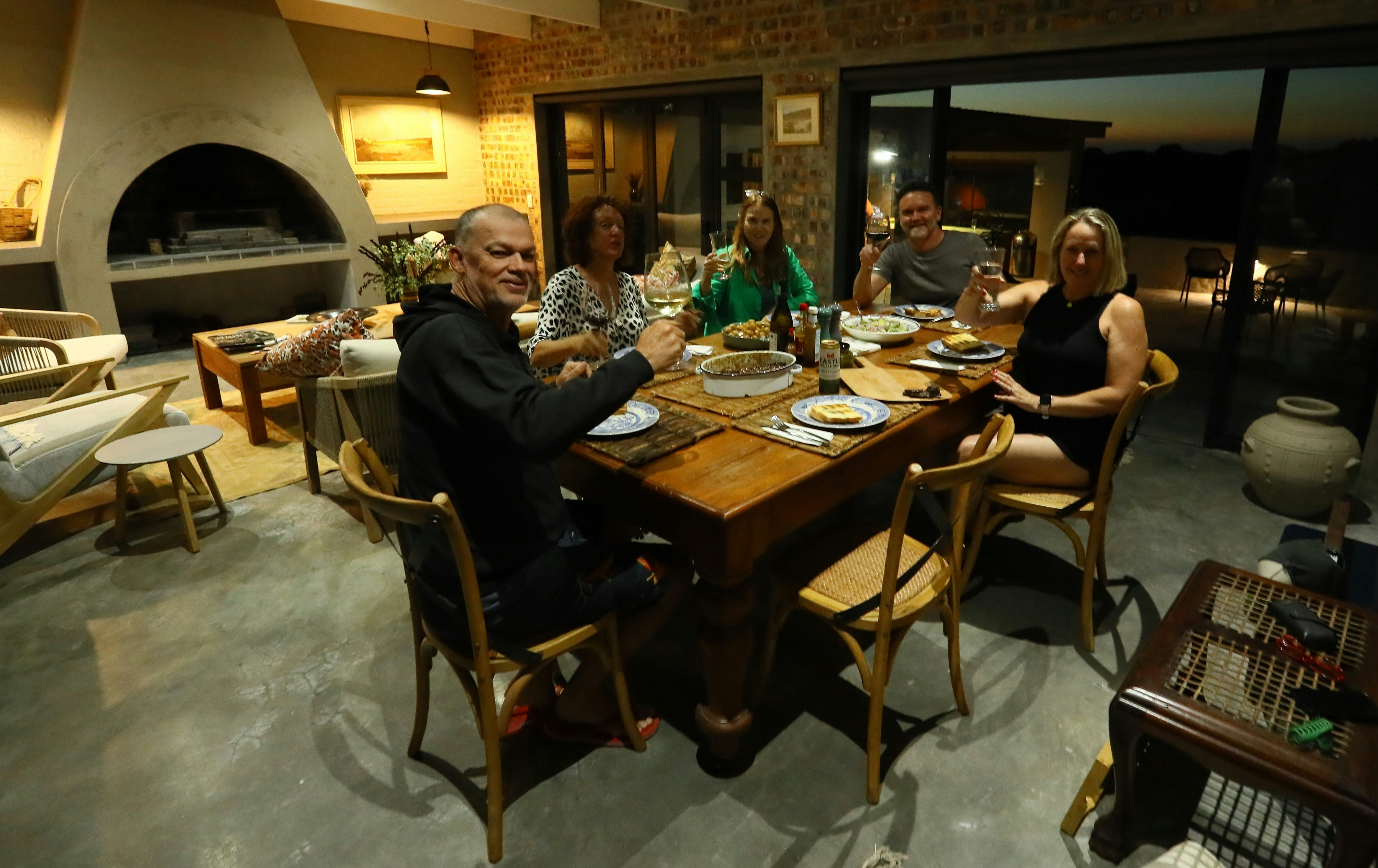 Additional features include an outdoor kitchen with a wood-fired pizza oven, a braai pit, a Weber, a Kol Kol hot tub, a swimming pool, loungers, and umbrellas. A Smart TV with Netflix, DStv, and YouTube is available.