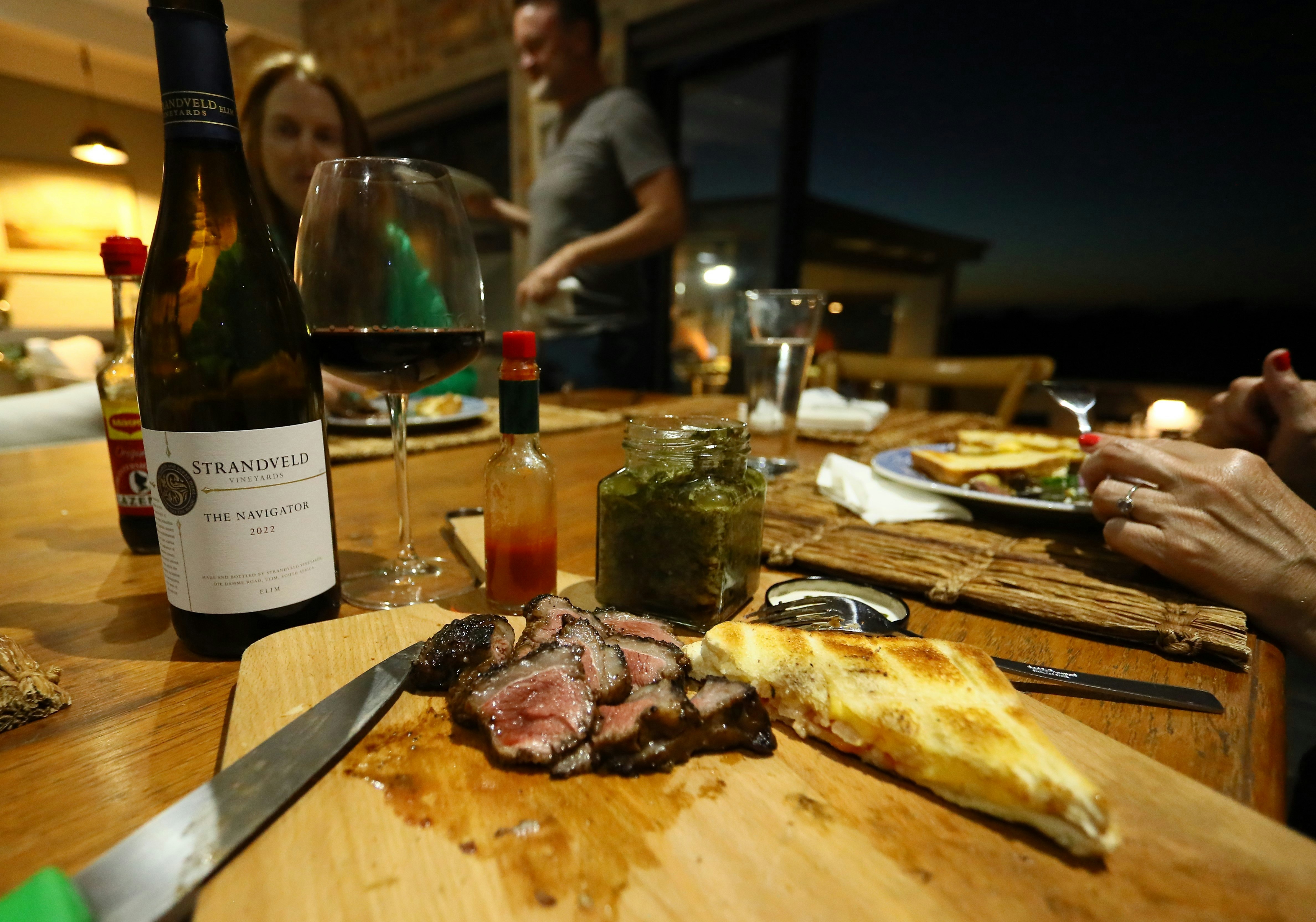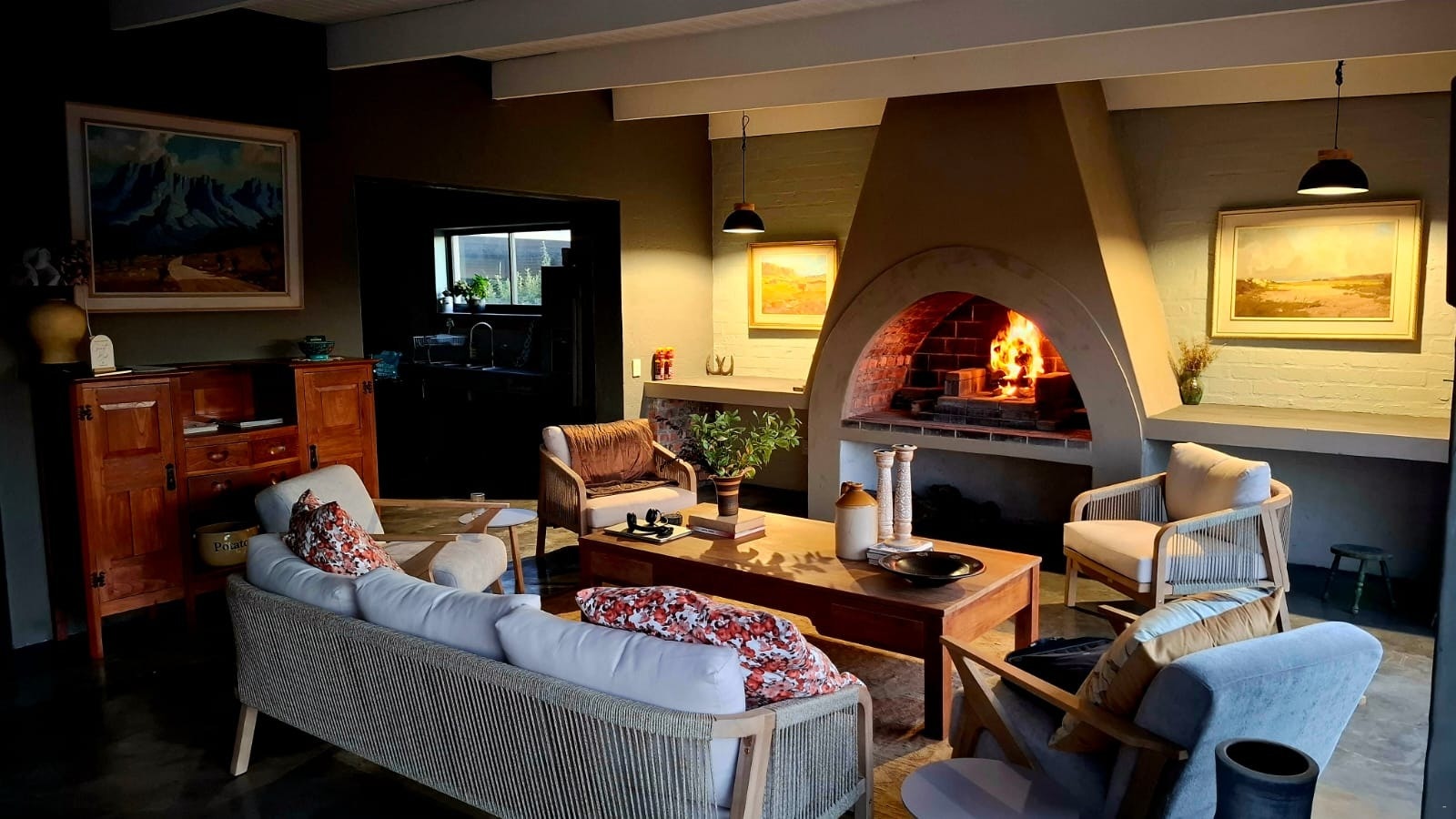 The kitchen is fitted for self-catering and includes a gas stove, oven, fridge-freezer, microwave, filtered water system, cutlery, and crockery. A separate scullery is fitted with a dishwasher, washing machine, and tumble dryer. The open-plan living area offers an anthracite stove for cold evenings, an indoor braai (weather permitting), seating, and Wi-Fi.