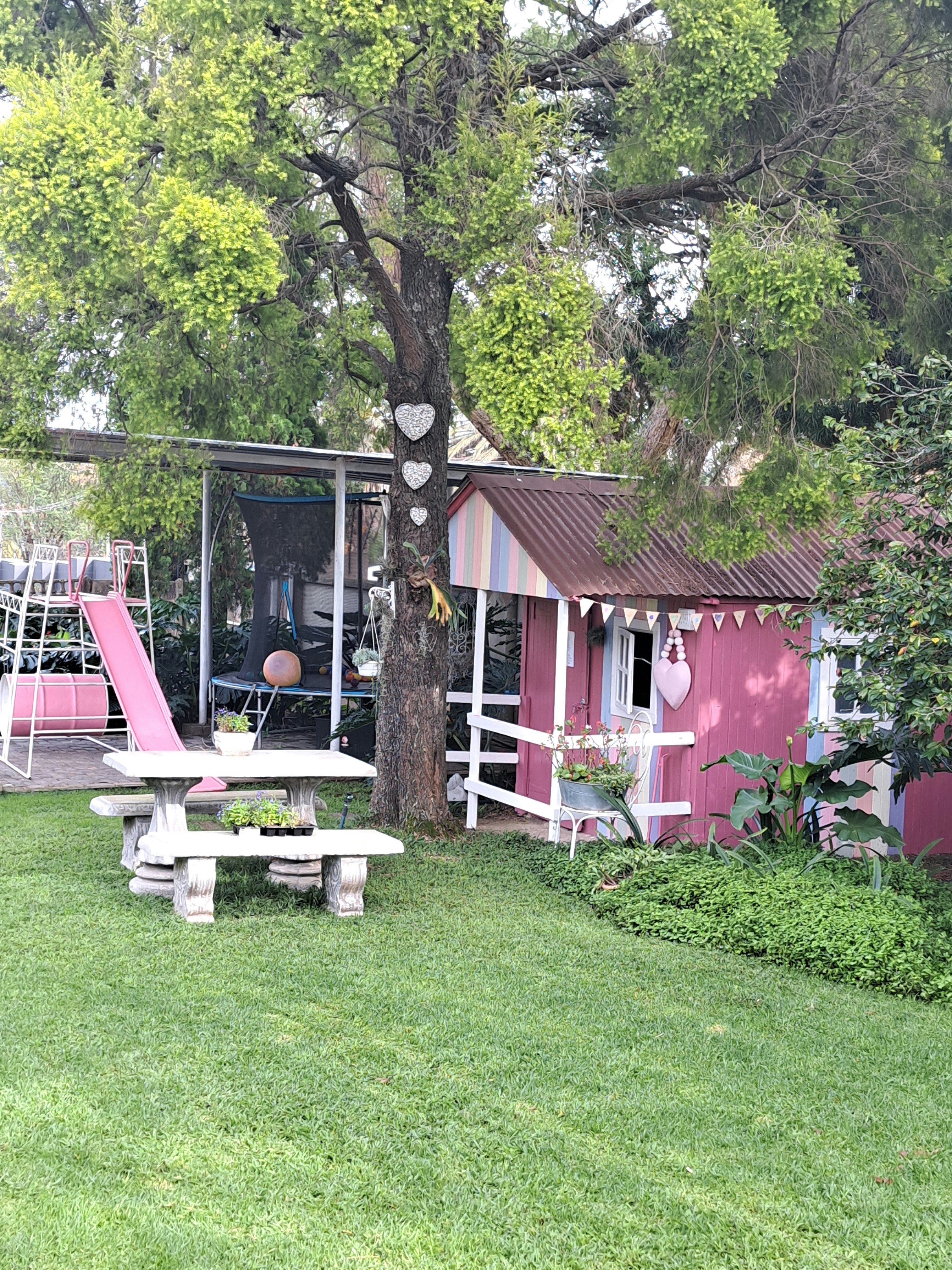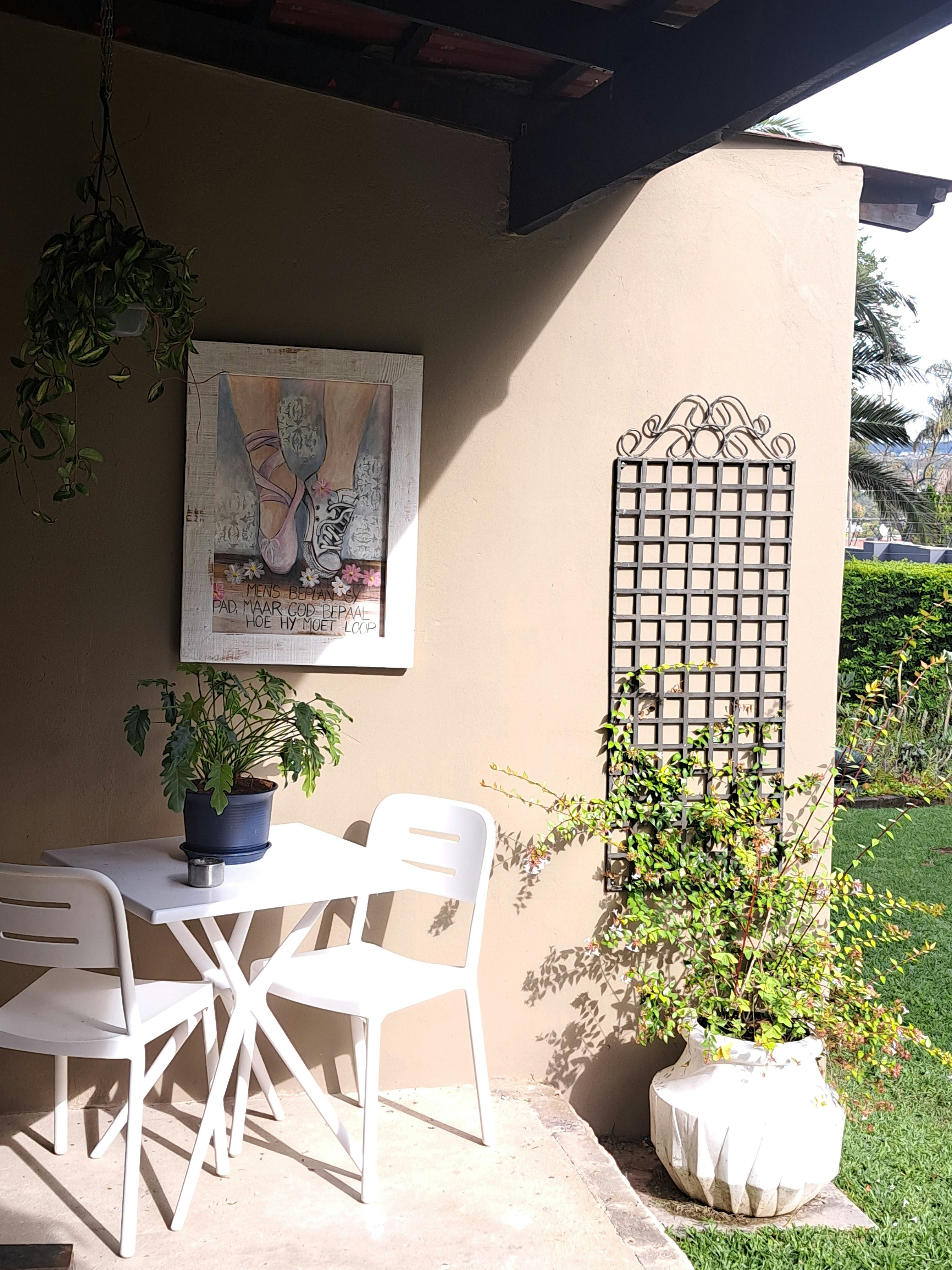 The large garden offers a tranquil space for relaxation and includes braai facilities and a child-safe swimming pool. Battery-powered lighting and a generator ensure comfort during load-shedding. Secure undercover parking is available, and breakfast and lunch packs can be arranged upon request.