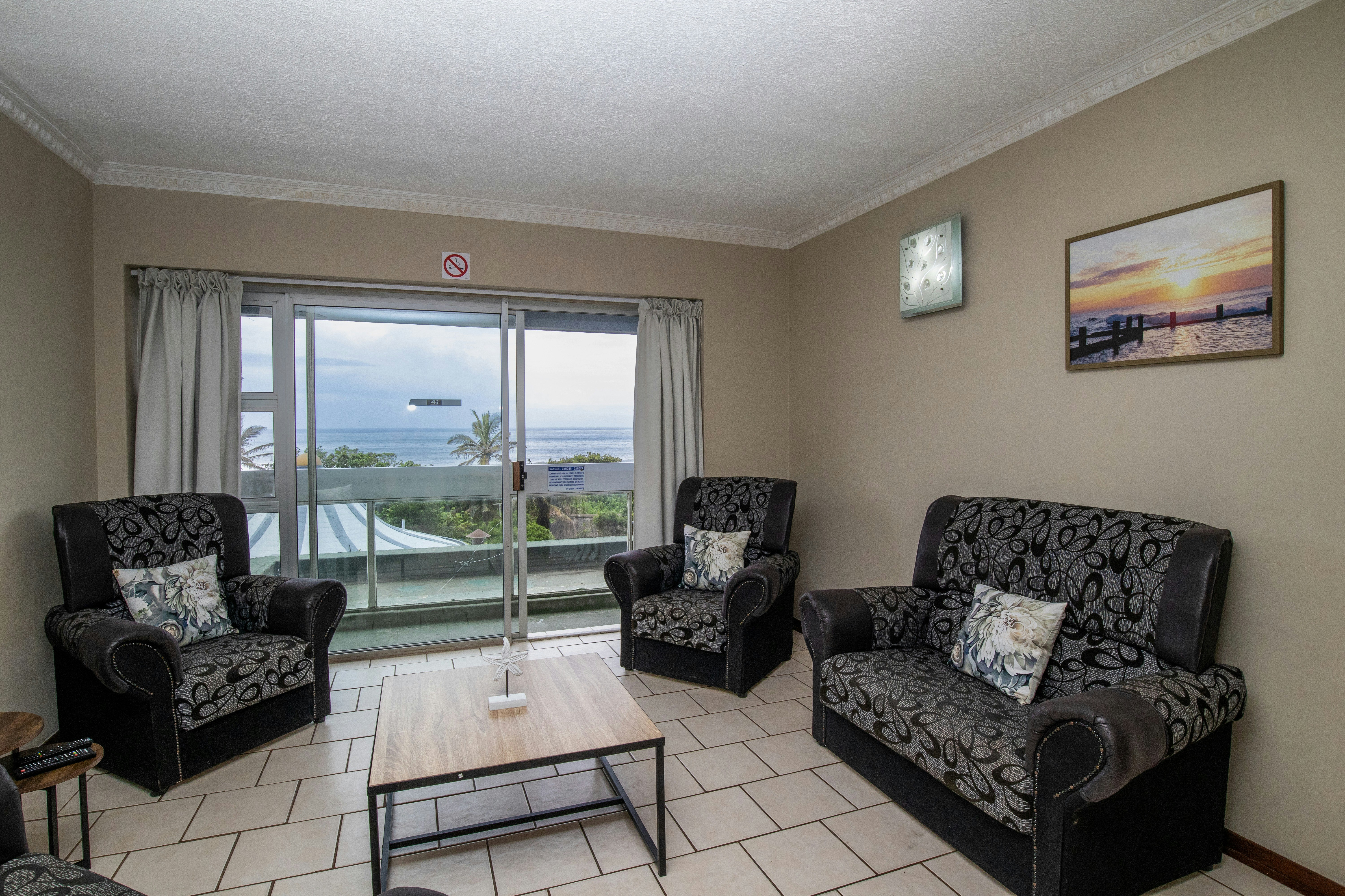 The open-plan living area offers comfortable seating, a TV, a dining table, and a fully equipped kitchen. The kitchen includes a fridge-freezer, stove, oven, microwave, and coffee- and tea-making facilities. Leading out from the living area, guests step out onto the balcony and enjoy the beautiful sea views. The complex also offers a communal swimming pool, braai facilities, and on-site parking.