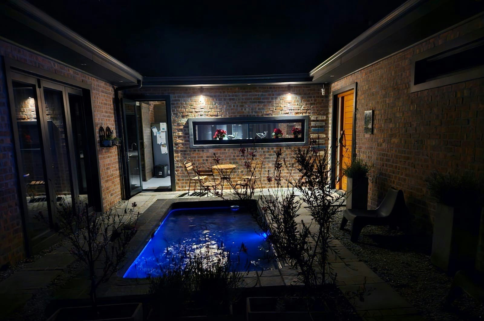 Outside, there is a shaded patio with outdoor seating and a built-in braai. Additionally, a splash pool is available for guests to enjoy. Secure onsite carport parking is provided, and the property is conveniently located close to restaurants and convenience stores.