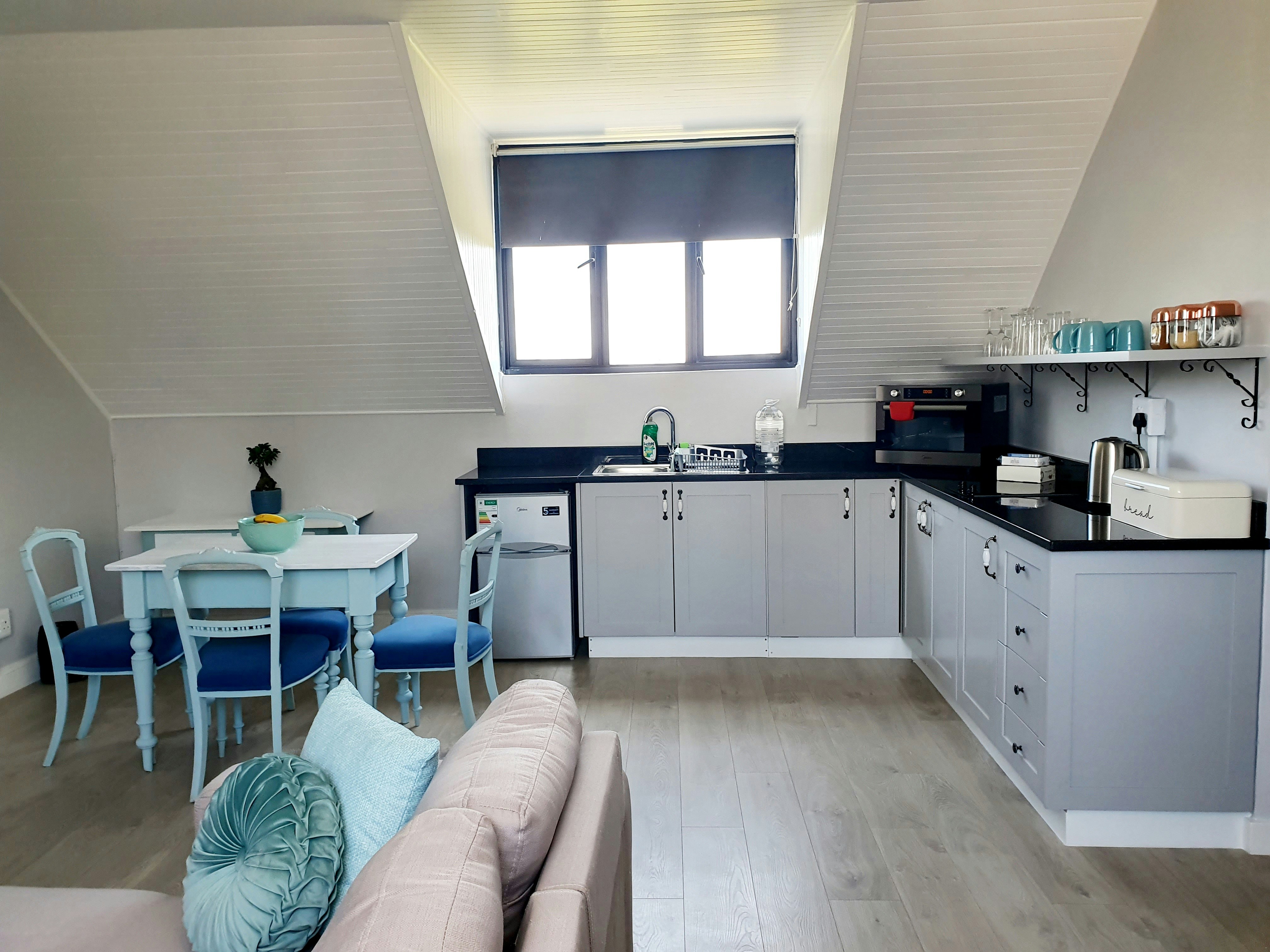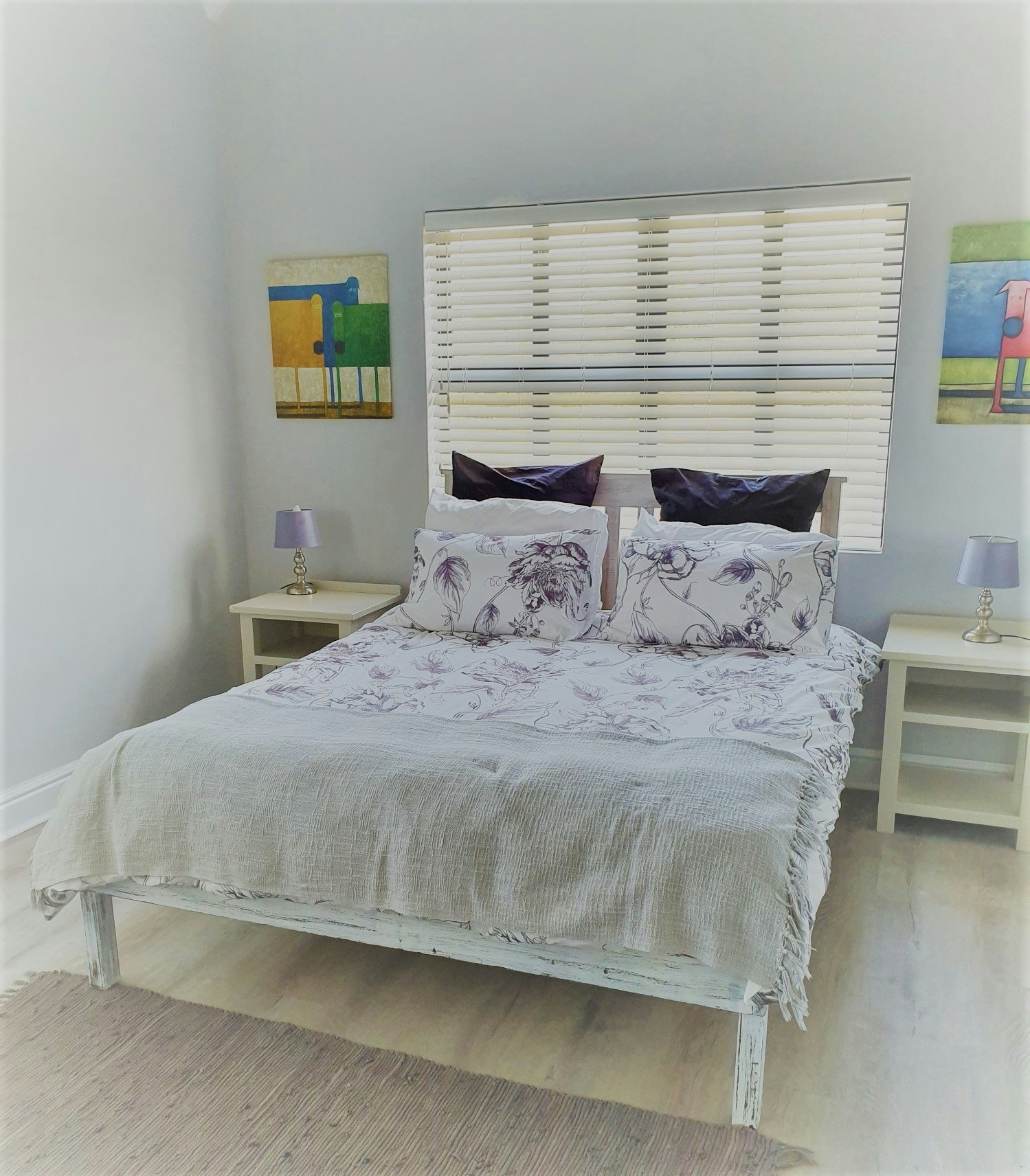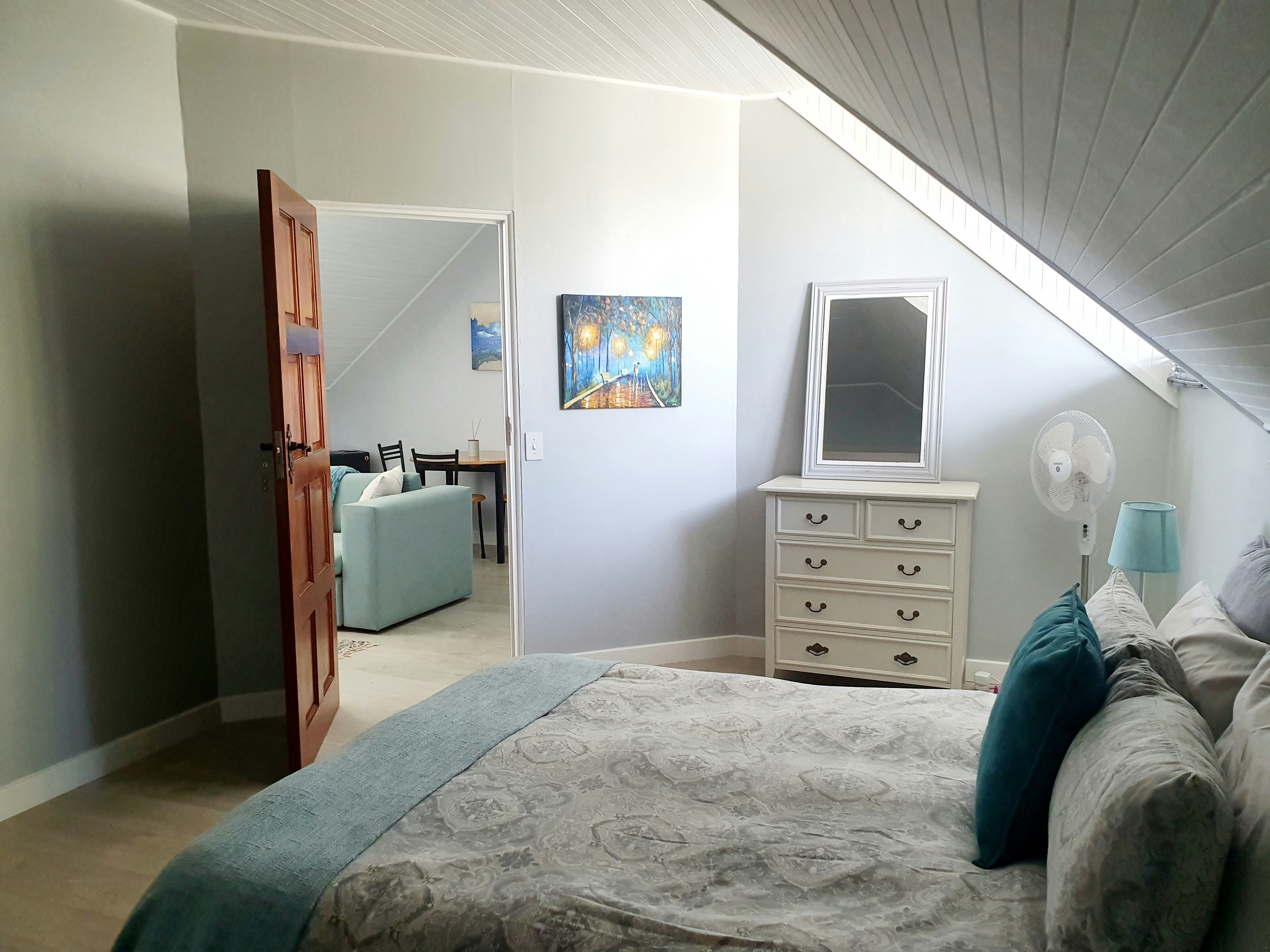 The Sky Loft Apartment is accessed by an enclosed flight of stairs and comprises a large bedroom with a queen size bed and an en-suite bathroom with a shower. There is no balcony, but there is an outdoor braai area with a spectacular view of the dam and fynbos. The guests have access to the courtyard pool area where they can relax, swim or read. Premium DStv package and full Wi-Fi at all times, even during load-shedding. Access to pool and parking right at your doorstep. A child can be accomodated on the sleeper couch at an additonal cost per night calculated according to nights booked.