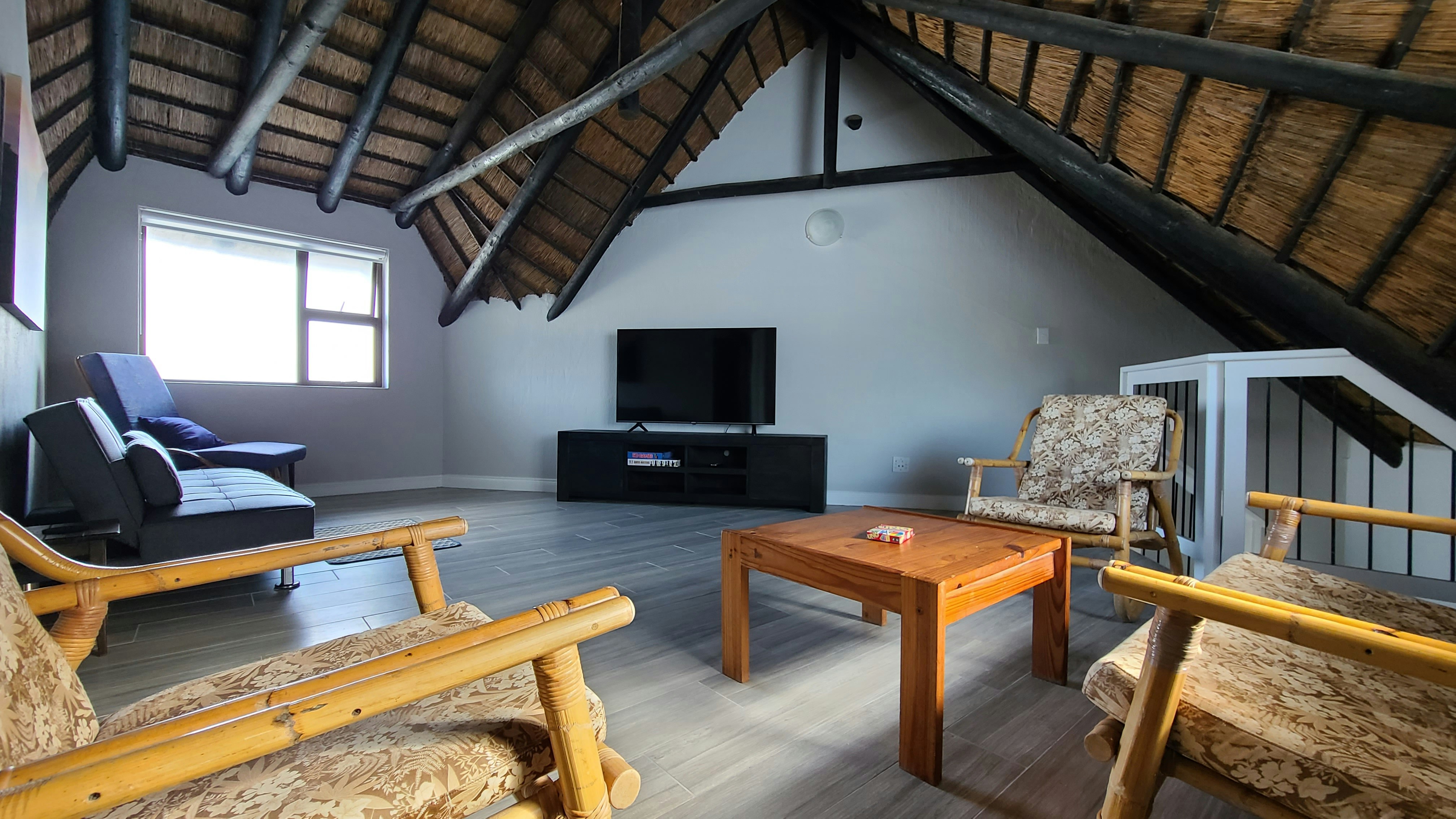 There is a lounge area with comfortable seating and leads to an indoor braai area with stacking doors that lead onto a large balcony with lovely ocean views. Access to Netflix and free Wi-Fi is available. A cleaning service is included.