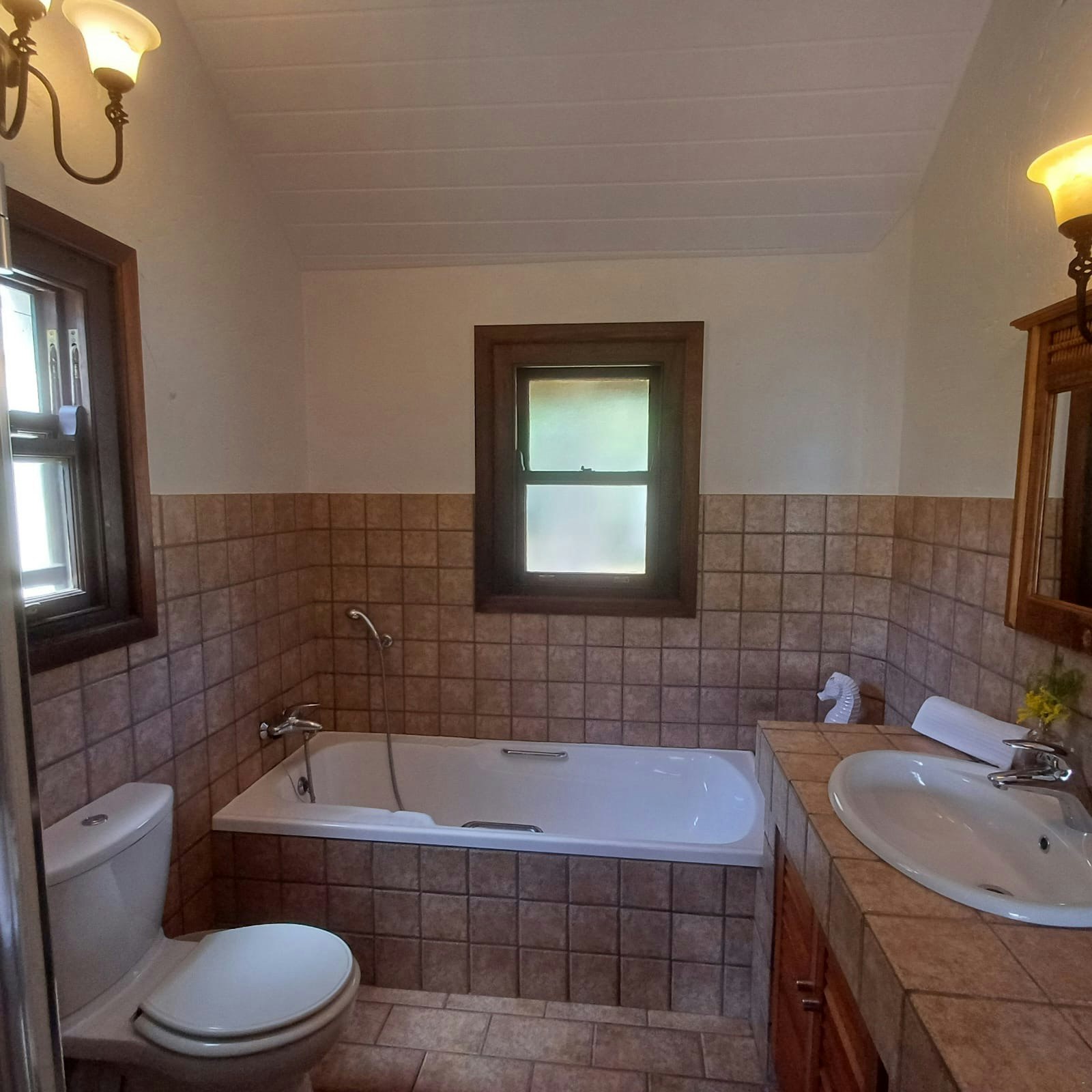 The open-plan apartment can accommodate 2 guests and is furnished with a queen-sized bed. The en-suite bathroom includes a bath, shower, and toilet, with all linen and bath towels provided.