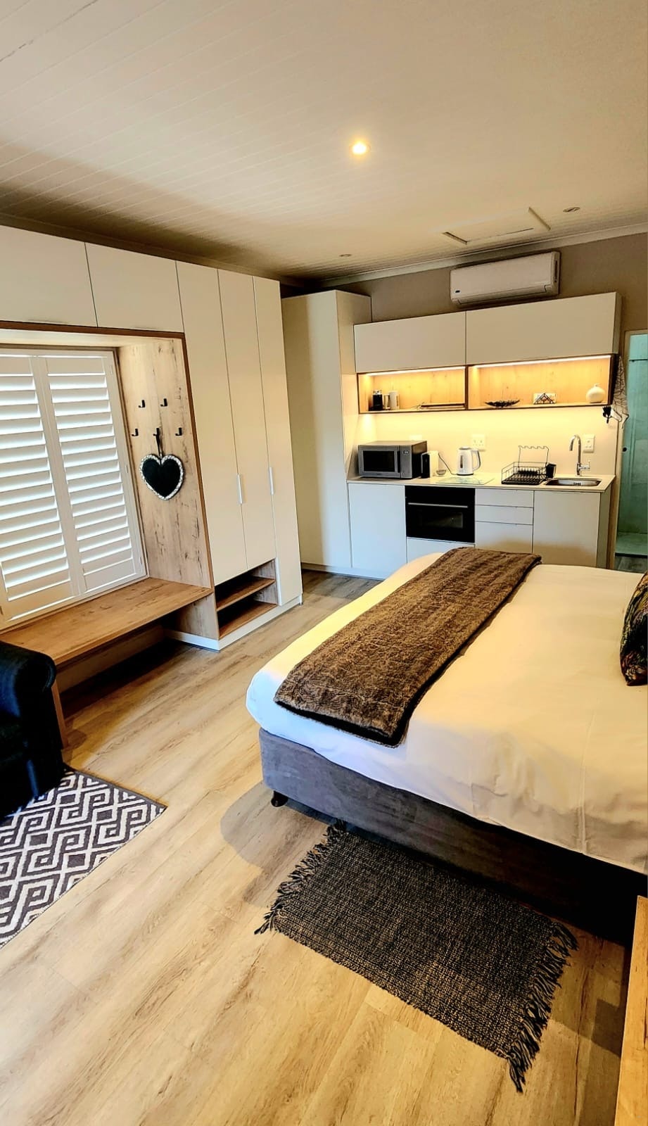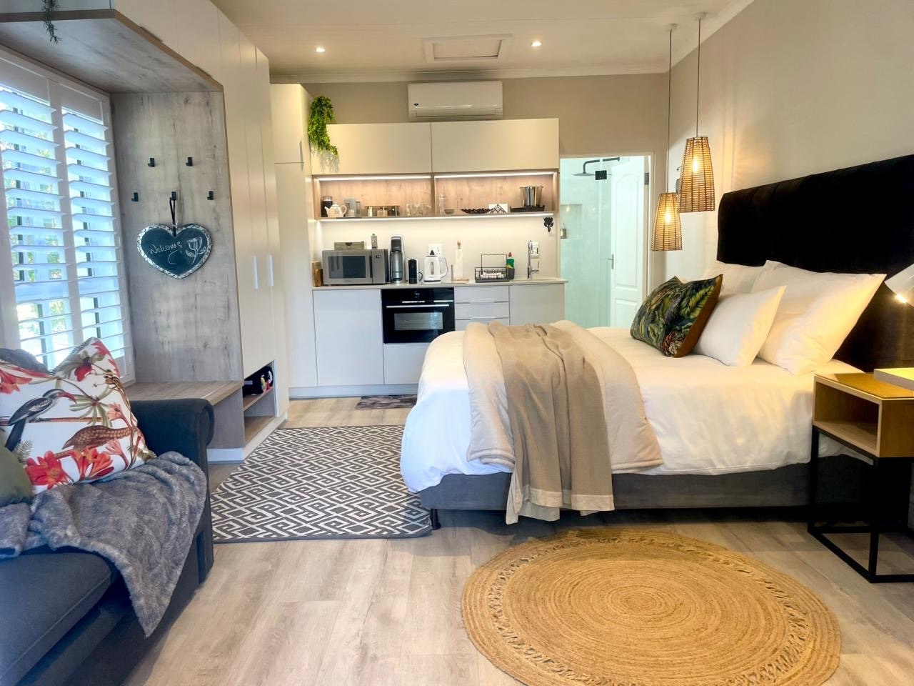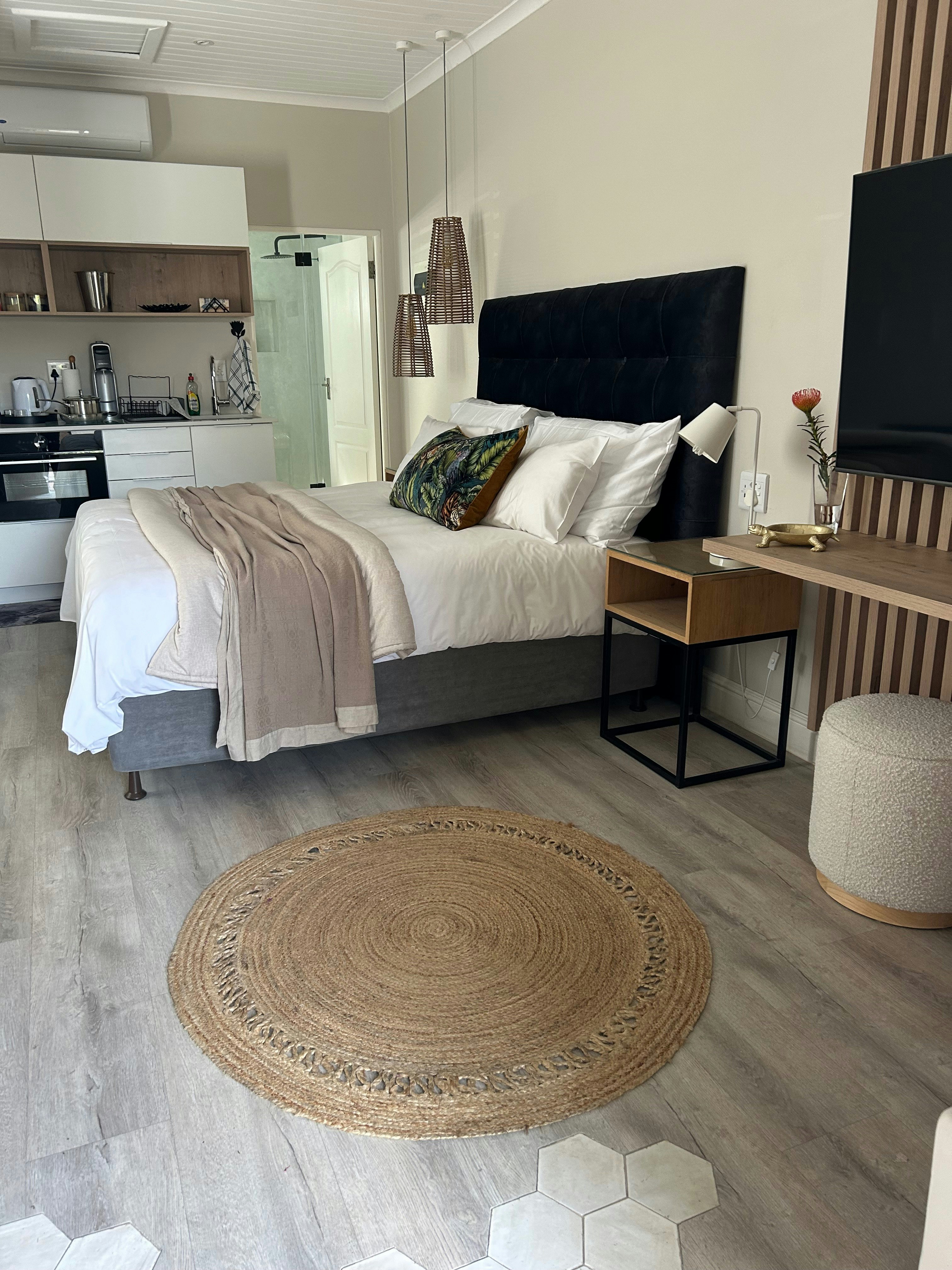 The air-conditioned studio apartment comprises a king-size bed and an en-suite bathroom with a bath, shower, toilet and basin. There is also an inverter that works during load shedding.