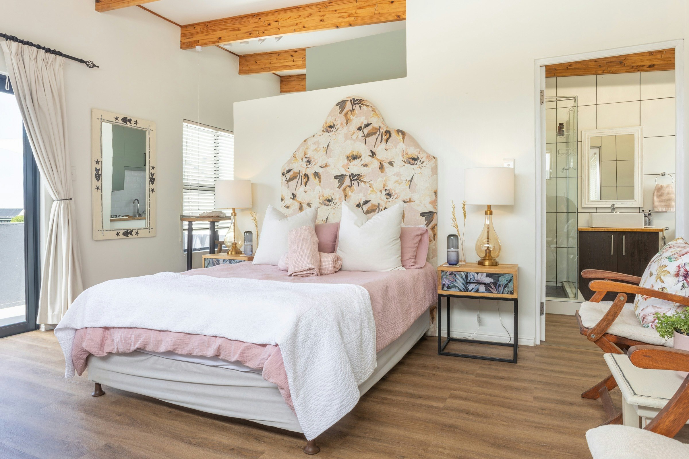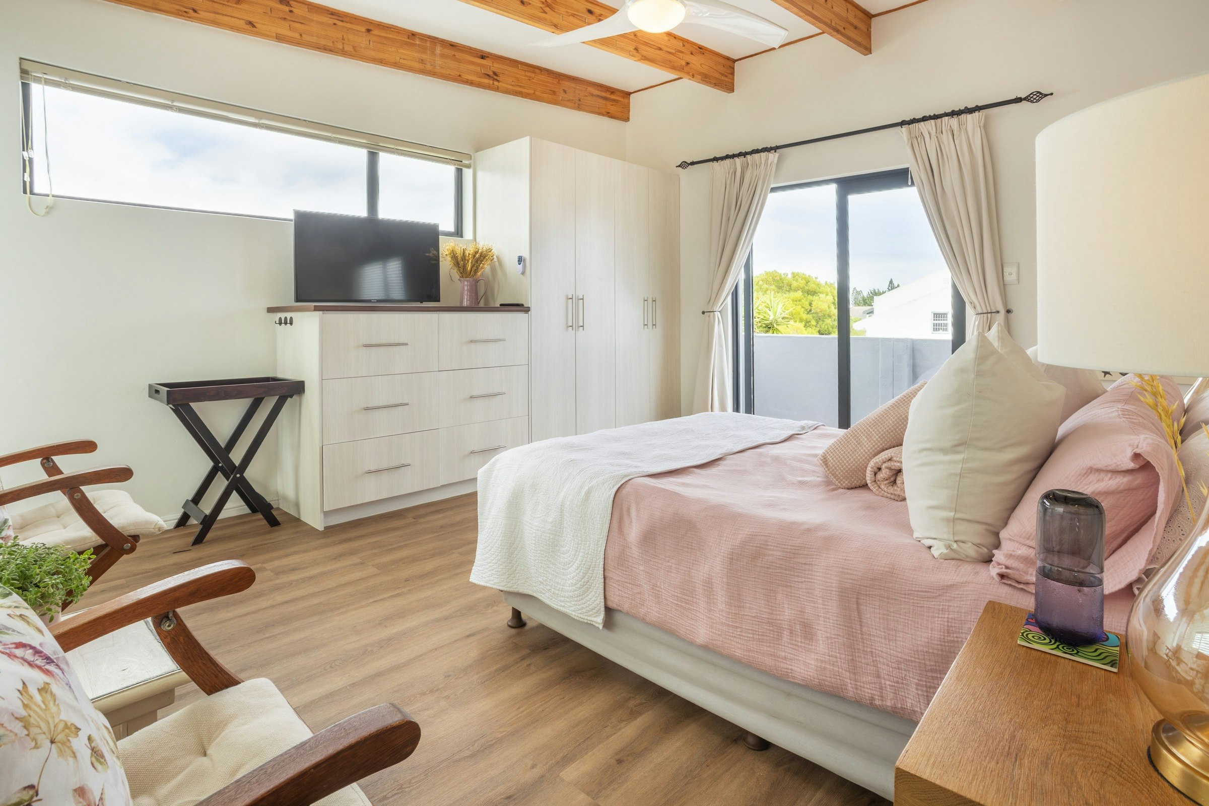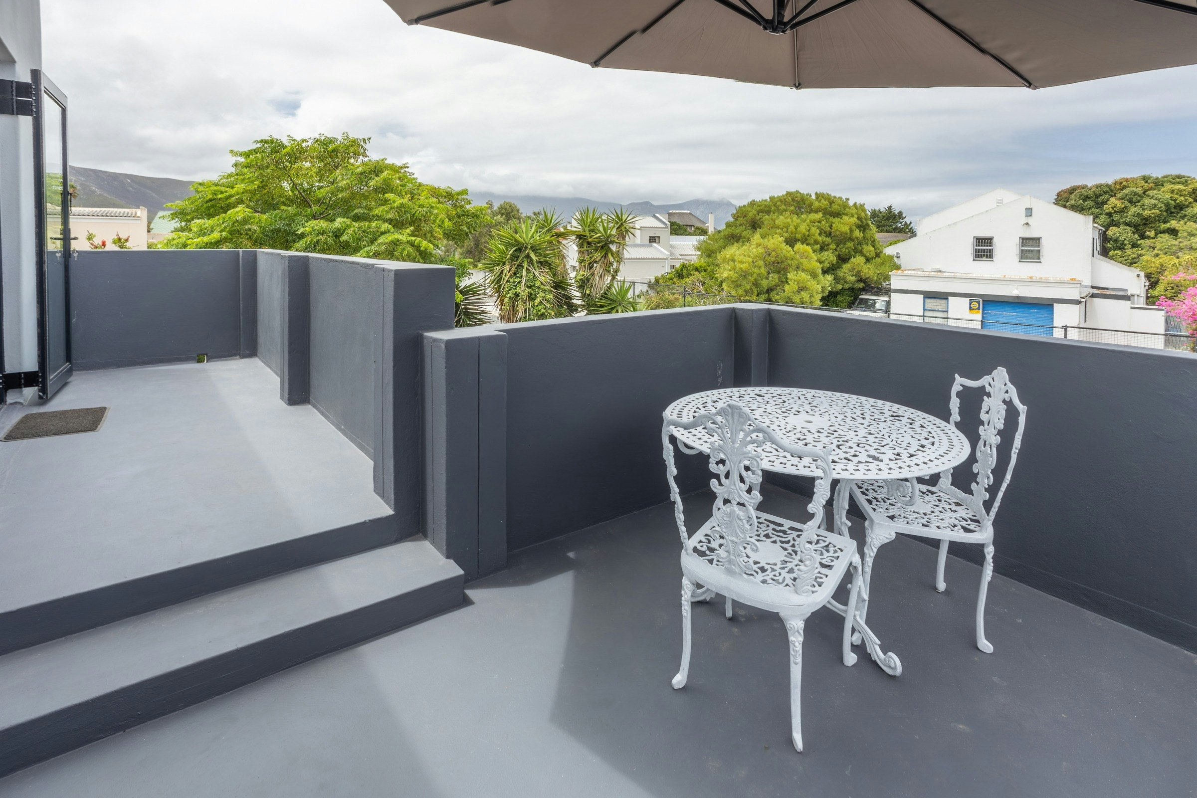 The apartment's top floor houses a spacious bedroom furnished with a comfortable double bed and has an en-suite bathroom fitted with a shower, basin, and toilet. The room features soft lighting and a panoramic view of the surrounding mountains. The large veranda, perfect for relaxing mornings or long summer evenings, is equipped with a Weber braai, making it a lovely place to enjoy a glass of wine while the sun sets over the mountains.