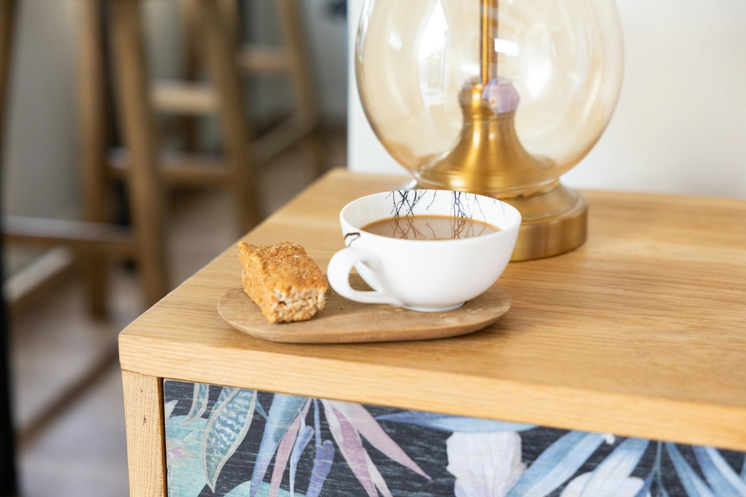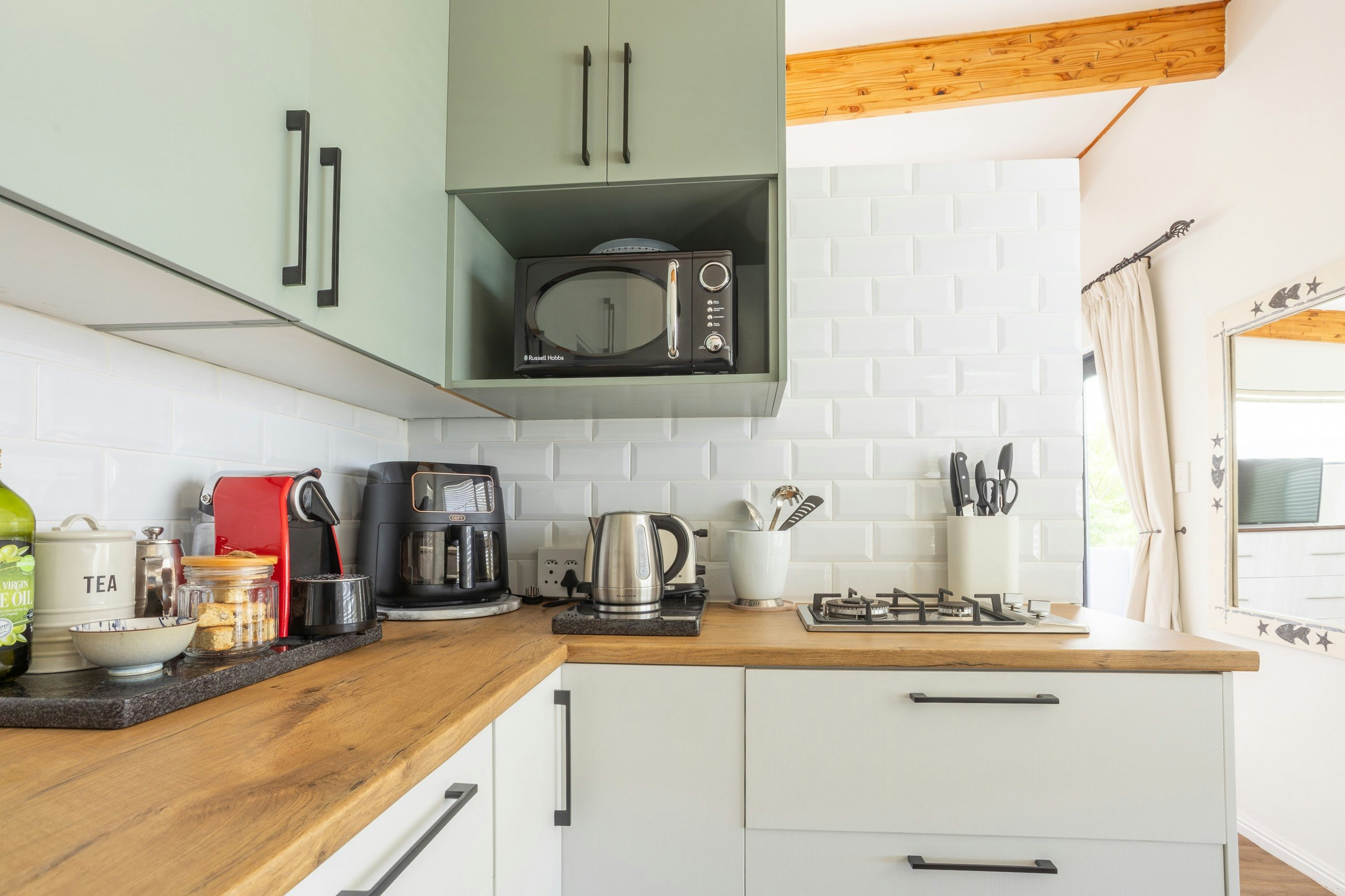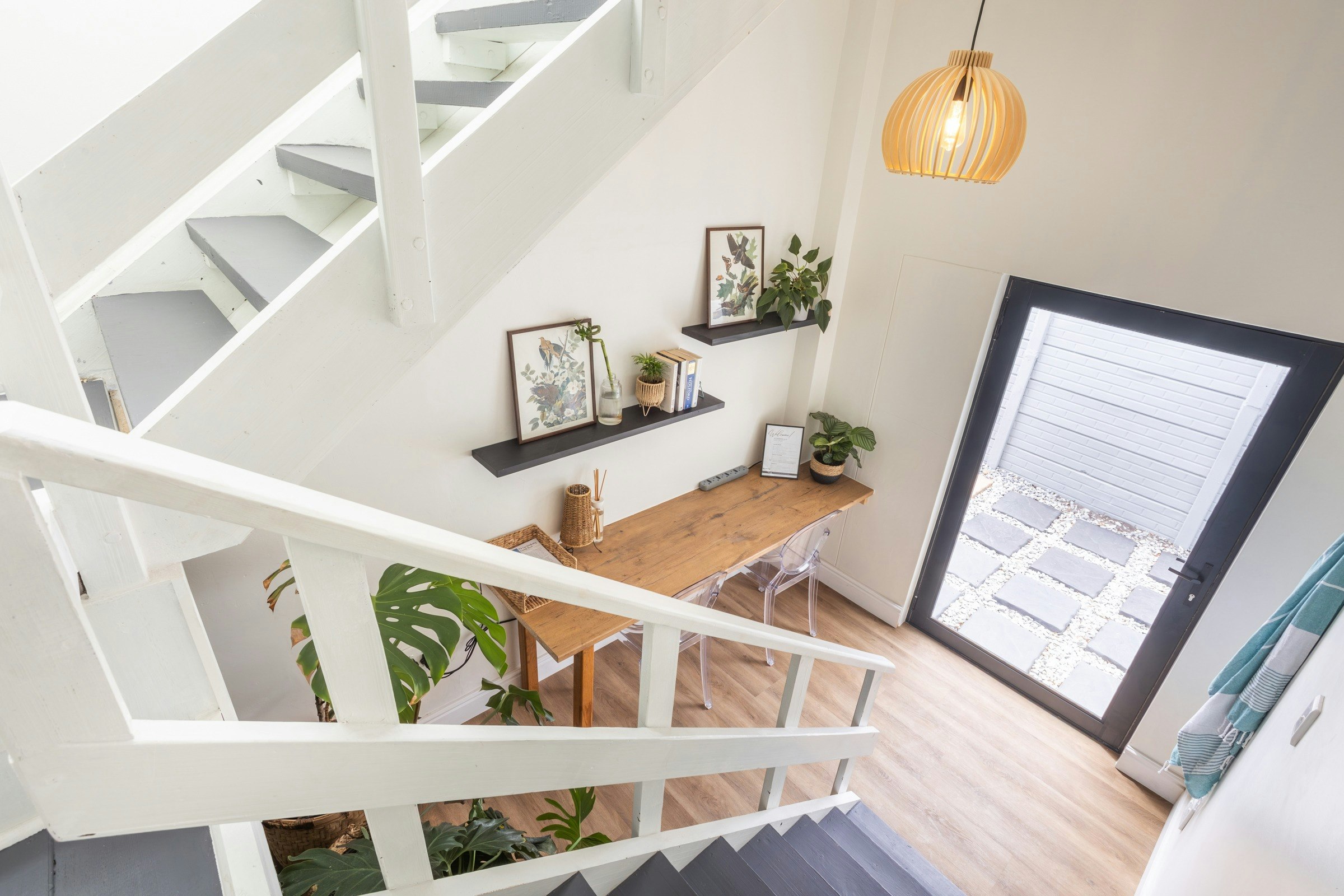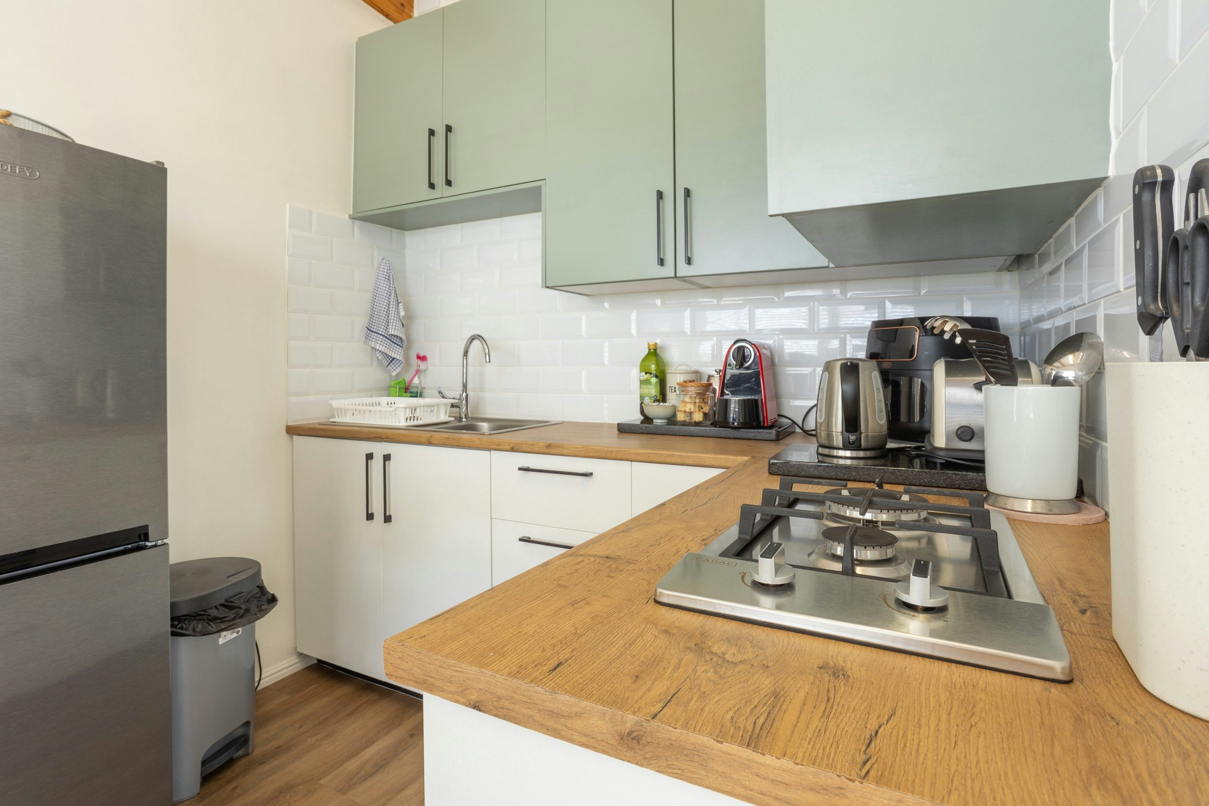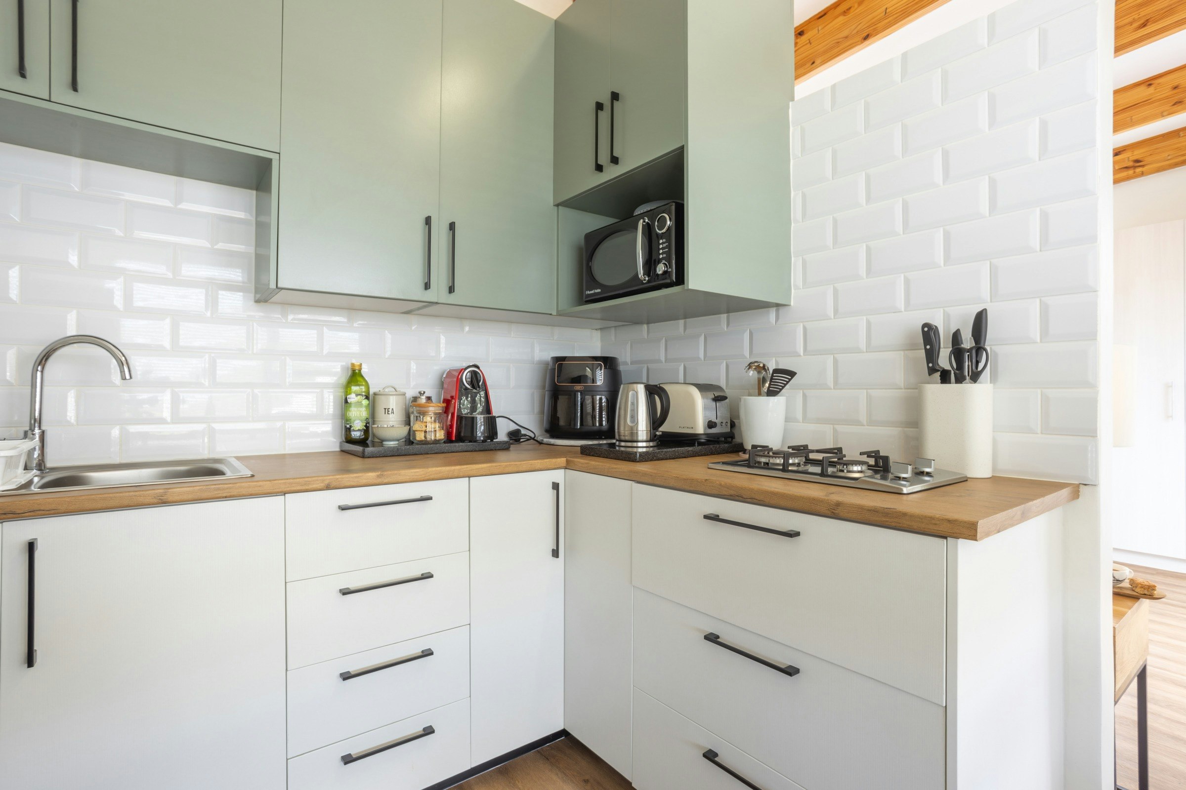 On the ground floor, there is a modern kitchen fully equipped with a fridge-freezer, gas stove, microwave, basic cutlery, crockery, and a coffee machine. It extends to the stylish living area with a comfortable workspace - ideal for digital nomads or guests who like to read or play board games in a quiet environment.