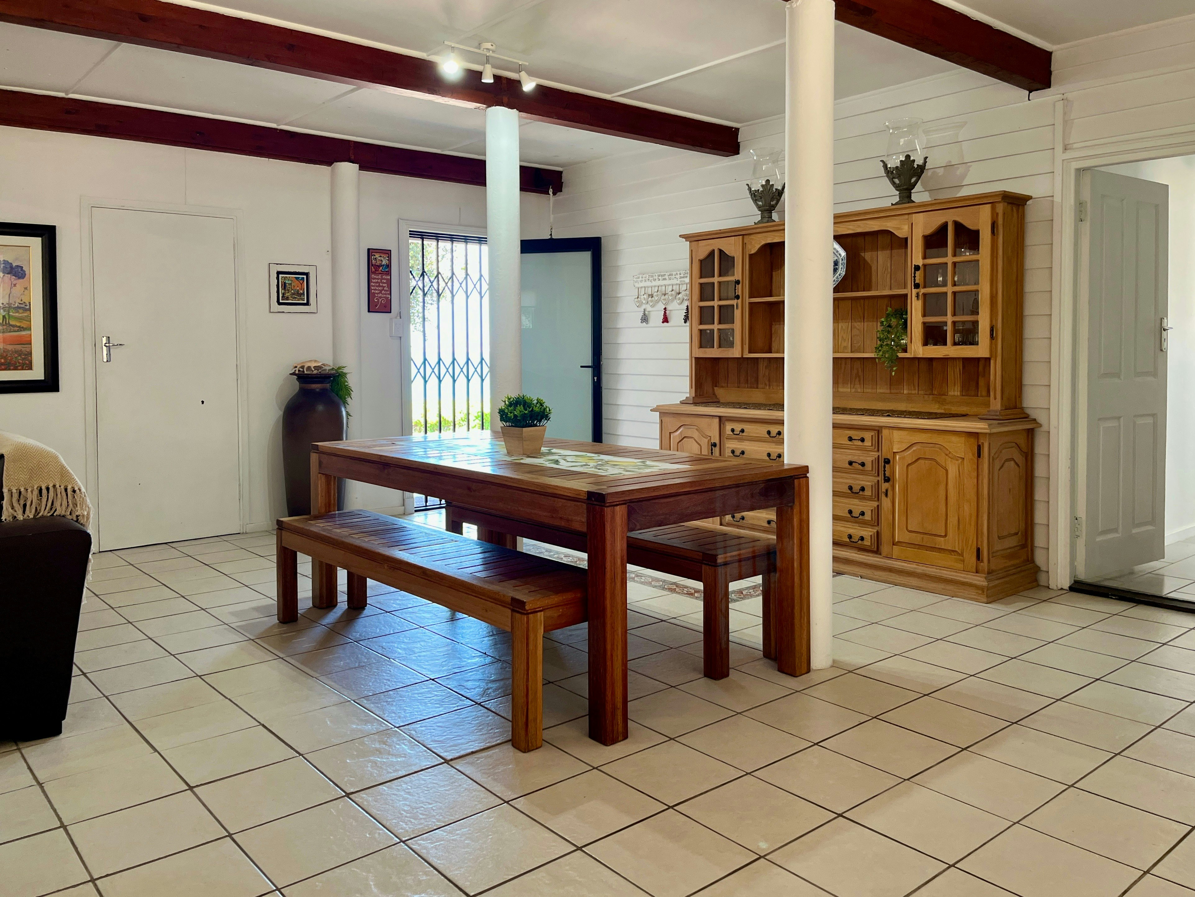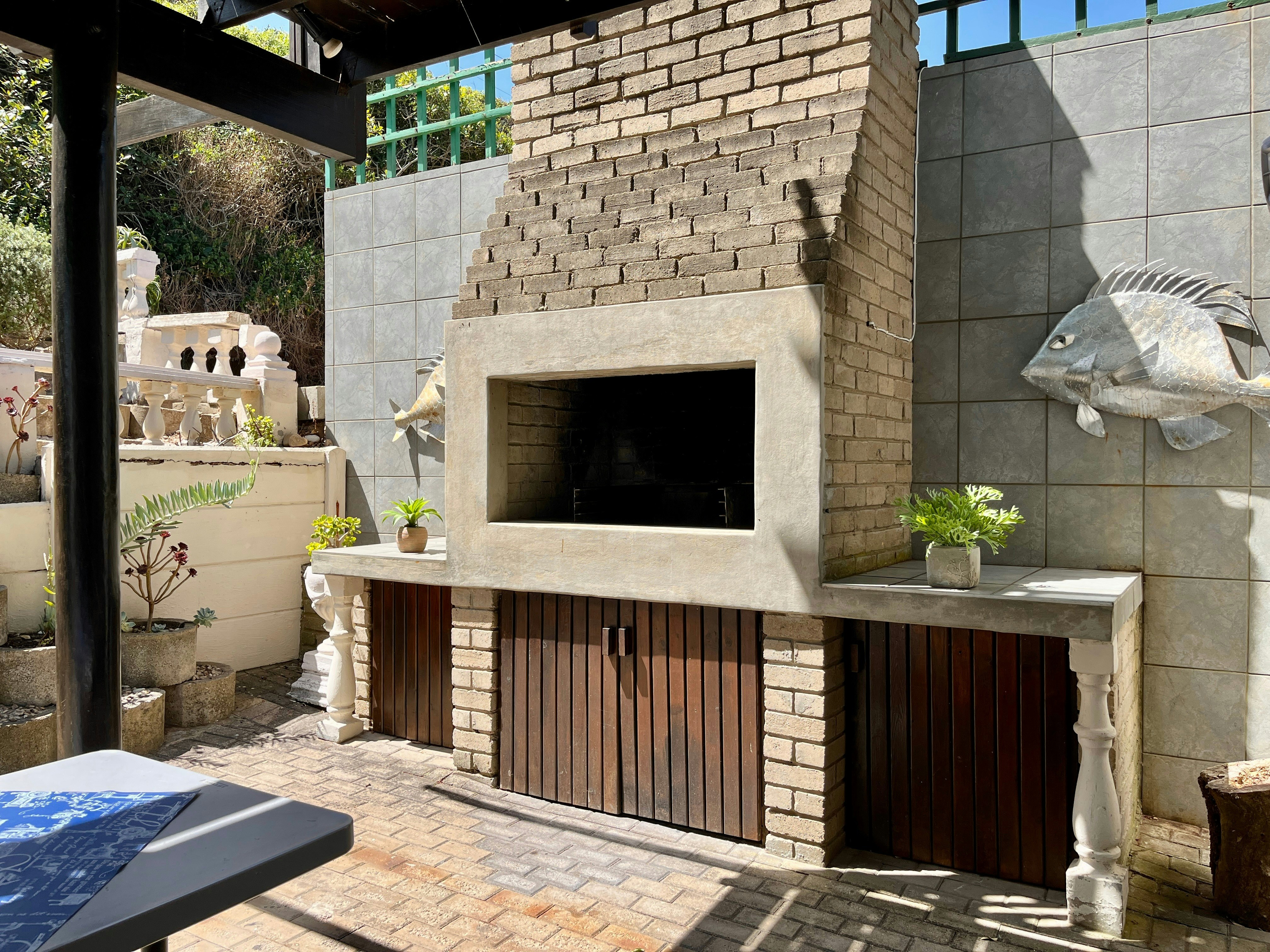 Outside, guests can enjoy a lovely deck with ocean views, as well as a patio with outdoor seating and a built-in braai. Secure garage and driveway parking are provided. The home is equipped with burglar bars, security beams, and an alarm system with 24-hour armed response.