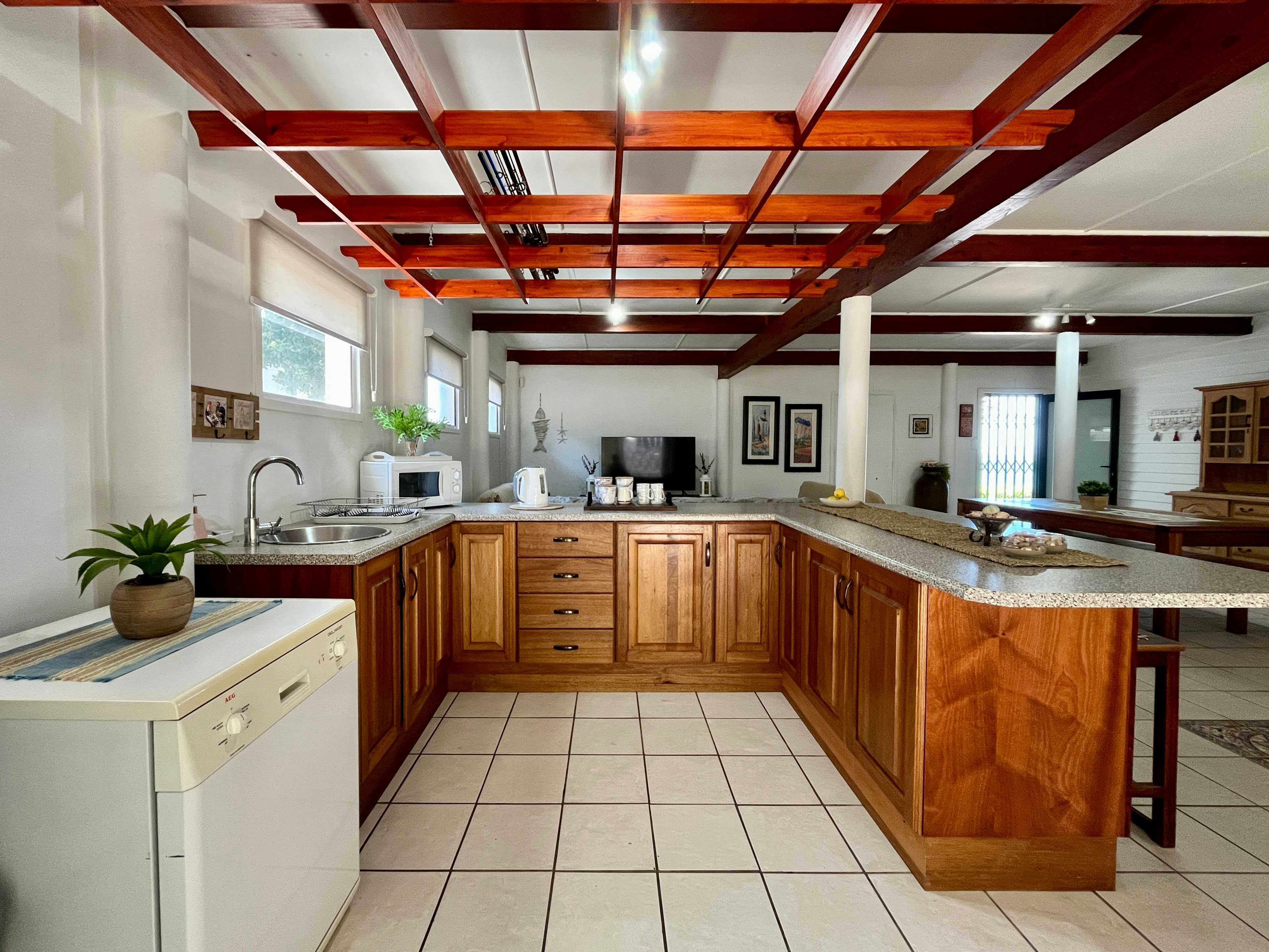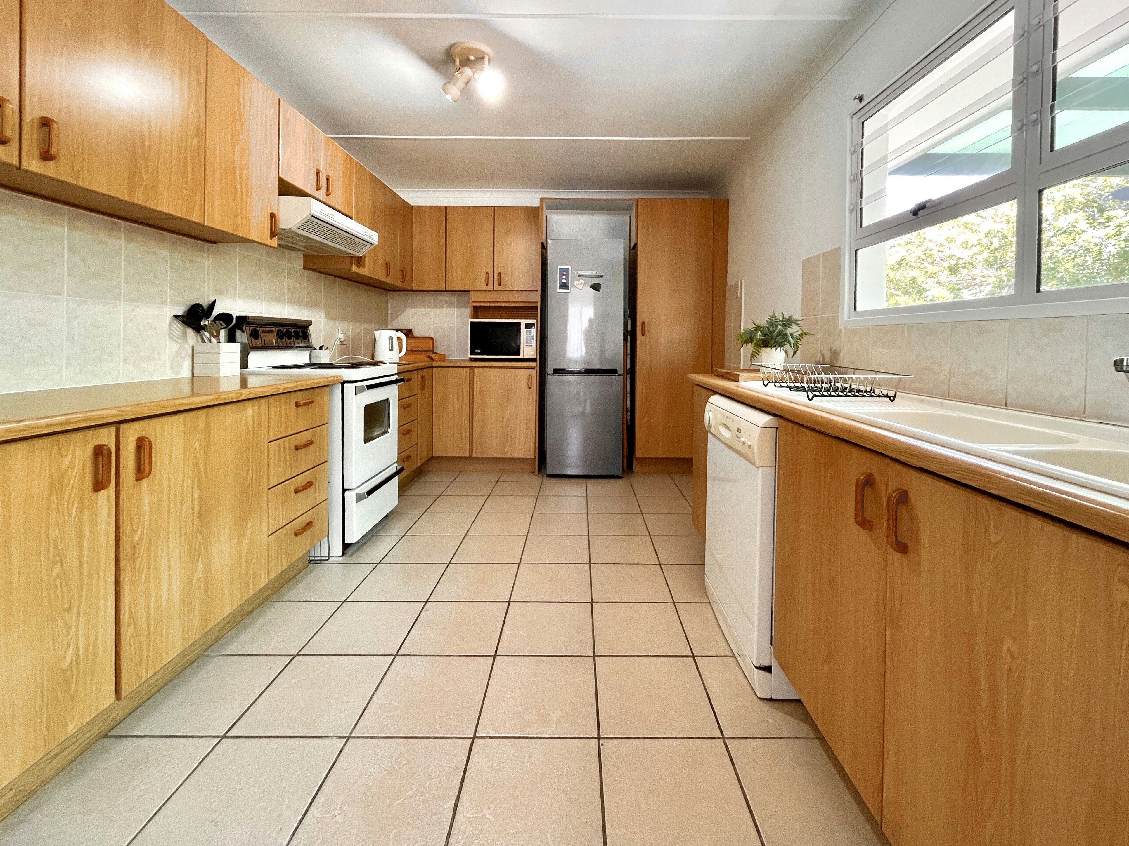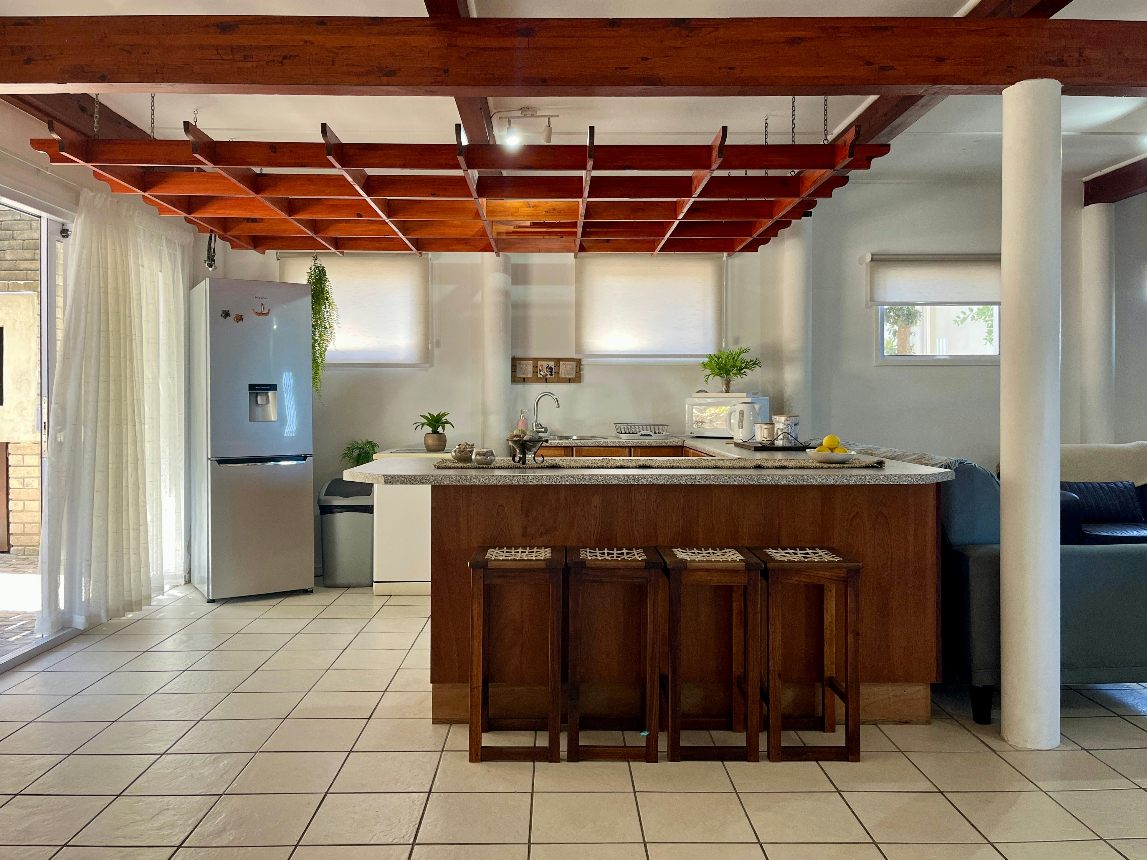 The home features a fully equipped kitchen with a stove, oven, microwave, kettle, toaster, cutlery, crockery, fridge-freezer, and dishwasher. An additional kitchenette located on the ground floor is equipped with a microwave, kettle, fridge-freezer, dishwasher, and a breakfast bar with stools. The lounging and dining areas offer comfortable seating where guests can dine and relax. For entertainment, a smart TV with a full bouquet of DStv channels and free Wi-Fi are available.