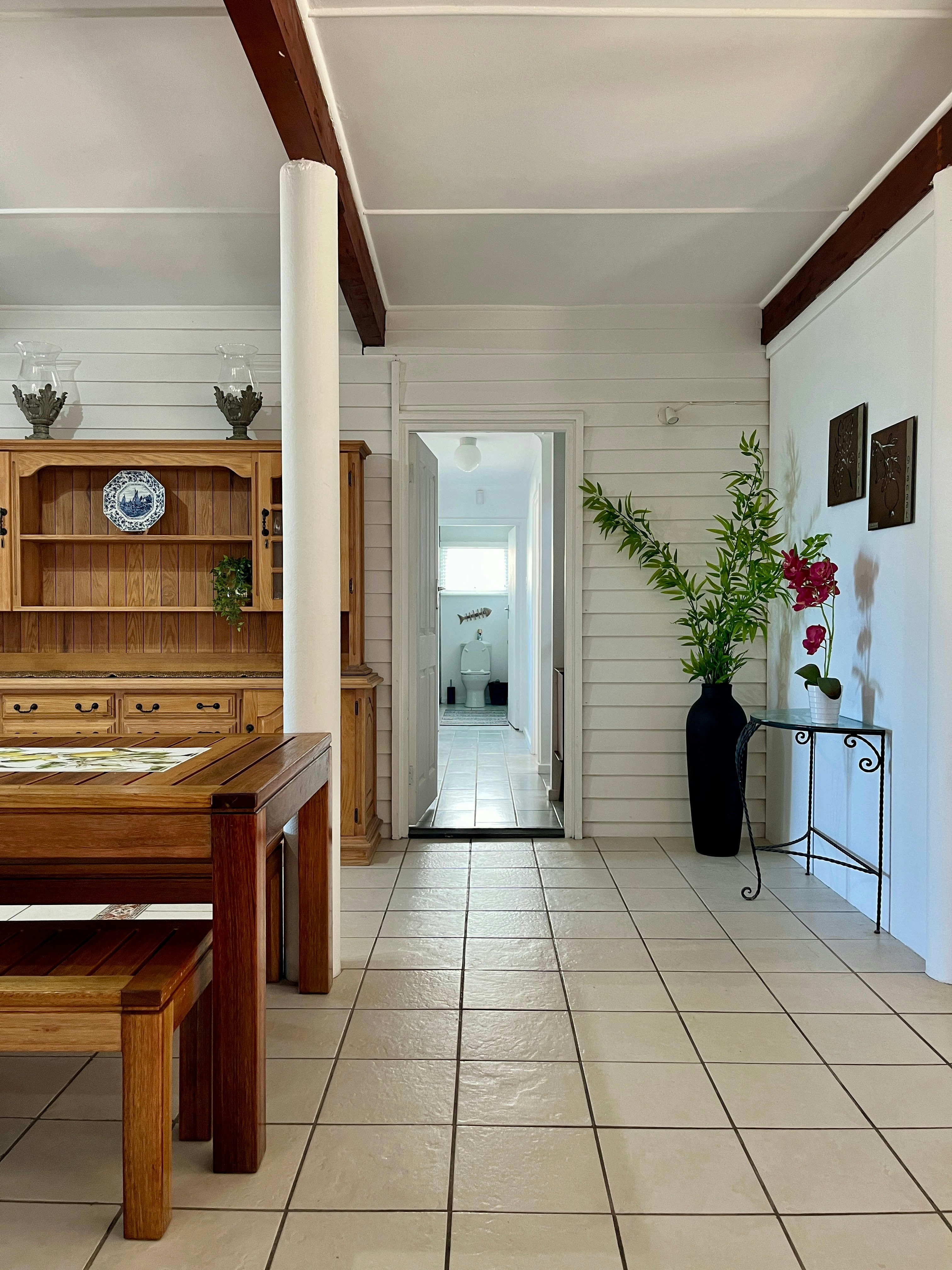 This double-storey property accommodates up to 10 guests and comprises 5 bedrooms and 4 bathrooms. The first bedroom is furnished with a king-size bed and features an en-suite bathroom fitted with a shower. The second bedroom has a queen-size bed and includes an en-suite bathroom fitted with a shower. The third bedroom has a double bed, while the fourth bedroom contains 2 single beds. These bedrooms share a bathroom fitted with a shower. The fifth bedroom has a queen-size bed and makes use of a separate bathroom fitted with a shower. Linen and bath towels are provided; however, guests are required to bring their own beach towels.