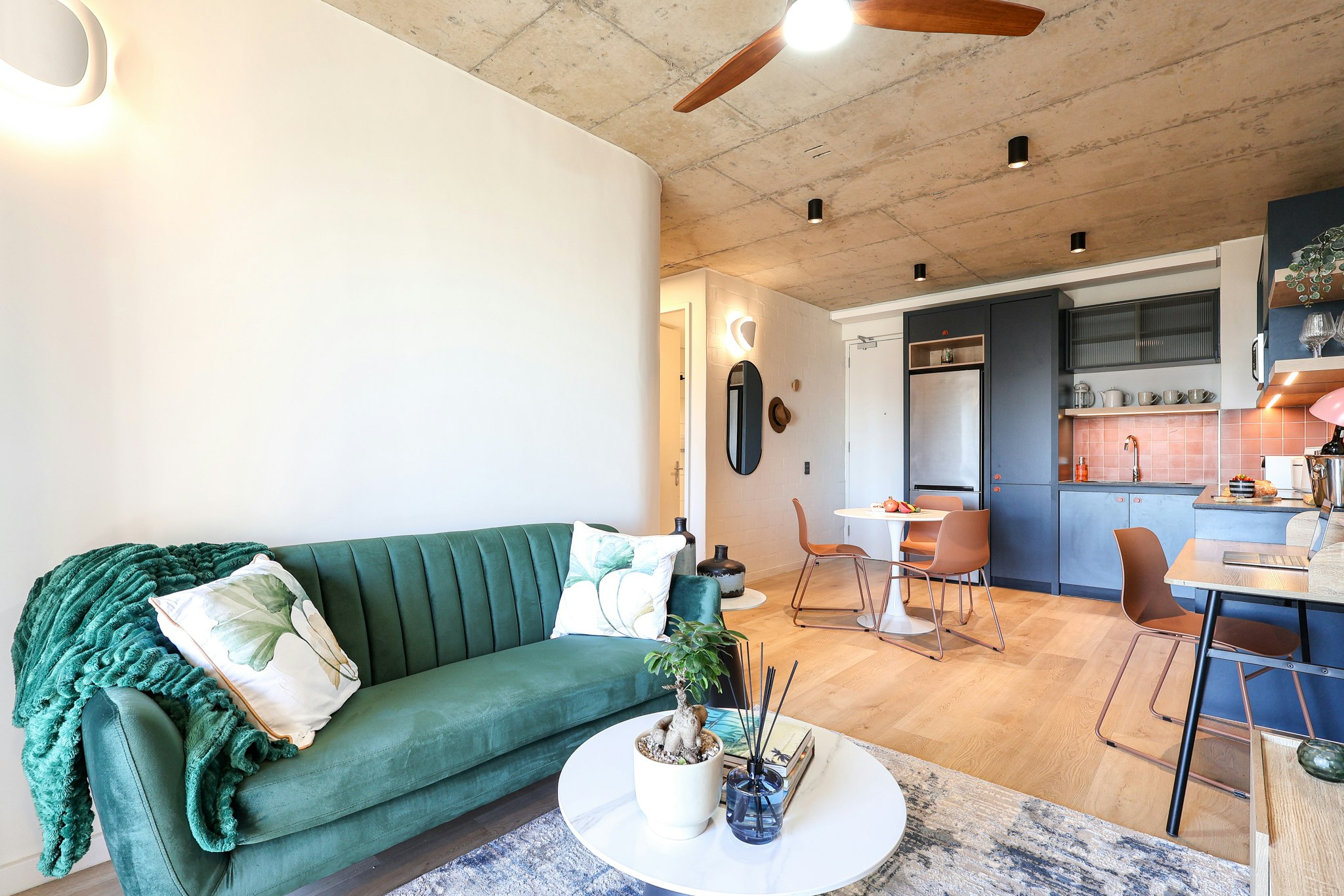 Die oopplan-leefarea beskik oor 'n kombuis wat volledig toegerus is met 'n stoof, oond, mikrogolfoond, yskas-vrieskas, eetgerei en breekware, sowel as 'n Nespresso-masjien. 'n Skottelgoedwasser en 'n eetkamertafel met 3 sitplekke is ook in die kombuis beskikbaar. Vanuit die kombuis lei die sitkamer met 'n gemaklike rusbank, 'n TV en 'n aangewese werkruimte. Toegang tot gratis WiFi is beskikbaar. Deur die skuifdeure kan gaste 'n oggendkoffie op die gemeubileerde balkon geniet.