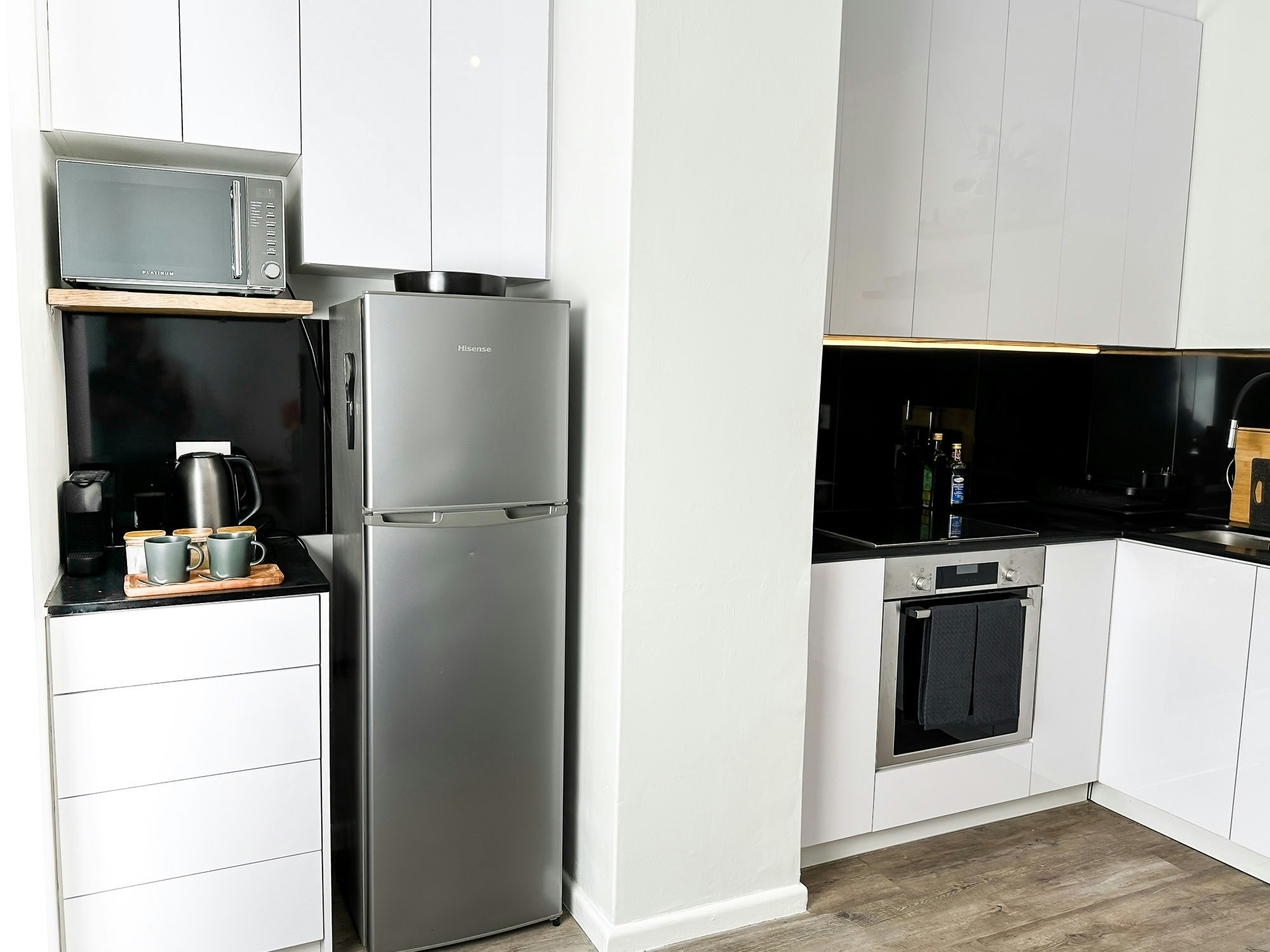 This apartment has an open-plan concept layout and features a lounge area furnished with a plush couch and a TV. The kitchen is equipped with a fridge-freezer, stove, oven, microwave, toaster, basic cutlery, crockery, and tea- and coffee-making facilities. There is a centrally located dining nook with chairs.