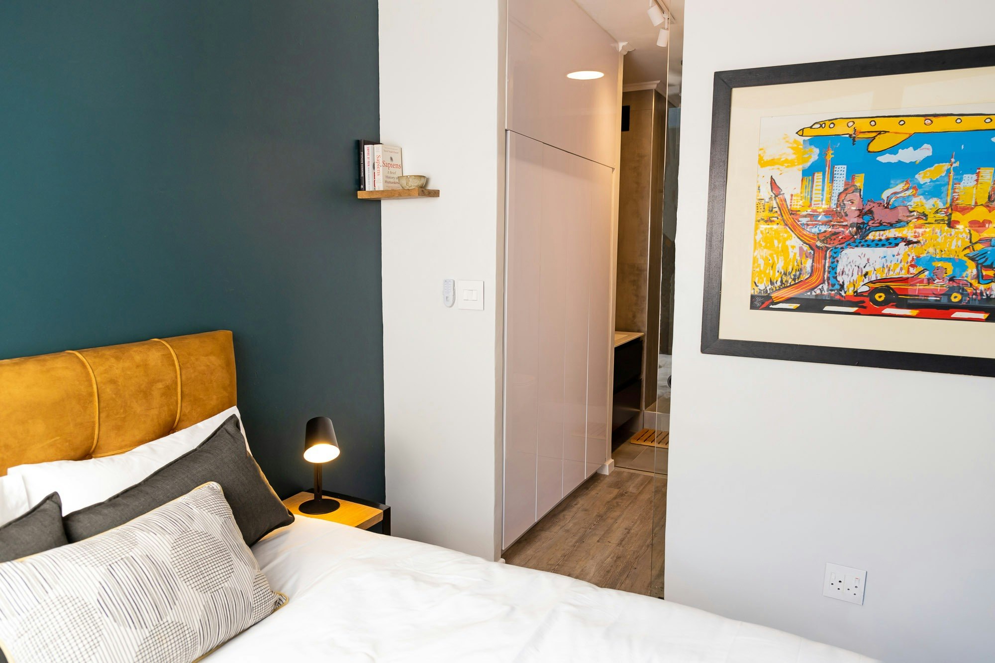 This studio apartment can accommodate 2 guests and features a small walk-through cupboard and vanity area, providing convenient clothing storage and separation from the bathroom area. It is tastefully furnished with a queen-size bed and has an en-suite bathroom fitted with a shower, basin, and toilet. Crisp linen and soft towels are provided.