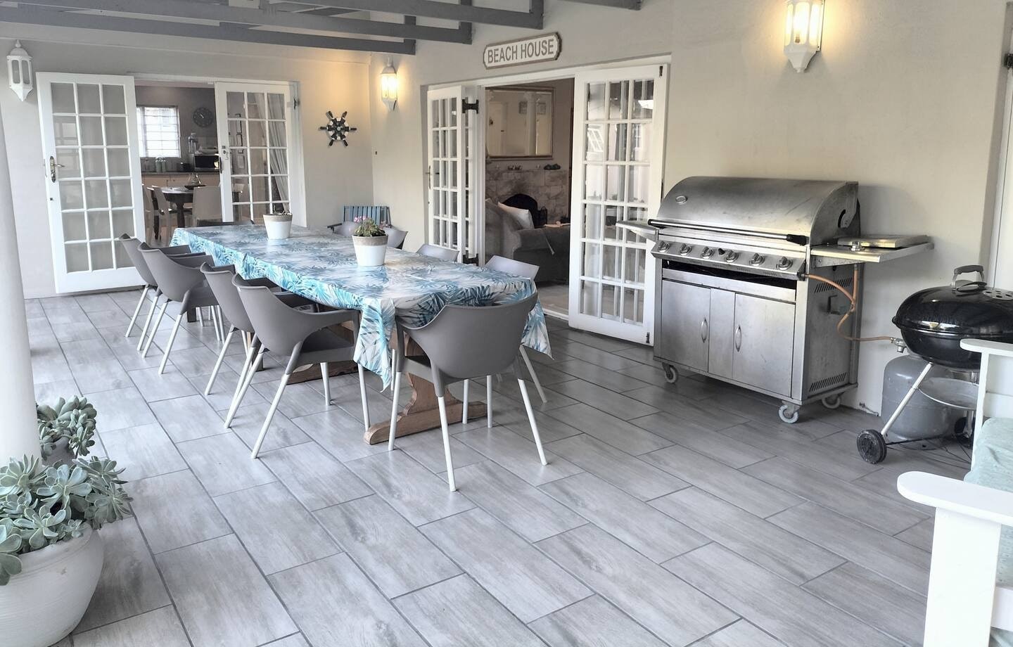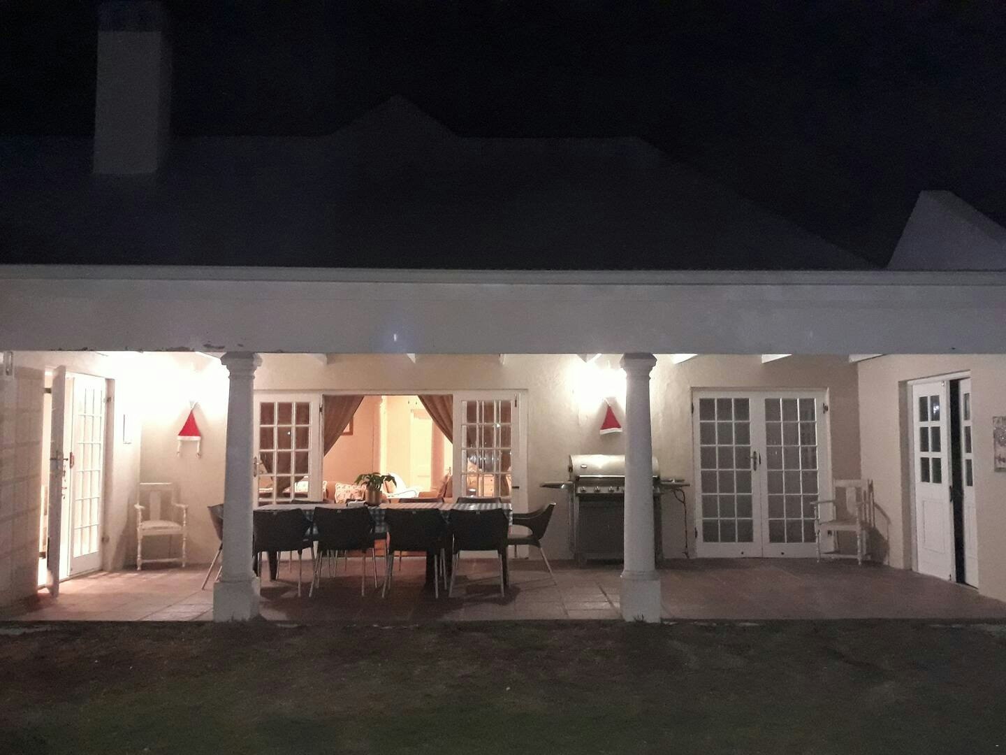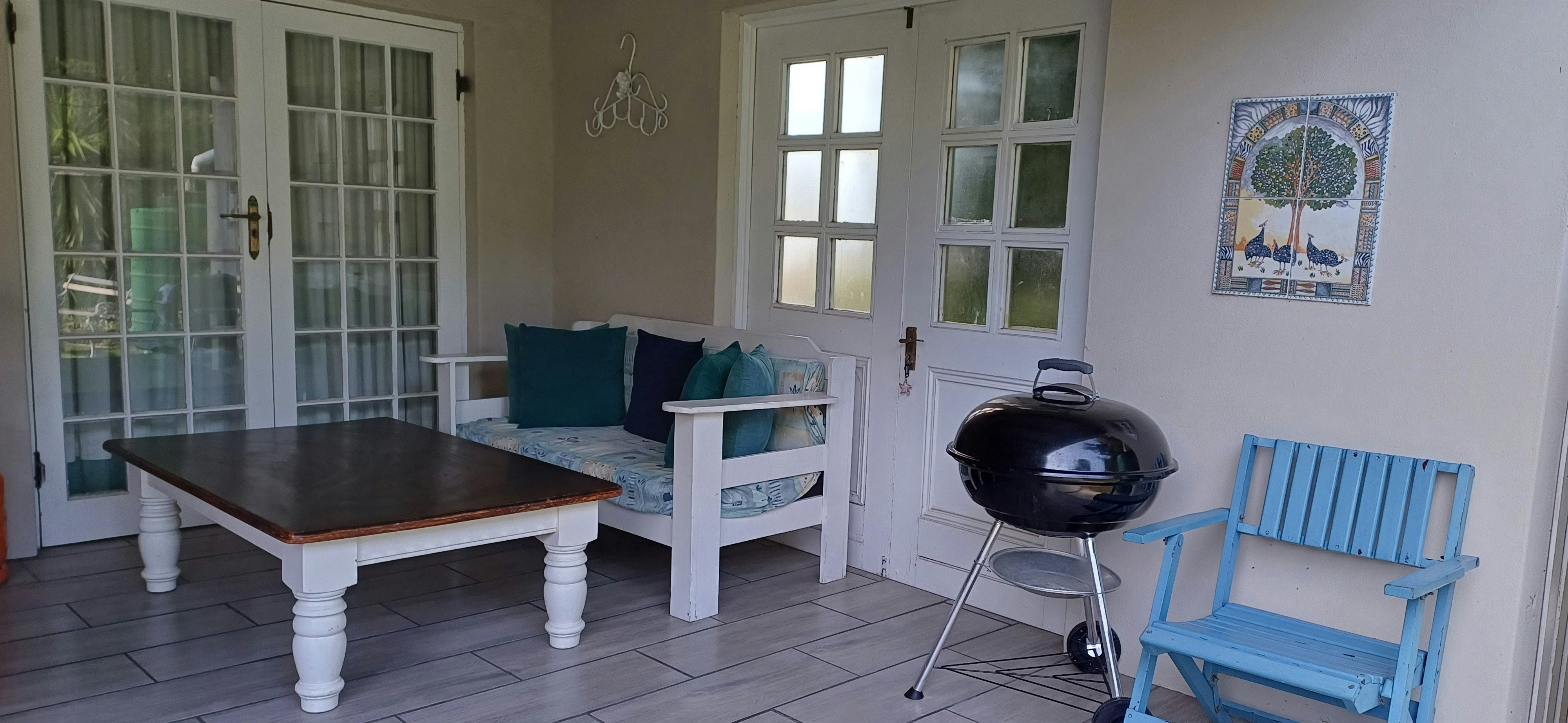 This lounge area opens onto a garden-facing covered patio with an outdoor dining table, a Weber braai and a gas braai which is the perfect spot for a sundowner in the evening. Guests are afforded secure parking on the property.