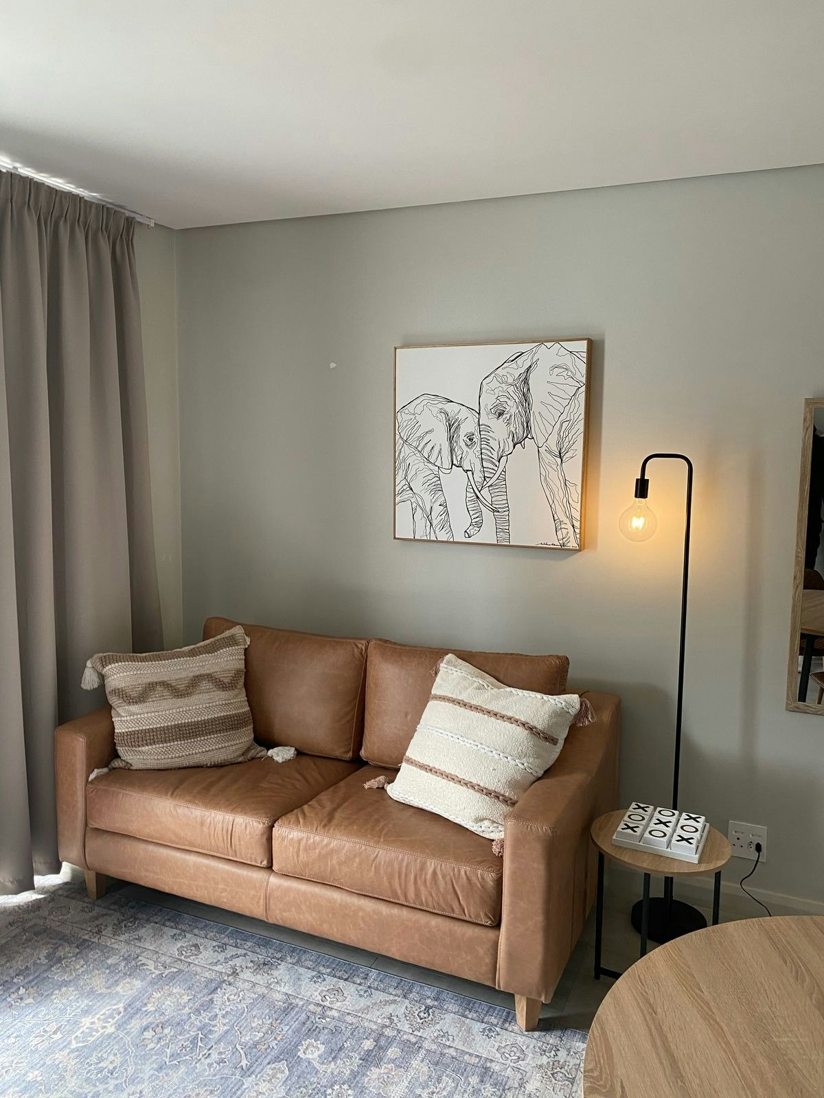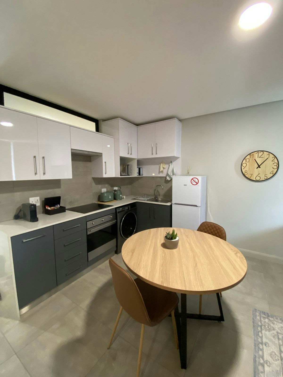 The open-plan living area includes a well-equipped kitchen complete with a stove, oven, microwave, kettle, coffee machine, toaster, fridge-freezer, and washing machine. The adjacent dining area and lounge are furnished with a comfortable 2-seater dining table, a designated workstation, and a couch. For guest entertainment, there is a smart TV and complimentary uncapped Wi-Fi access.