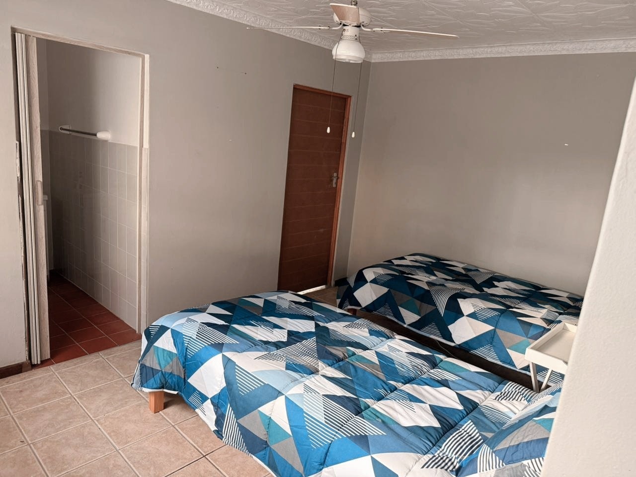 The house can accommodate 15 guests and comprises of 5 bedrooms and a teenage pad. The main bedroom contains 2 double beds, as well as a flat-screen TV. There is an en-suite bathroom fitted with a shower and bath. There is a door between the room and the bathroom, to ensure privacy in this room, whilst other guests can still make use of the bathroom. The second and third bedrooms both have double beds, whilst the fourth and fifth bedrooms have queen-size beds. The second bathroom is shared and is fitted with a bath and shower, and a separate toilet. Bath towels are available for use by guests.