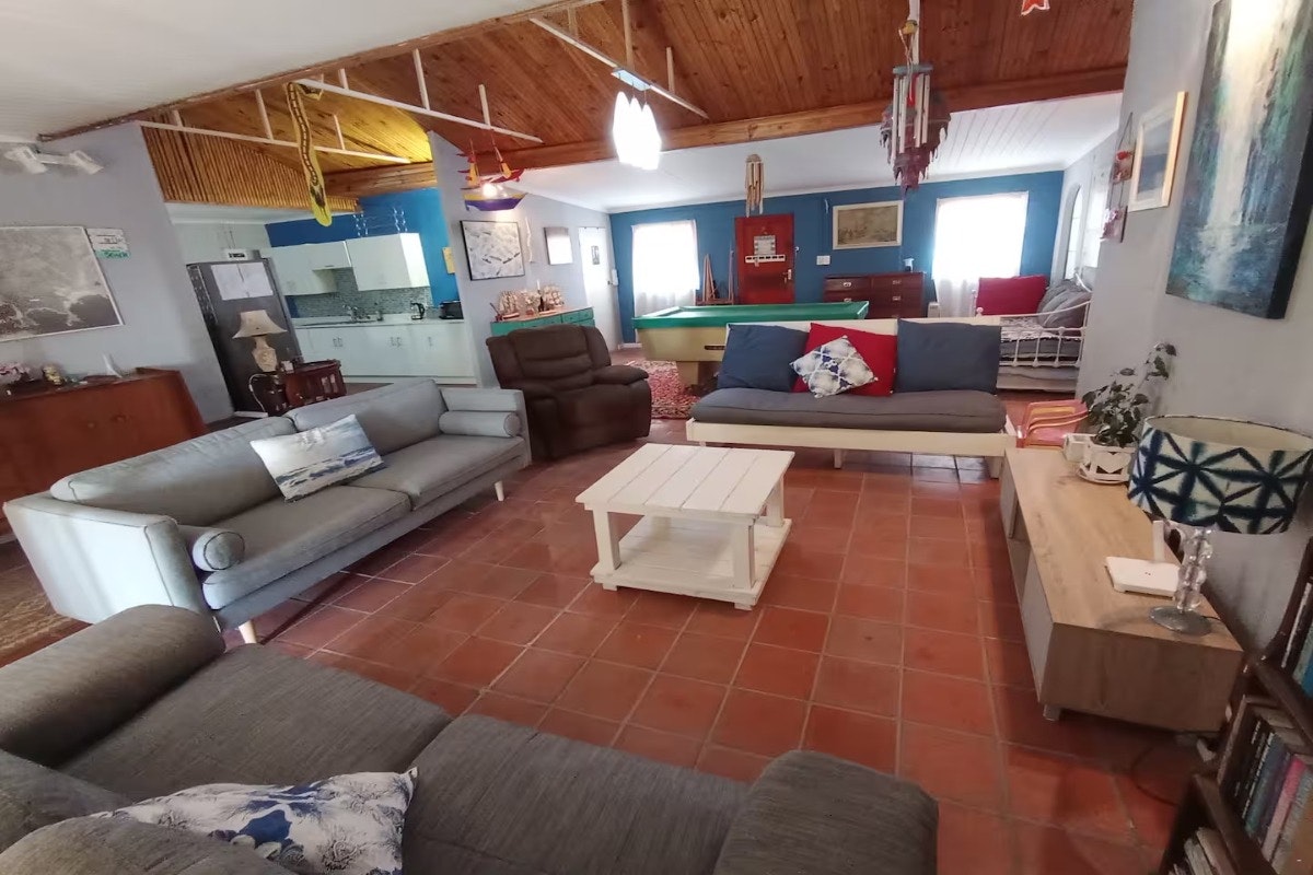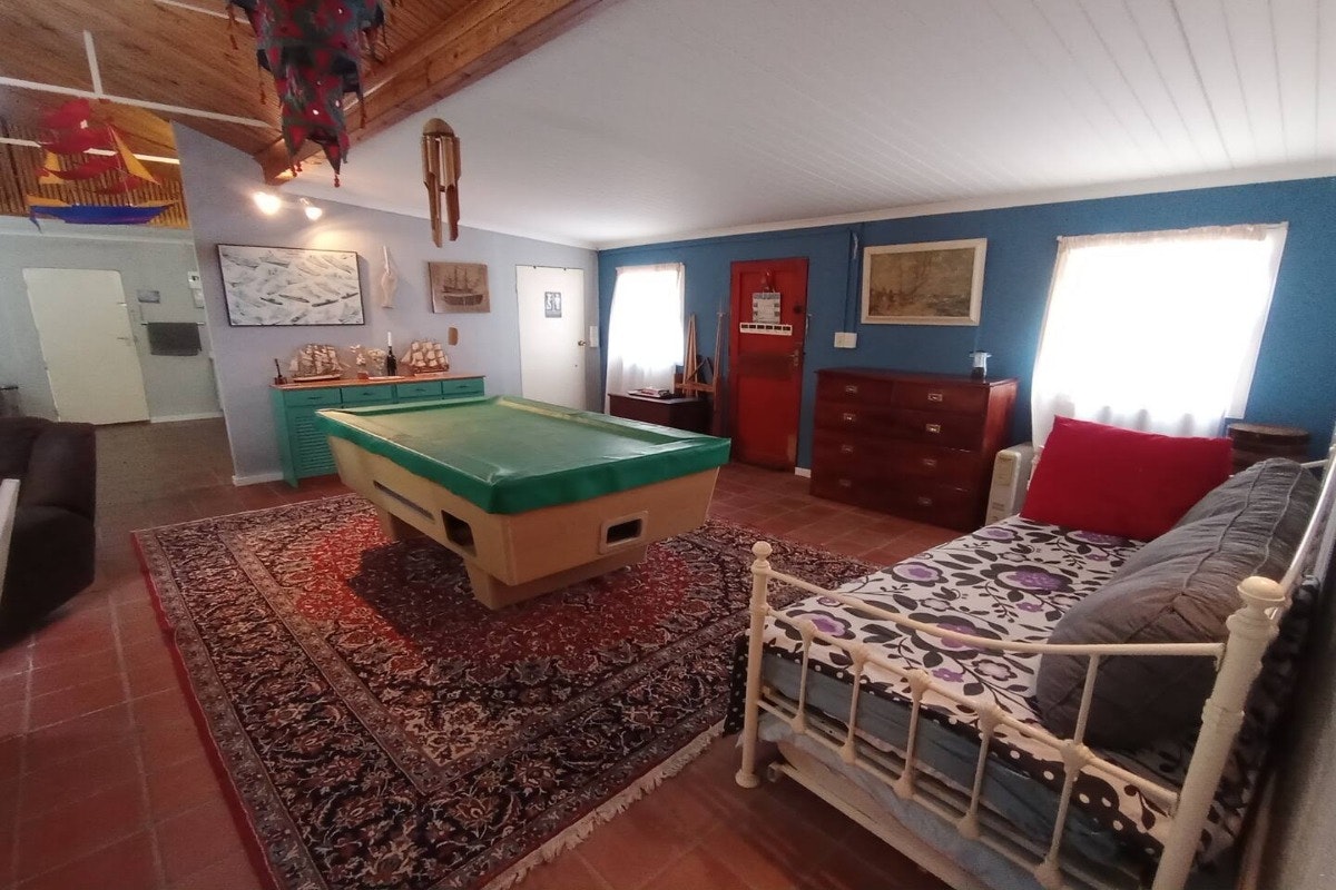 Die oopplan-leefarea het gemaklike sitplek en 'n pooltafel. Die kombuis is met 'n yskas-vrieskas, gasstoof, oond, mikrogolfoond en koffie- en teemaakgeriewe toegerus. Daar is ook 'n toegeboude kuierarea met 'n etenstafel, gemaklike sitplek, 'n binnebraai, Jacuzzi en 'n veerpyltjiebord. Dit lei na 'n houtdek met 'n uitsig oor die tuin en die see. Parkeerplek is op die perseel beskikbaar.