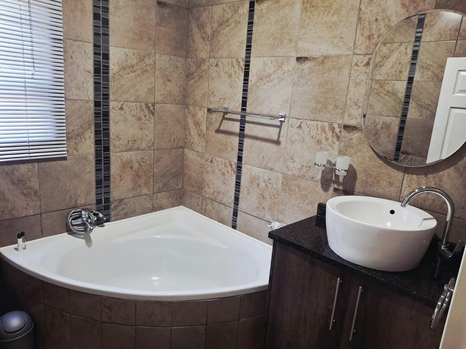 The open-plan living area features a kitchen equipped with a fridge-freezer, gas stove, oven, microwave, cutlery and crockery, tea- and coffee-making facilities, and a breakfast bar with stools. Adjacent to the kitchen, the lounge offers ample comfortable seating, a Smart TV with streaming services, a full selection of DStv channels, and complimentary Wi-Fi access. A separate braai room next to the lounge is also available for guests’ enjoyment.