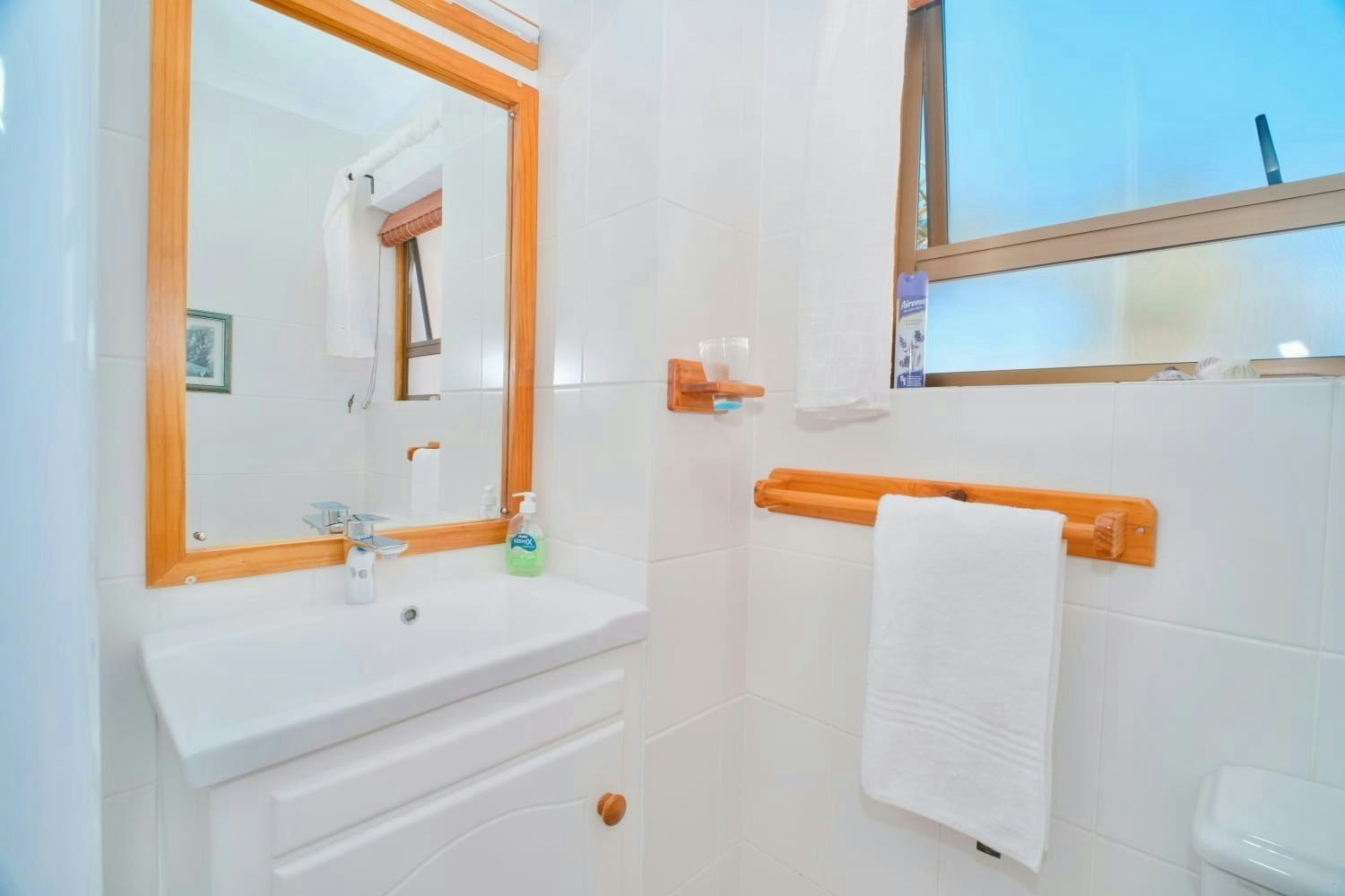 A double garage for 2 sedan-sized vehicles is available, and additional driveway parking is available for bigger vehicles. The garage is equipped with a washing machine and tumble-dryer. An outdoor cold-water shower is available to rinse off after a day at the beach.