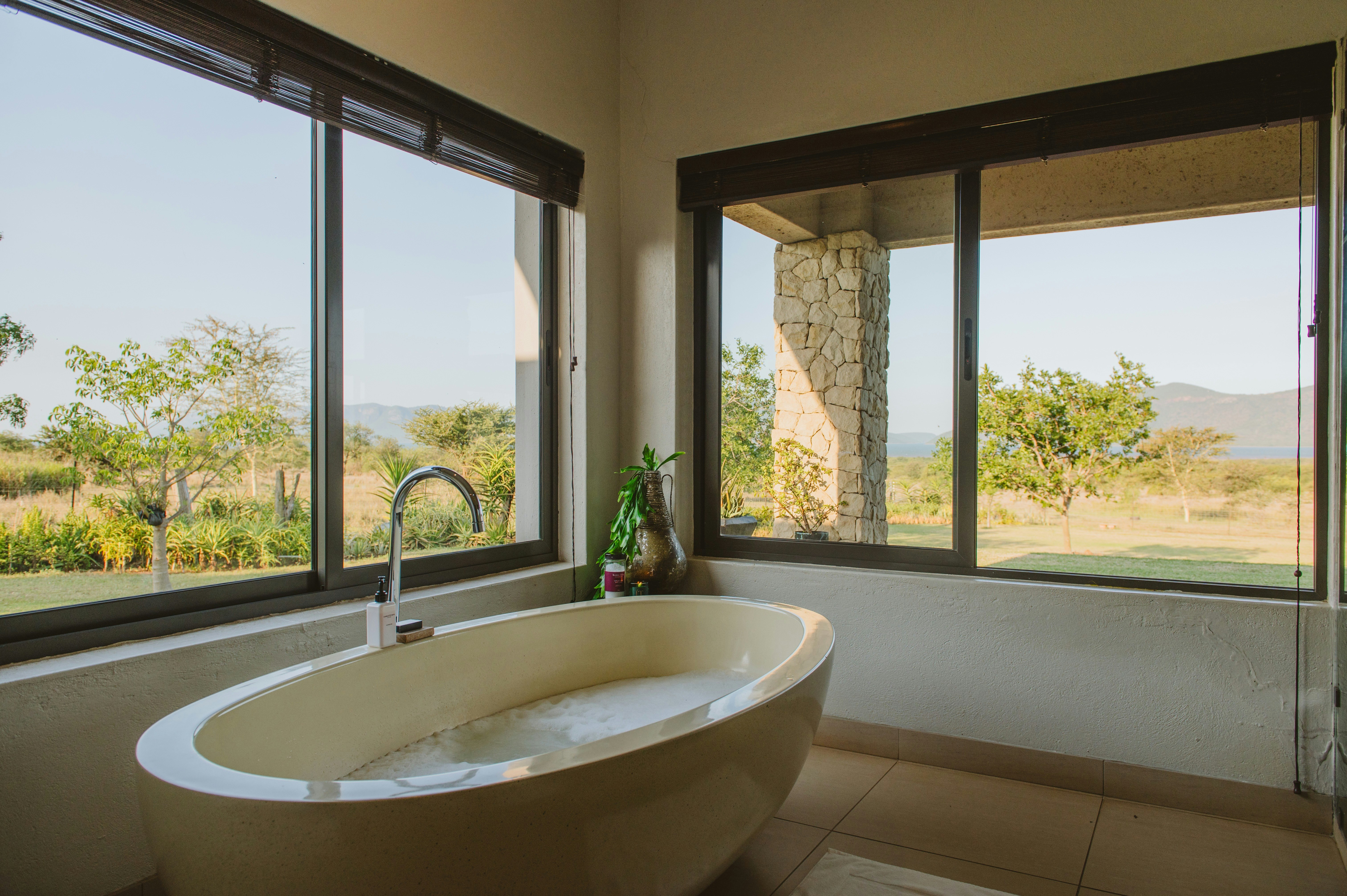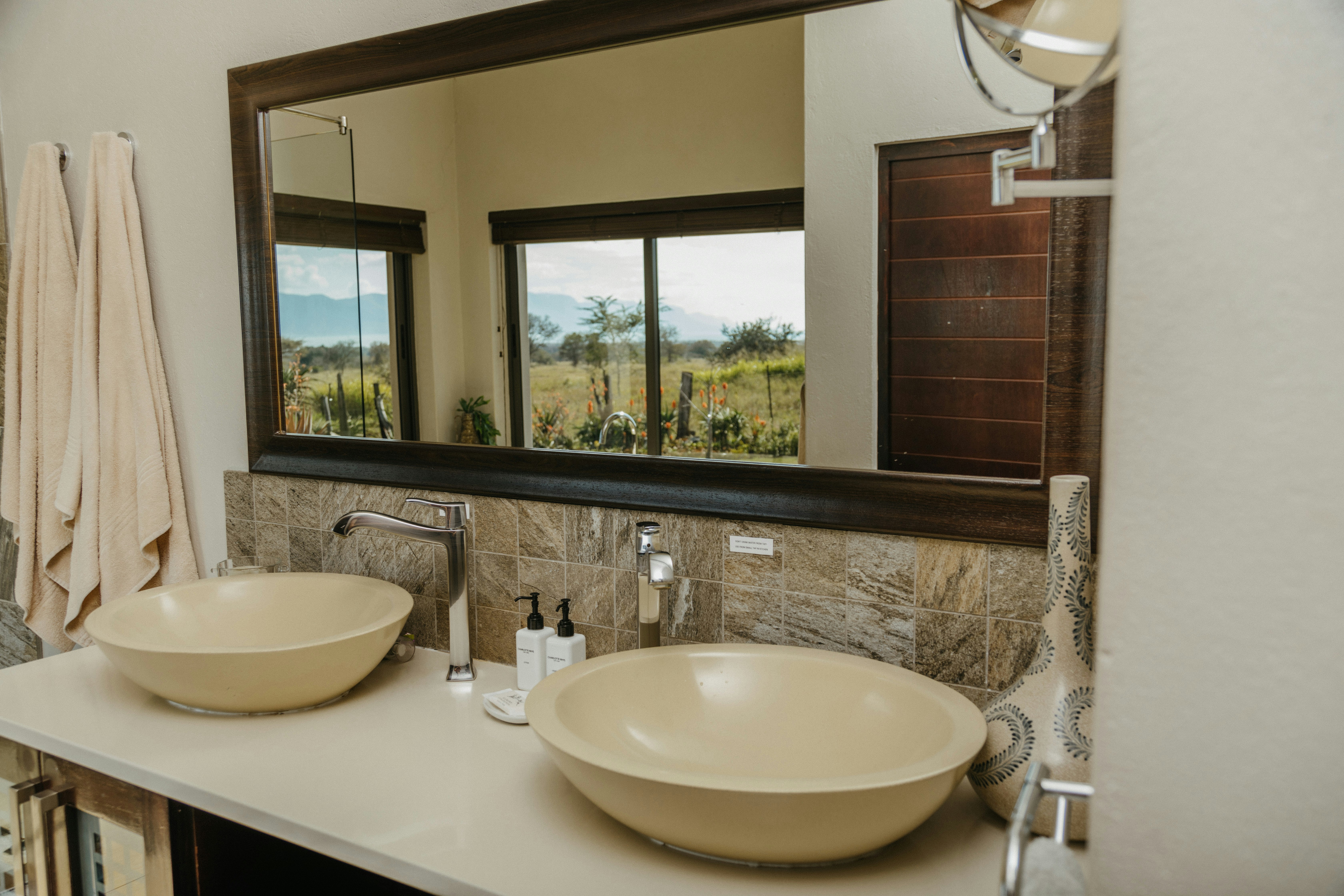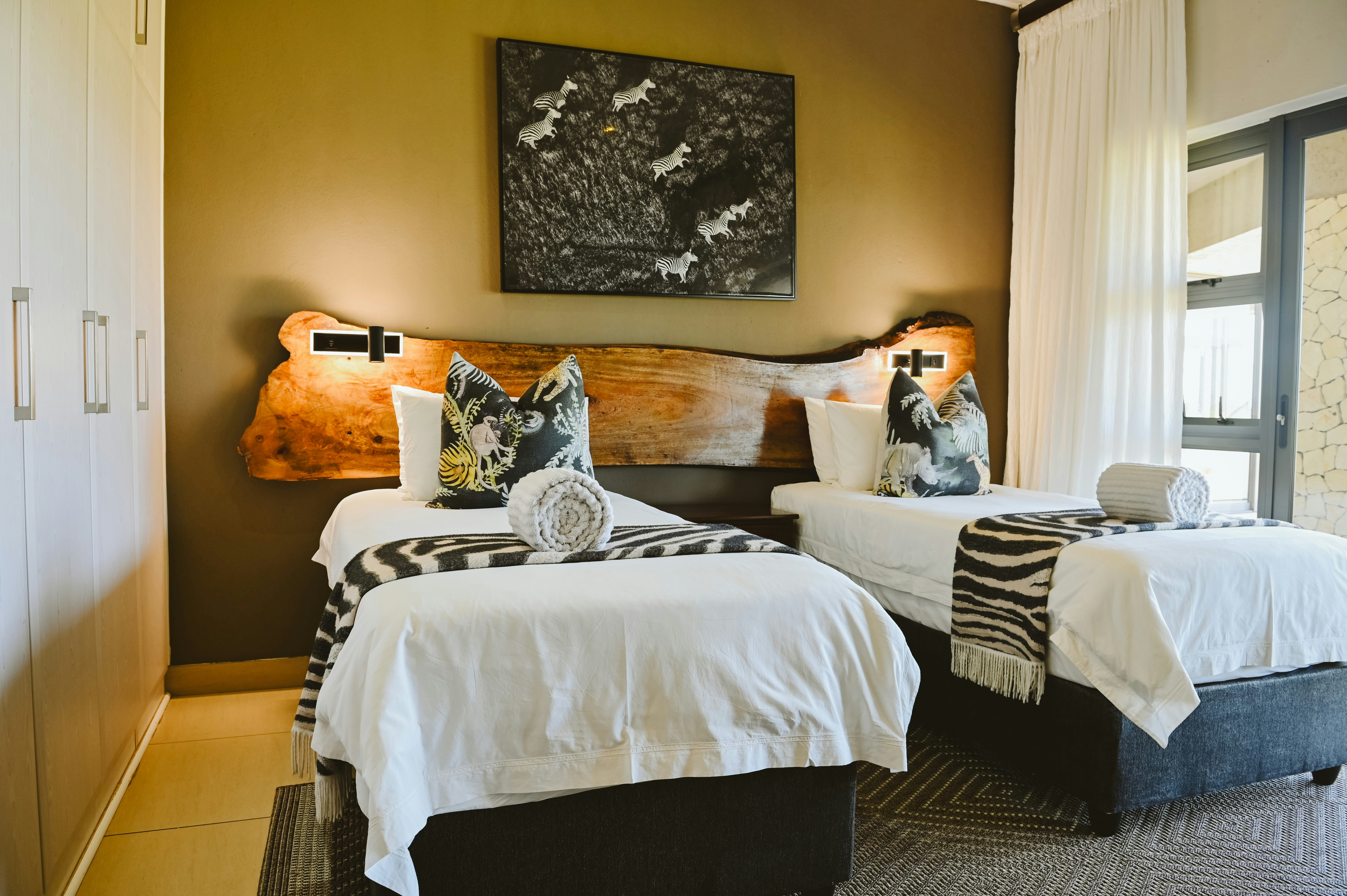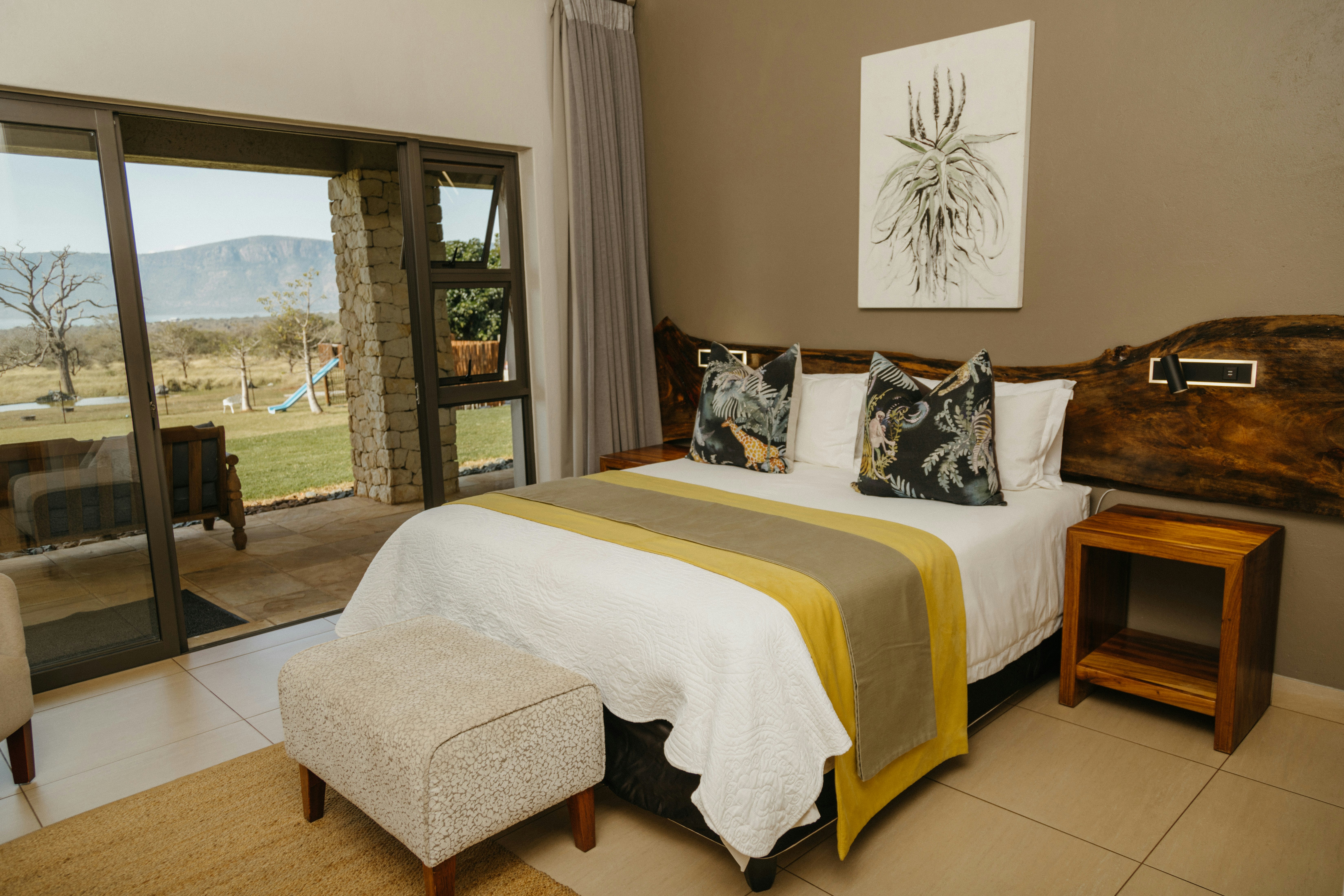 Tandweni Villa boasts panoramic views of Jozini dam and the Ubombo mountain range from every room. The villa can accommodate up to 10 guests and contains 5 luxury bedrooms and 5 bathrooms, 2 of which are en suite. The first bedroom is furnished with a king-size bed. The second and third bedrooms each have a queen-size bed, and the fourth and fifth bedrooms each contain 2 single beds. The main bedroom has a kids' room attached. All the luxury bedrooms have sliding doors that open up onto a covered patio with a lounge suite that flows onto the gardens. Each bathroom is fitted with either a bath or a shower, or both, and some en-suite bathrooms feature double basins and a toilet.