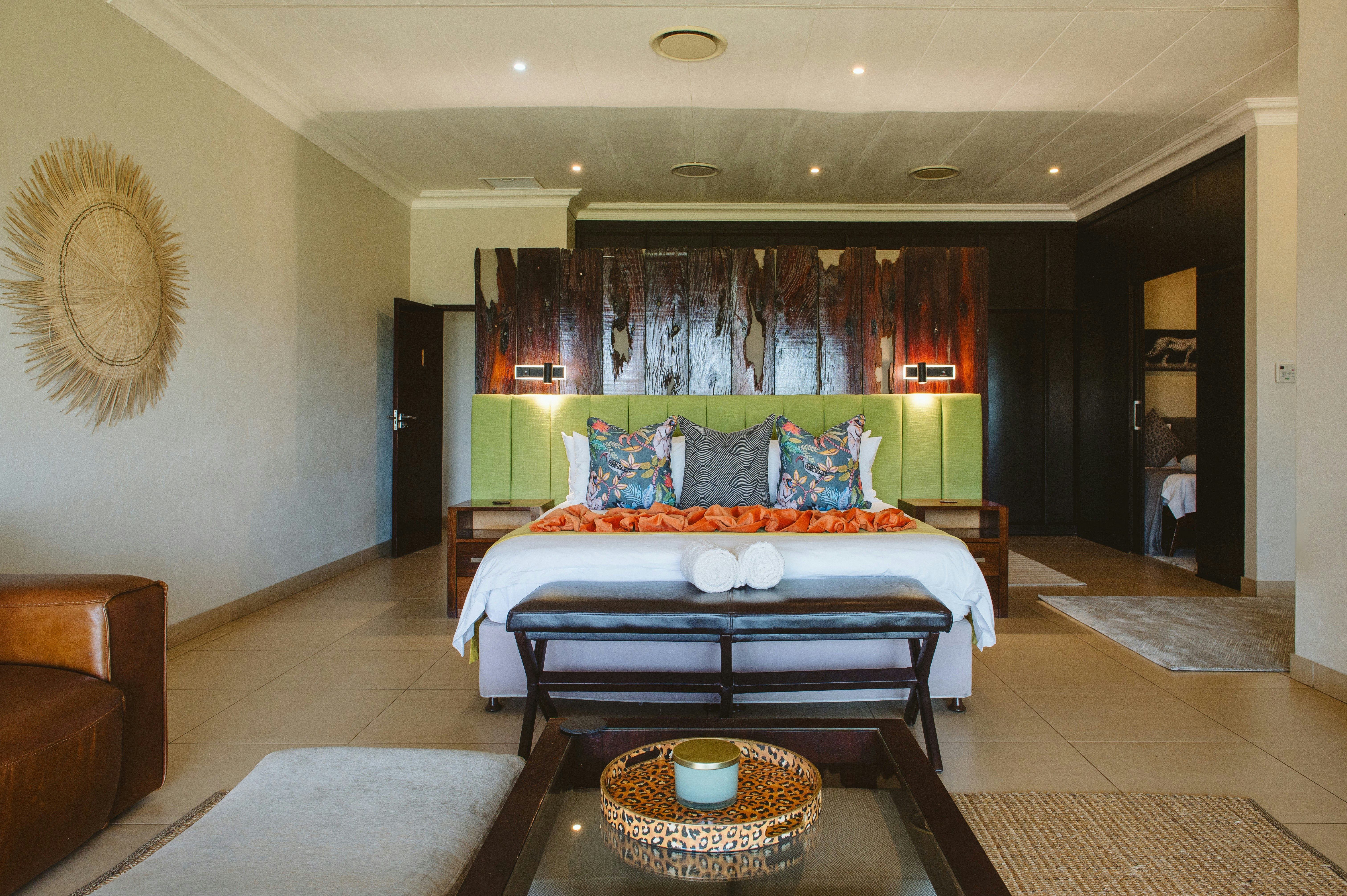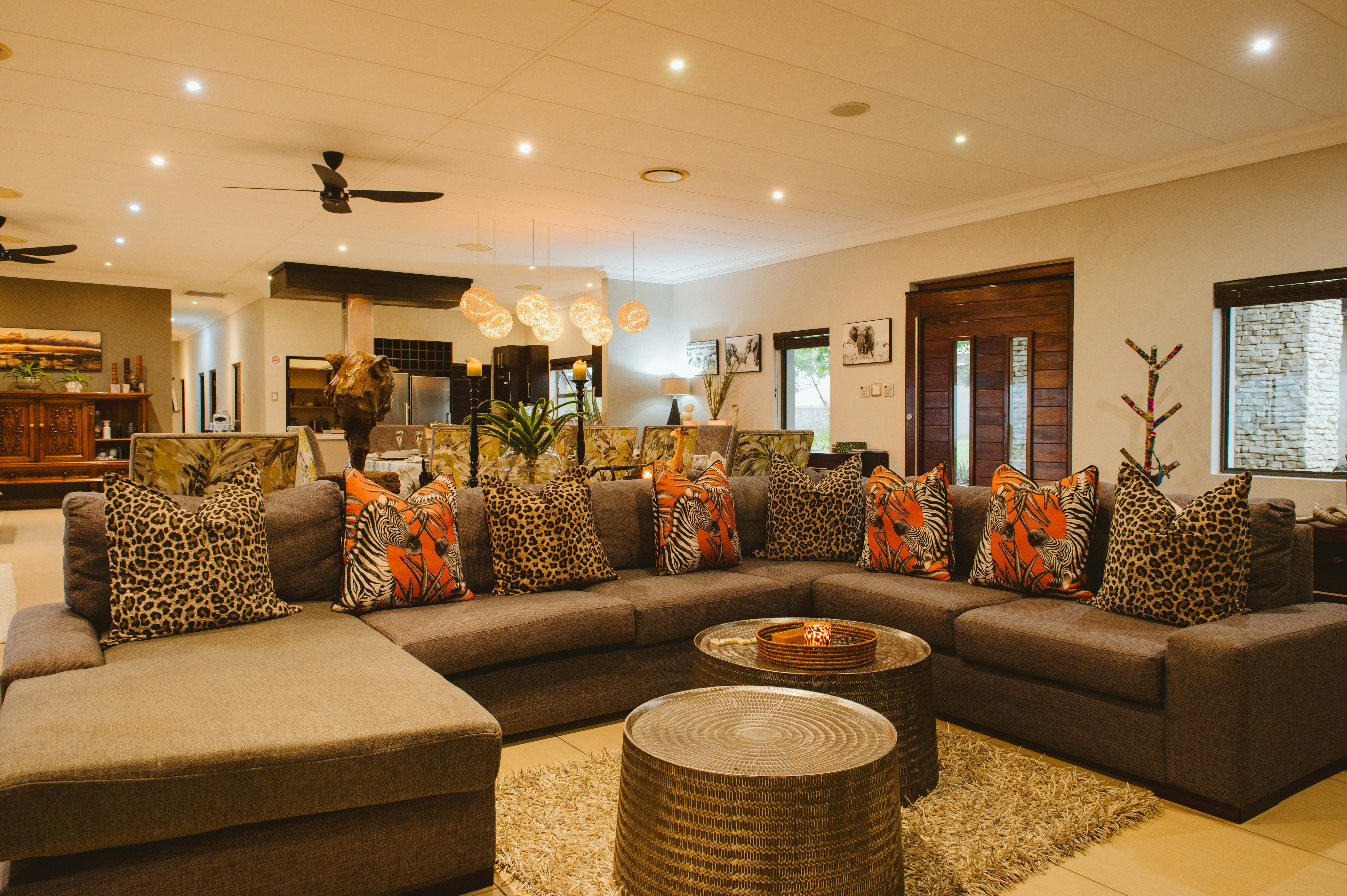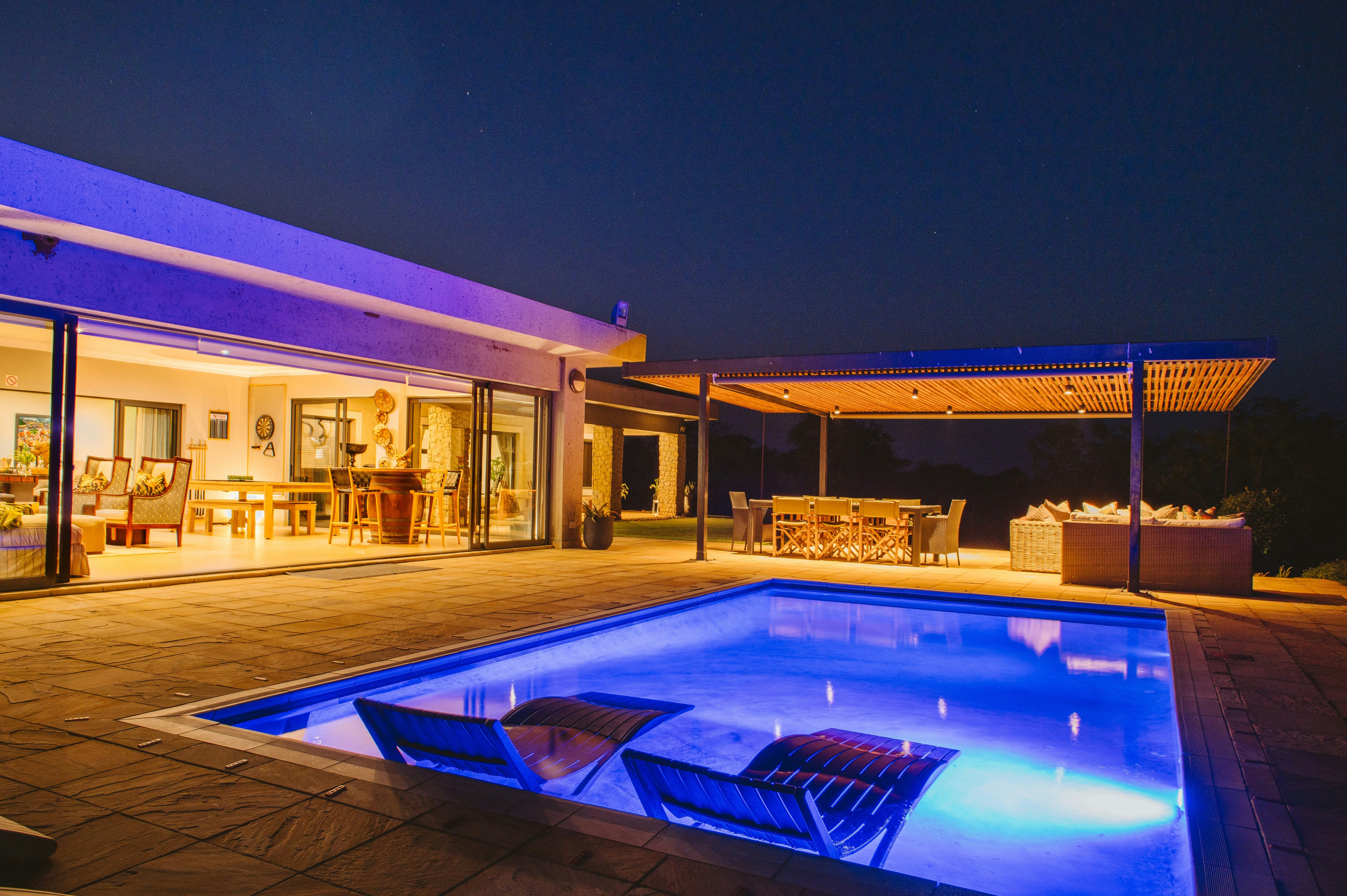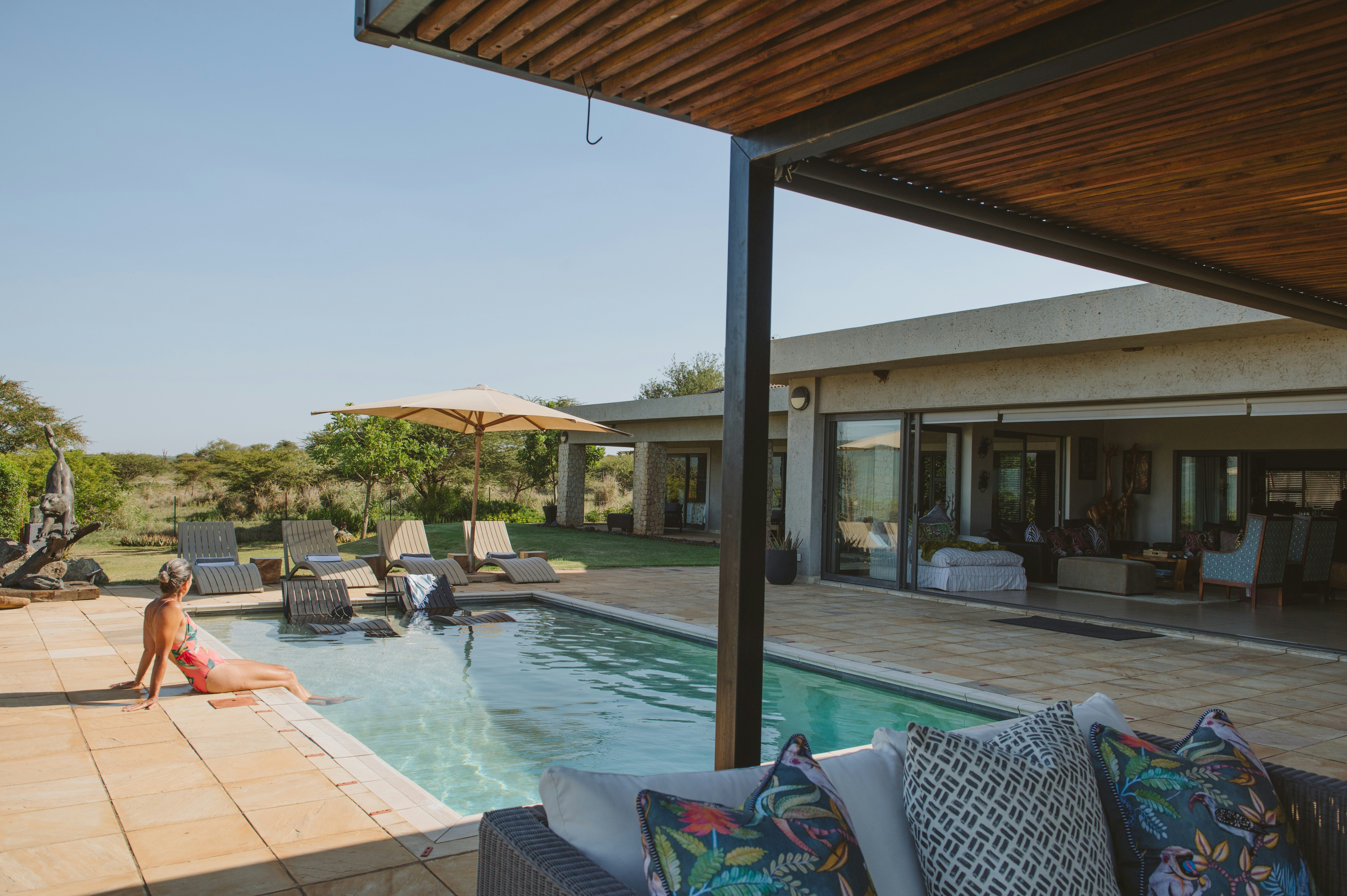 The kitchen, dining, and living area are open-plan and unique, offering expansive open spaces with large glass doors and windows welcoming the outside in. There is a fully glazed sun lounge with couches, daybeds, a pool table, pin pong, and a darts board. This opens up and flows onto the swimming pool and pergola, creating a luxurious outside living space. The villa has its own boma to enjoy outside fires under the stars, a private well-equipped gym, a bird hide, and a jungle gym overlooking a small watering hole.