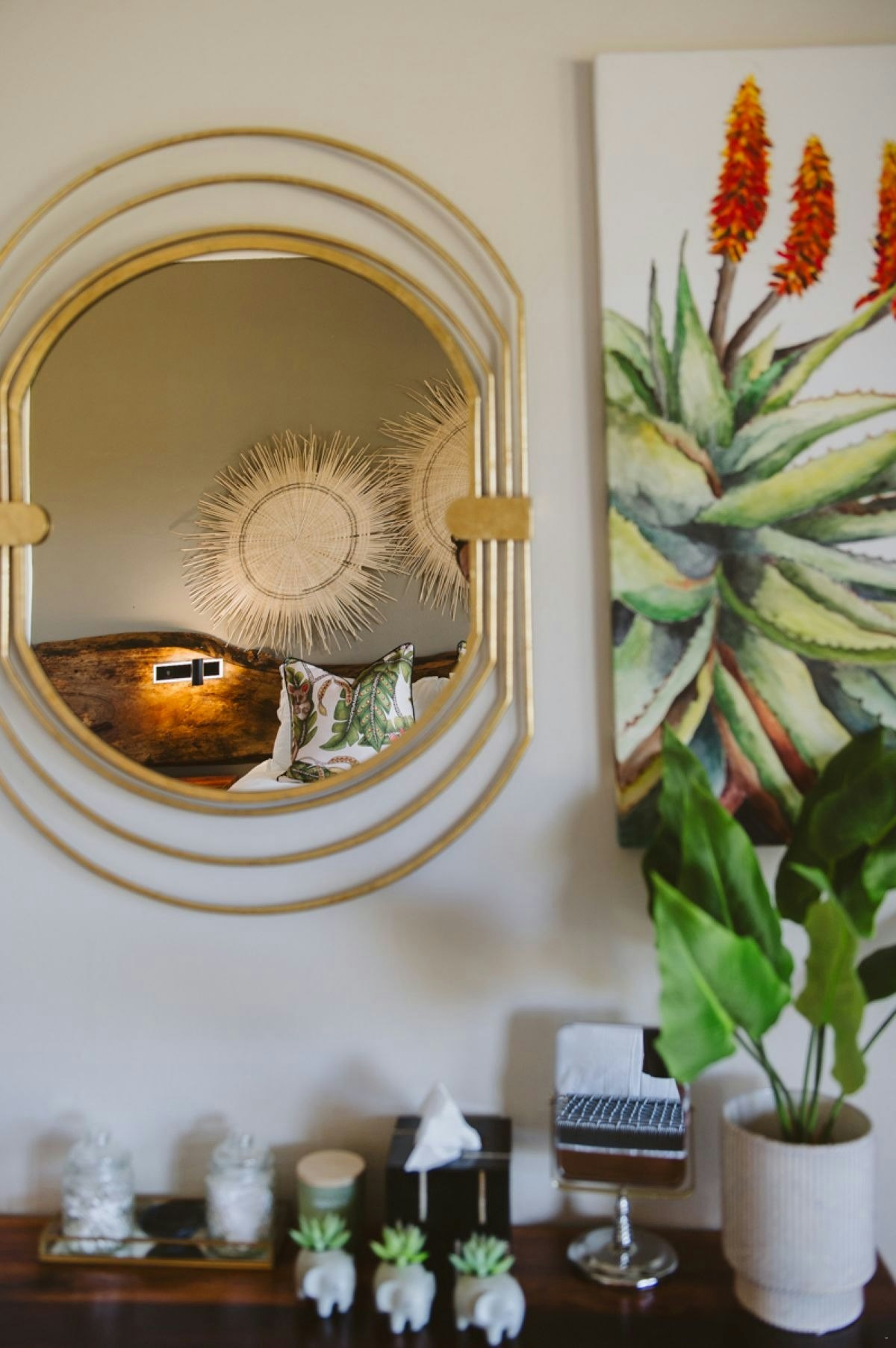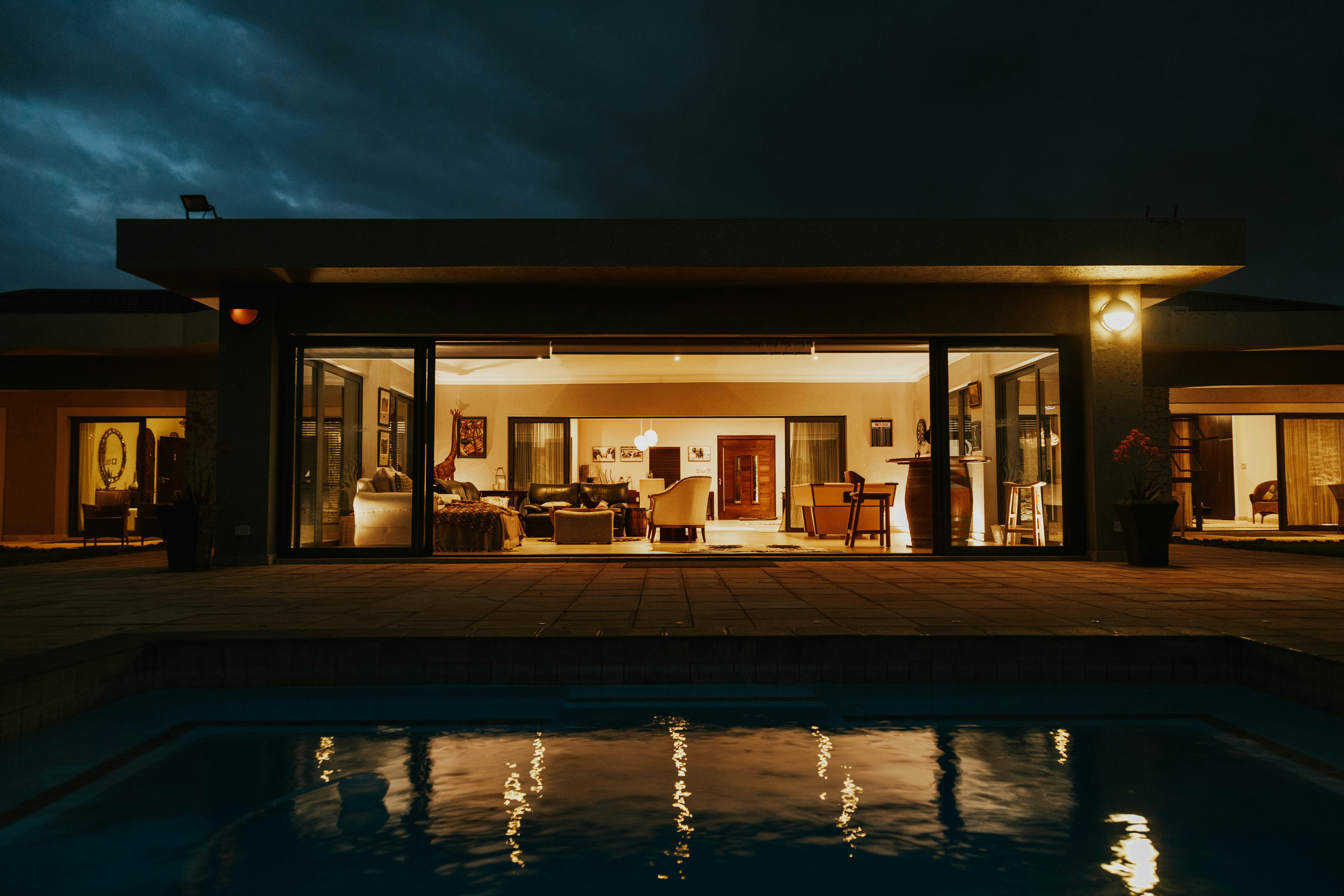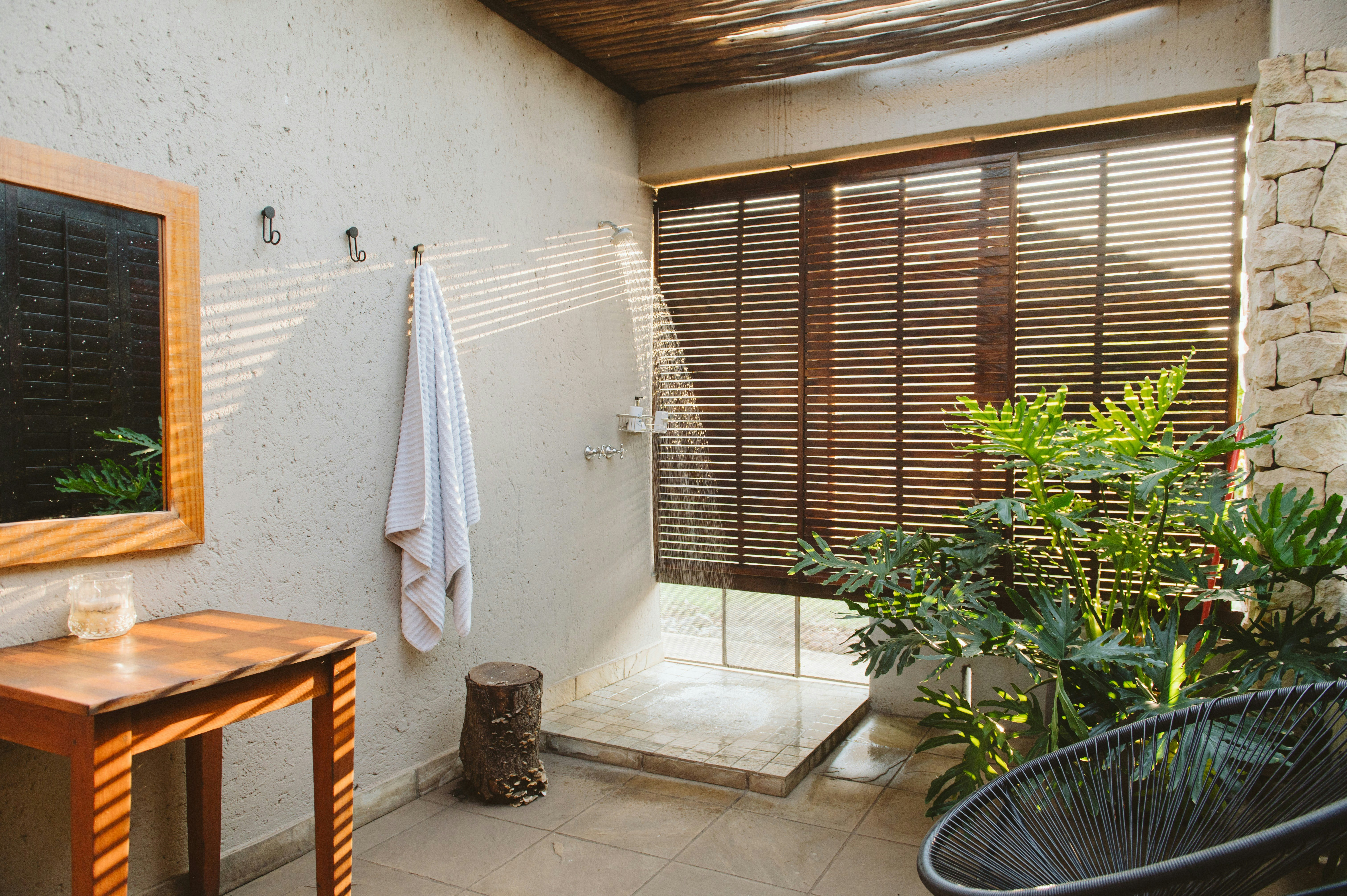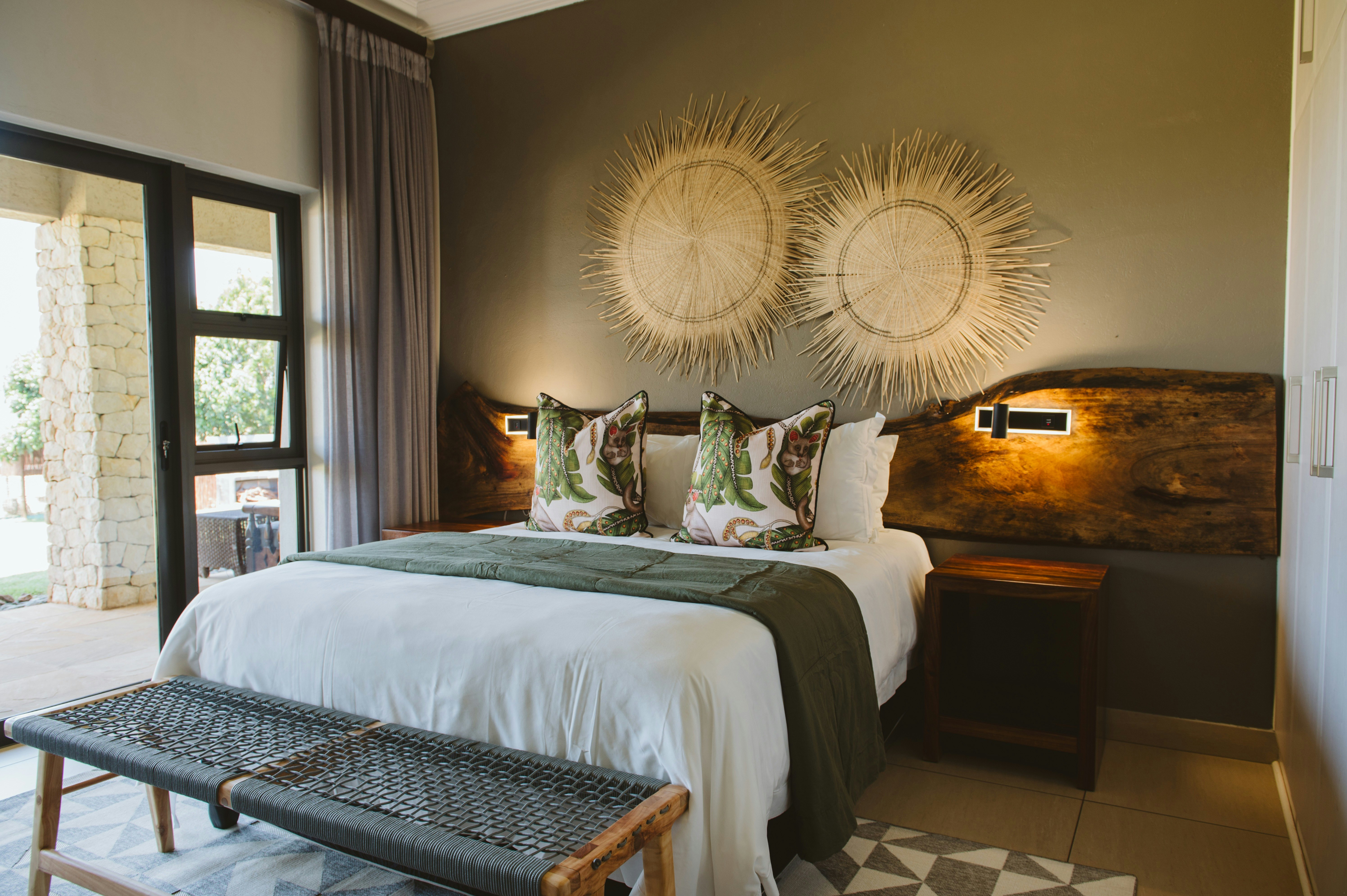 The kitchen, dining, and living area are open-plan and unique, offering expansive open spaces with large glass doors and windows welcoming the outside in. There is a fully glazed sun lounge with couches, daybeds, a pool table, pin pong, and a darts board. This opens up and flows onto the swimming pool and pergola, creating a luxurious outside living space. The villa has its own boma to enjoy outside fires under the stars, a private well-equipped gym, a bird hide, and a jungle gym overlooking a small watering hole.