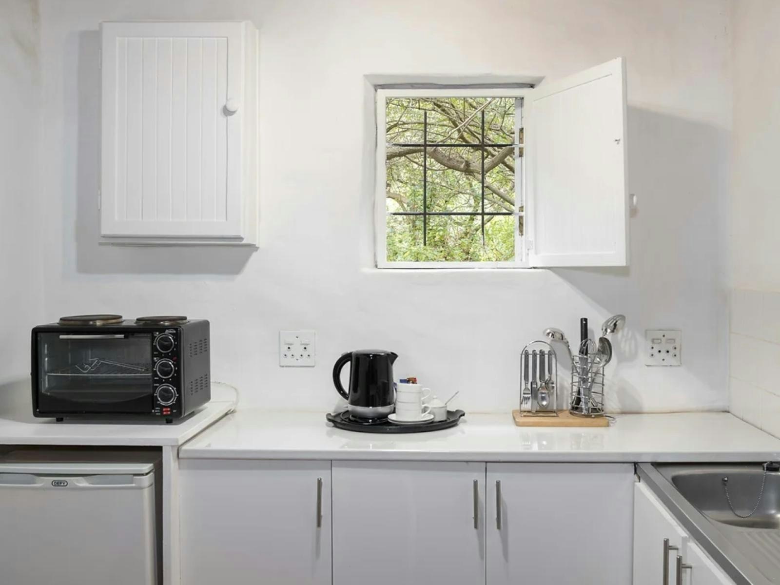 The living area features an open-plan design with a kitchenette equipped with a kettle, toaster, 2-plate convection oven, bar fridge, cutlery, and crockery.