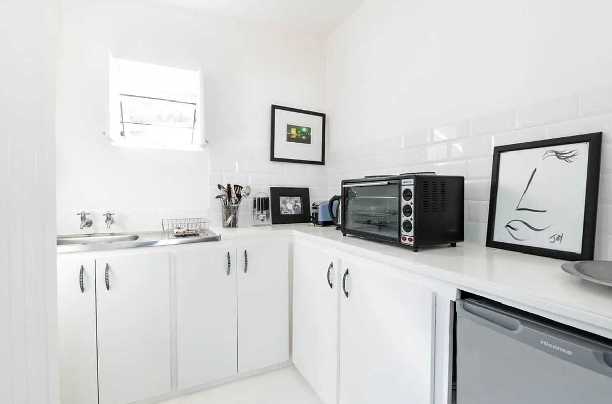 The living area features an open-plan design with a kitchenette equipped with a kettle, toaster, 2-plate convection oven, bar fridge, cutlery, and crockery.