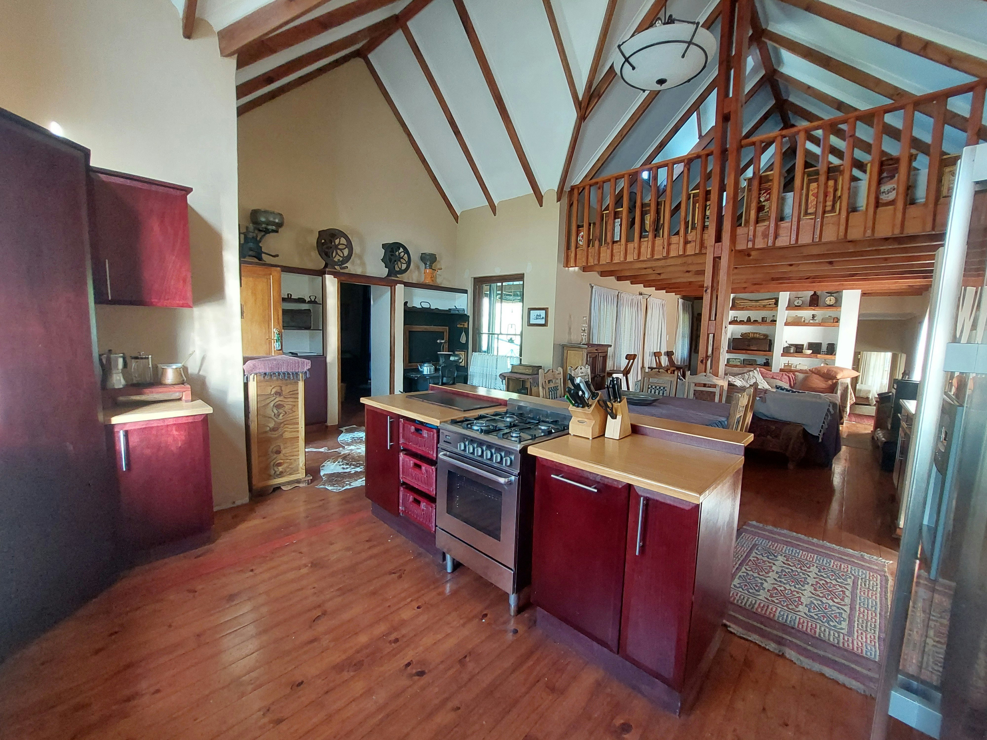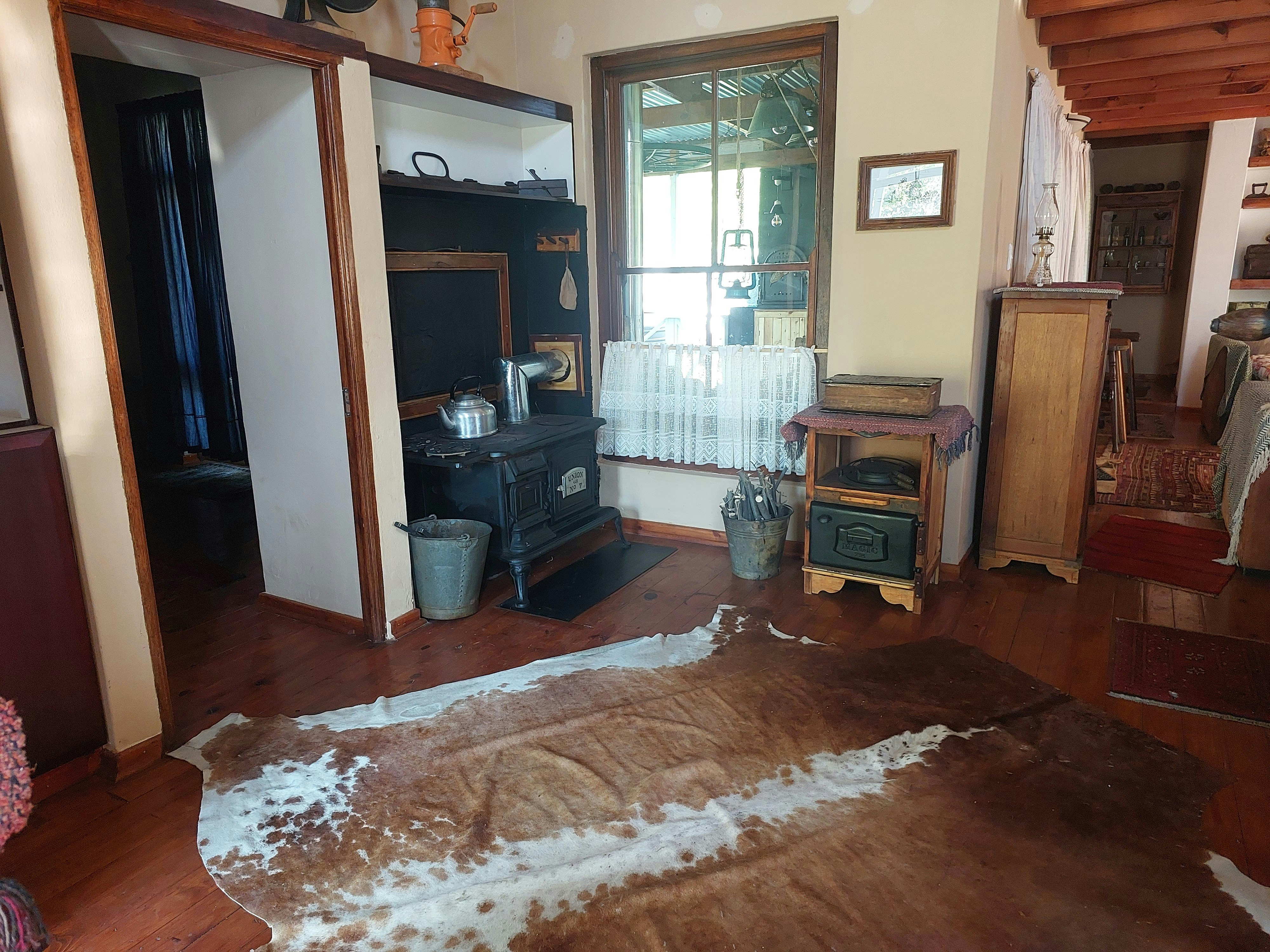 Die oopplan-leefarea sluit 'n eetarea en 'n sitkamer met verskeie kaggels, 'n TV en gemaklike sitplek in. Die kombuis is volledig toegerus met 'n dubbeldeur-yskas-vrieskas, gasstoof, oond, lugbraaier, broodmasjien, broodrooster, ketel en mikrogolfoond. Gaste kan koffiebone saambring en koffie maak met die ouwêreldse koffiemeul en perkolator. 'n Effens aparte opwaskamer bevat 'n dubbelwasbak en 'n wasmasjien.