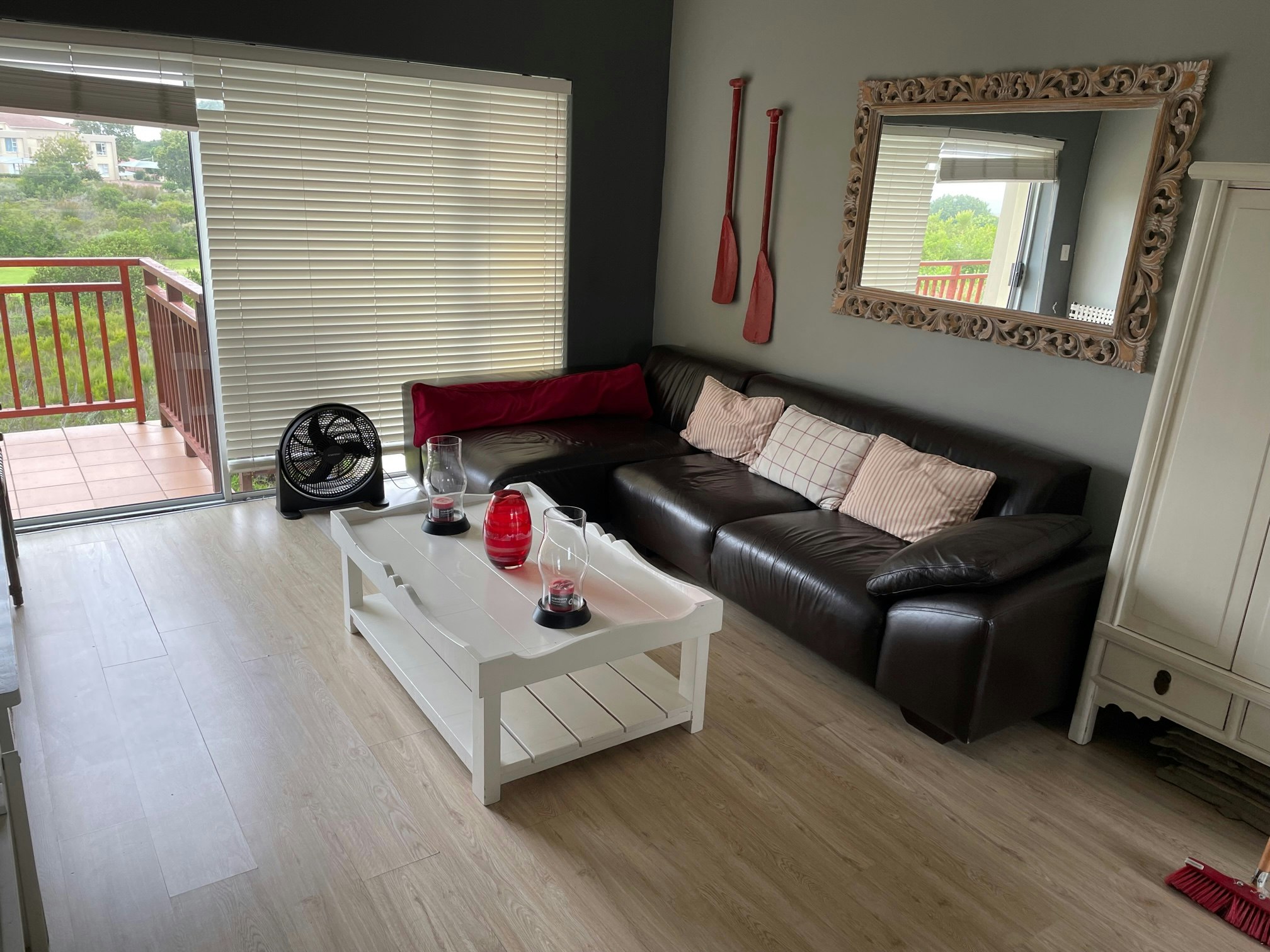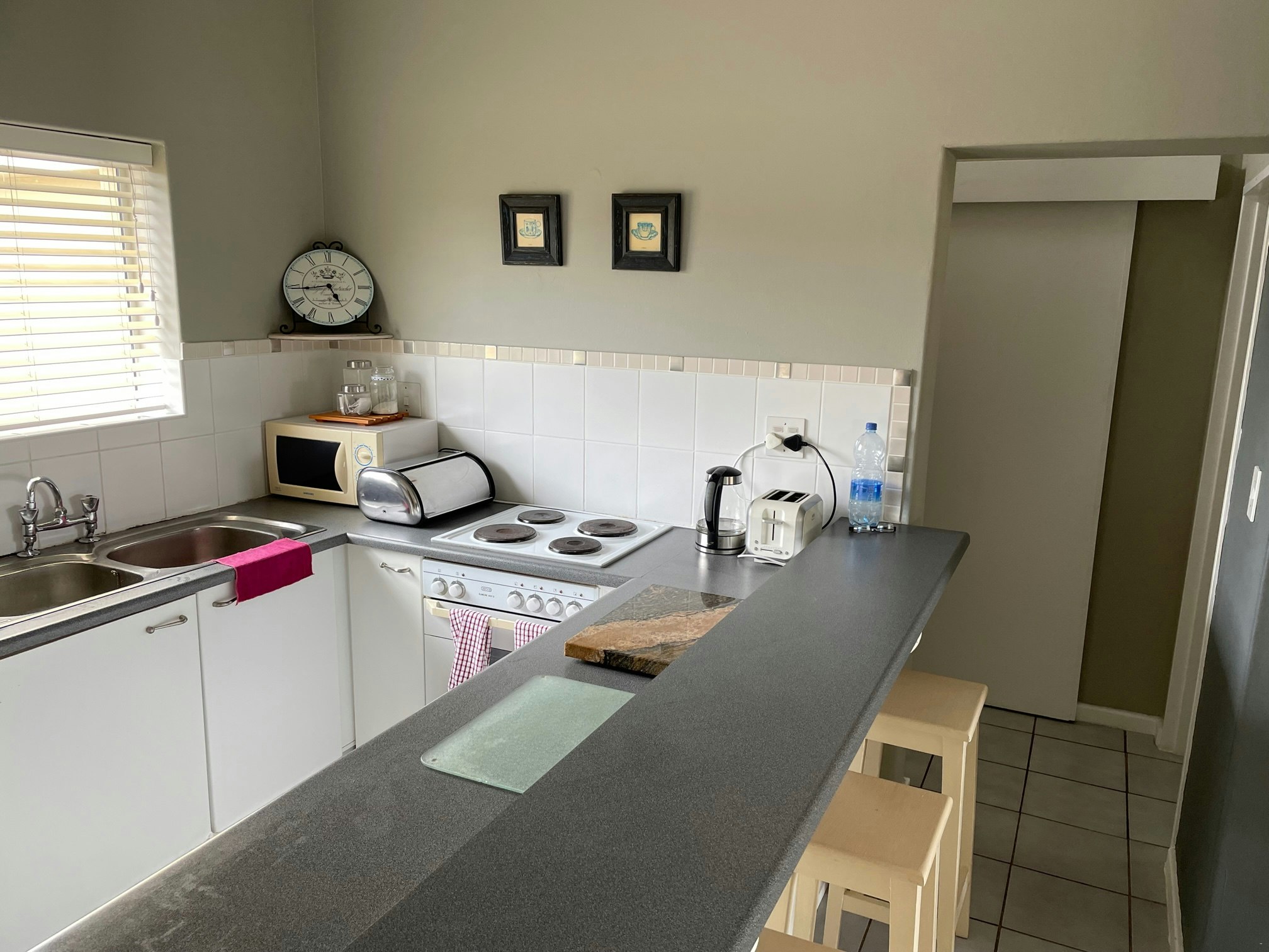 Die kombuis lei na 'n ruim sitarea met gemaklike sitplek en 'n TV en die skuifdeure bied toegang tot 'n balkon met braaigeriewe.