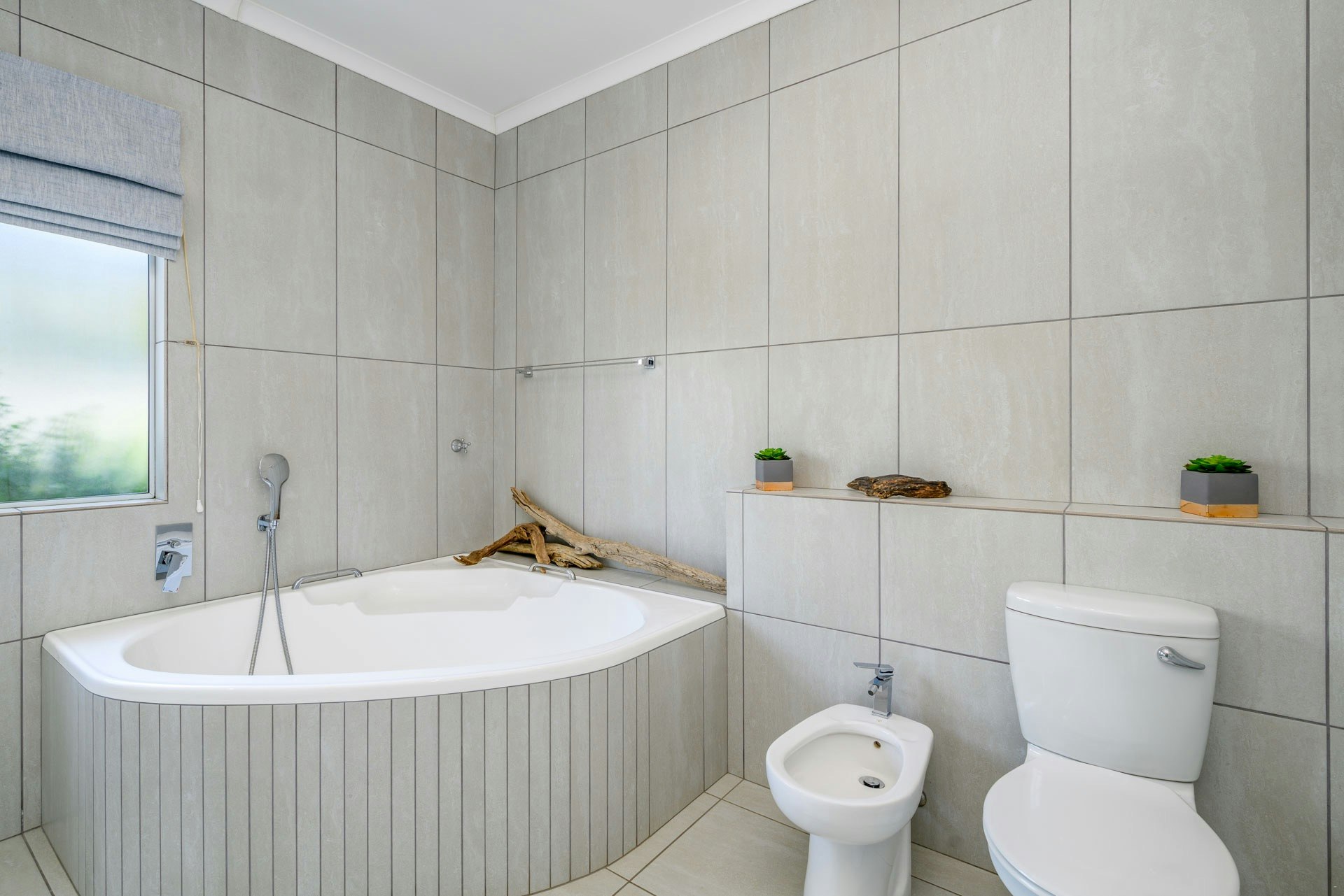 The living area boasts an open-plan design, including a fully equipped kitchen with a coffee machine, stove, oven, microwave, toaster, kettle, cutlery, crockery, and fridge-freezer. A dishwasher, washing machine, and tumble dryer are available in a separate scullery. Leading from the kitchen is an 8-seater dining table, perfect for shared meals. The lounge area offers comfortable seating and breathtaking ocean views. For guests' entertainment, a TV with streaming capabilities, DStv channels and WiFi is provided.