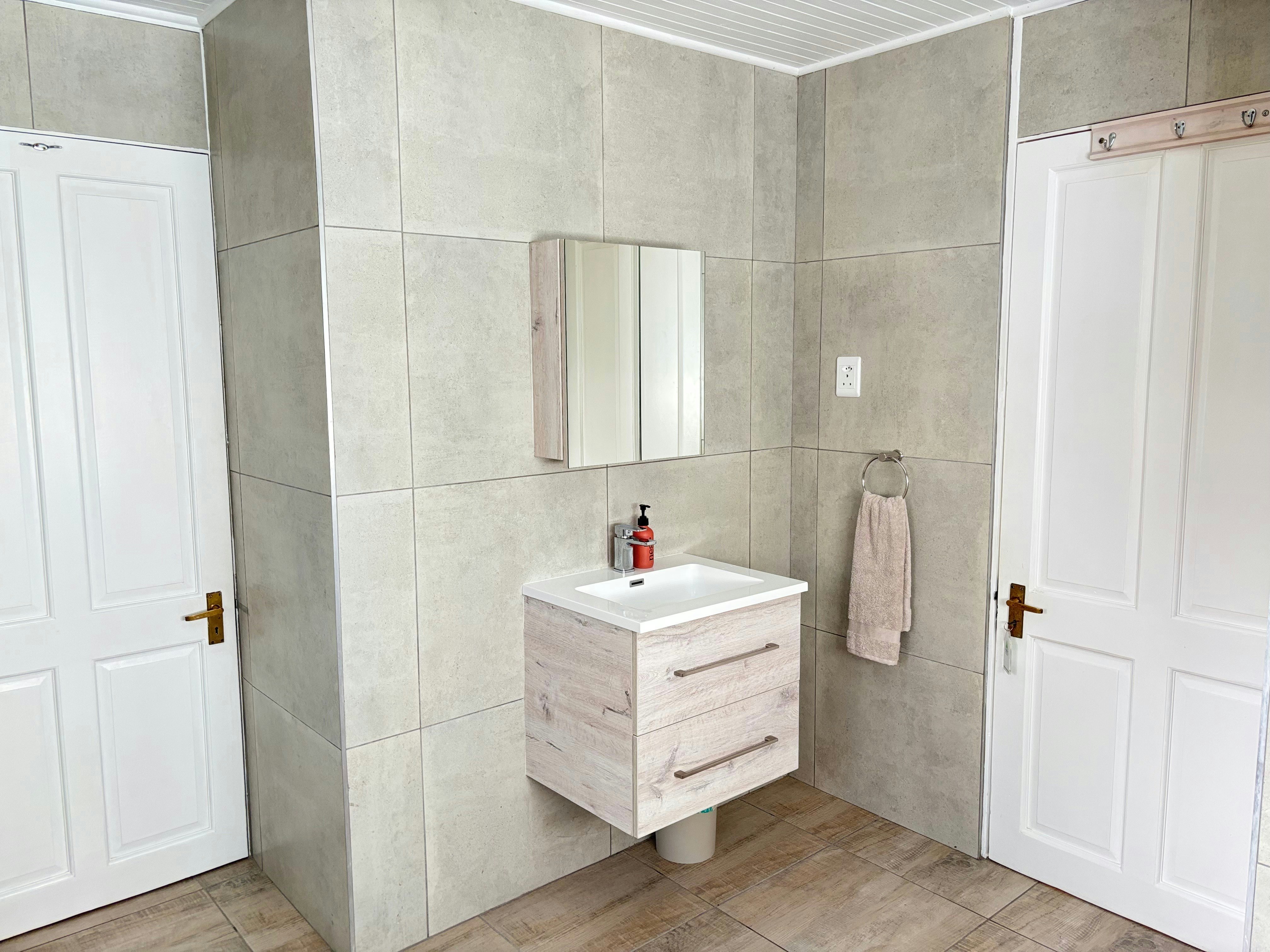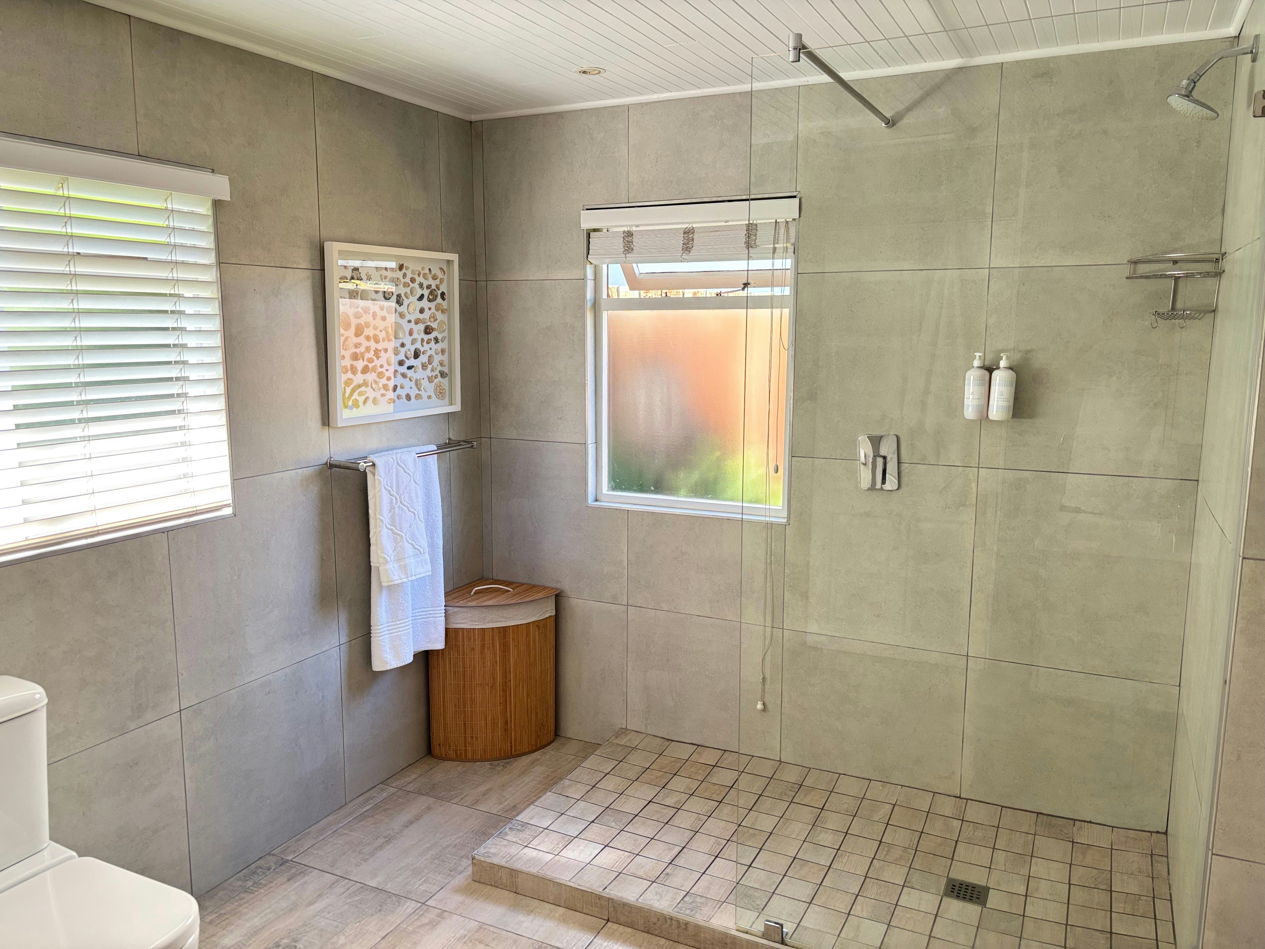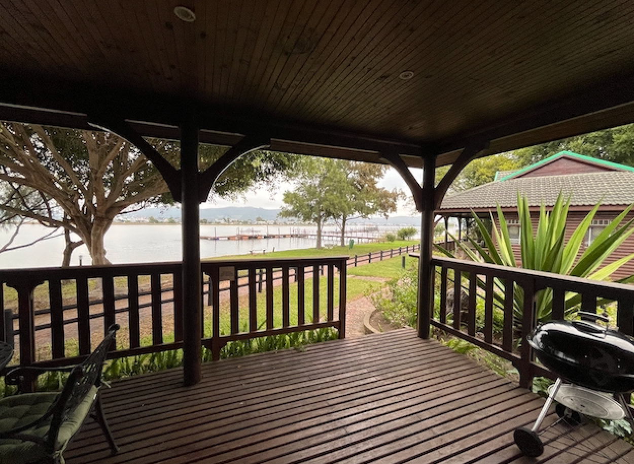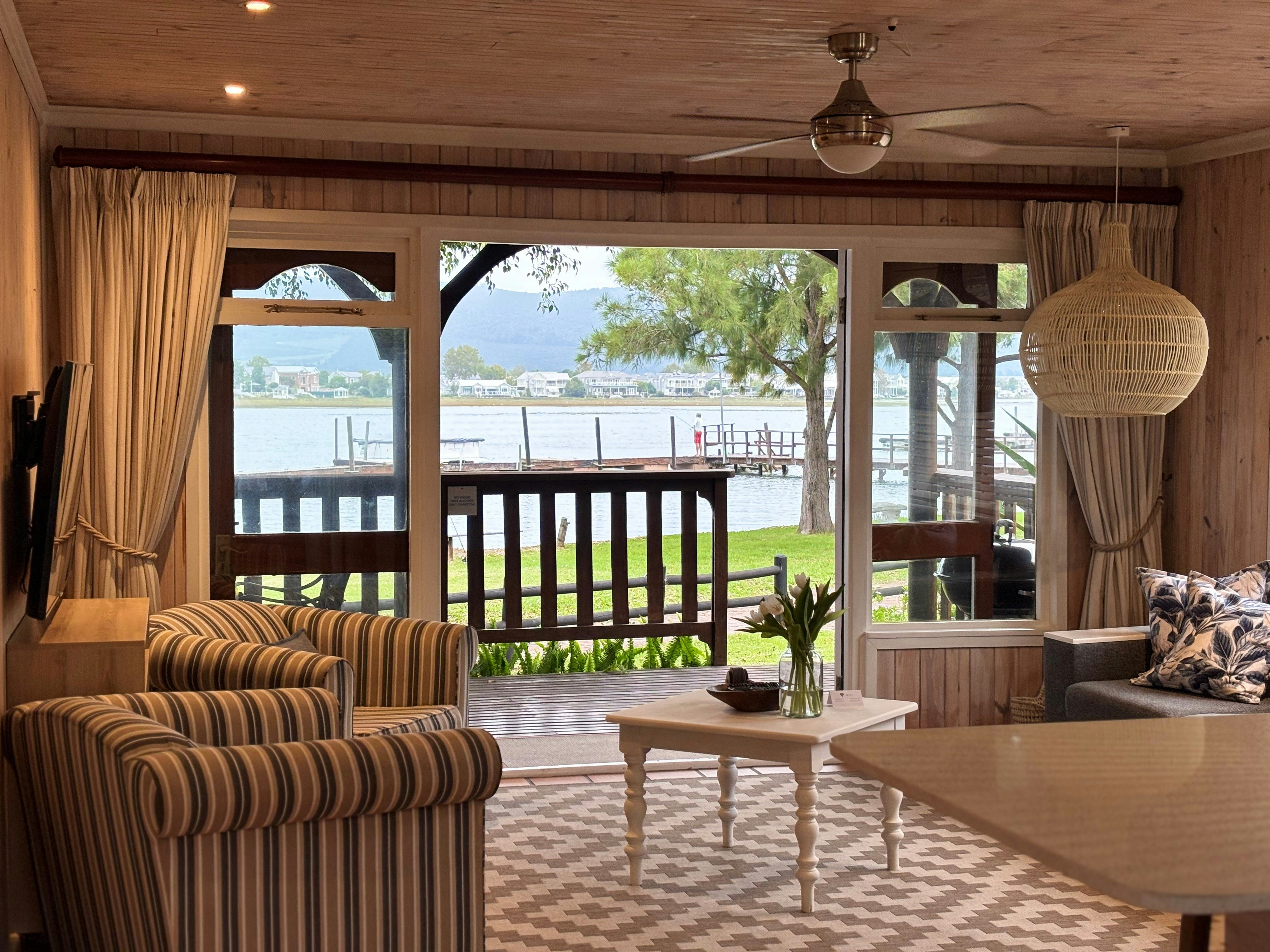 The bright and airy open-plan living area features a kitchen fully equipped with an electric oven, microwave, fridge-freezer, Nespresso machine, cutlery, and crockery. The cozy seating area has a wall-mounted TV and leads to the large private sundeck, set right at the water’s edge, perfect for sundowners or relaxing braai. Access to free Wi-Fi is available.