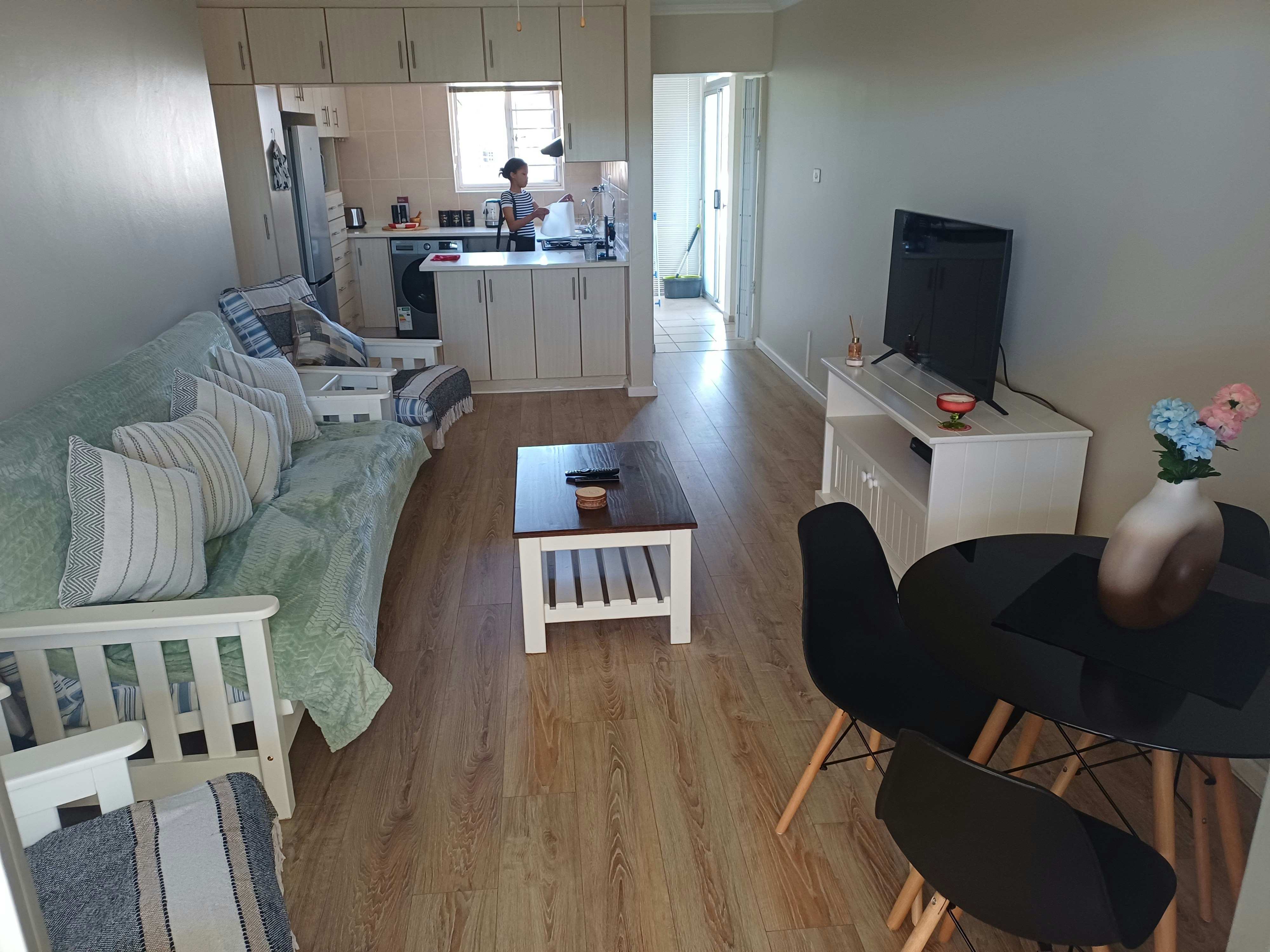 The open-plan living space features a lounge furnished with comfortable couches and a TV with DStv, and the kitchen is equipped with a fridge-freezer, stove, oven, microwave, and washing machine.