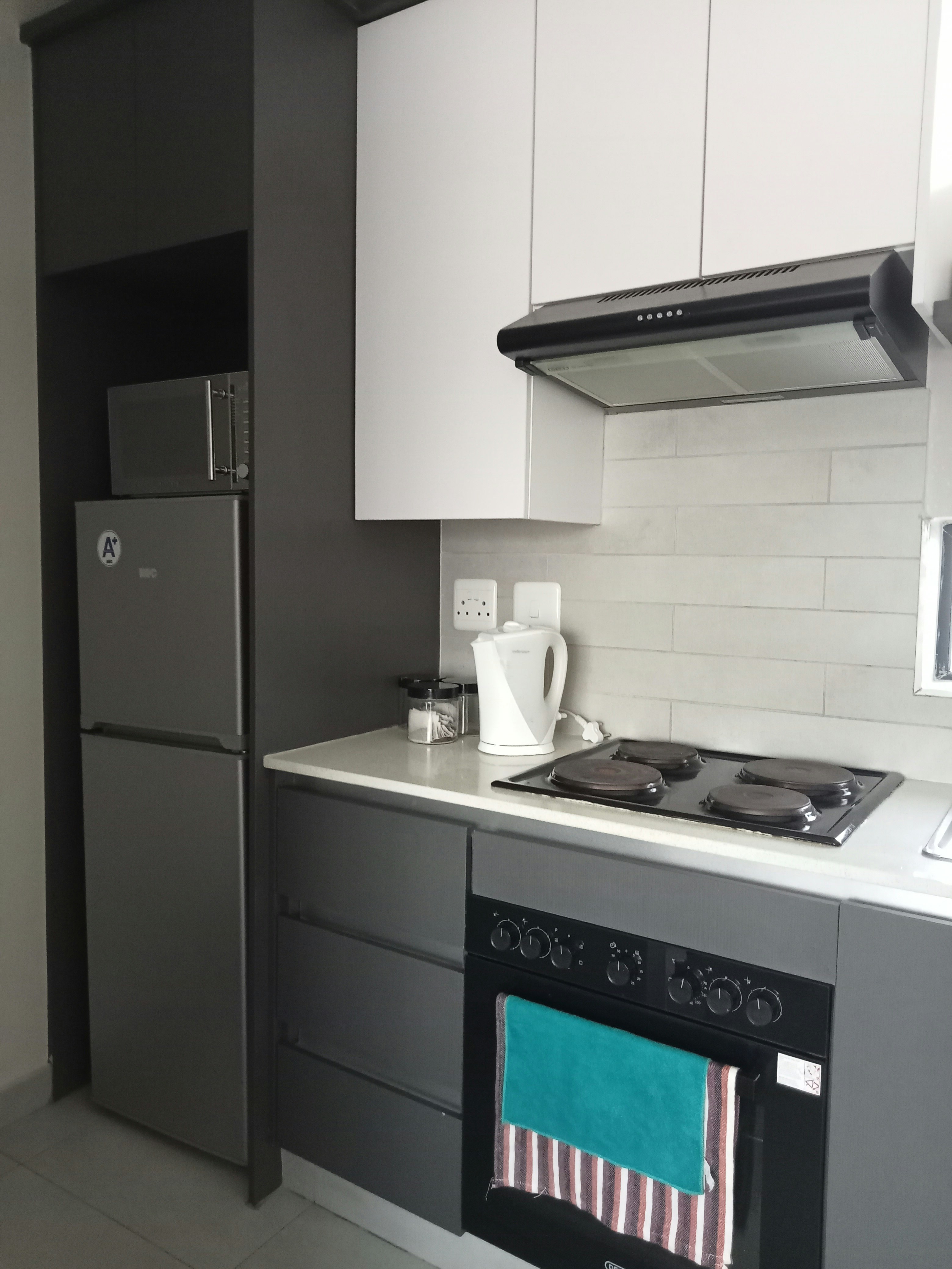 The living area boasts an open-plan design with a fully equipped kitchen including a stove, oven, microwave, fridge-freezer, as well as cutlery and crockery. For guests' convenience, a washing machine is also available in the kitchen. Leading from the kitchen is a lounging area with a TV featuring Netflix and free Wi-Fi facilities.This uint does not experience any power outages.
