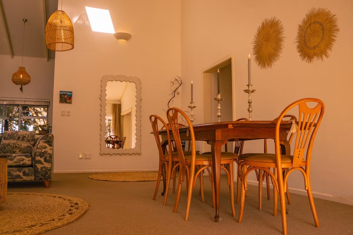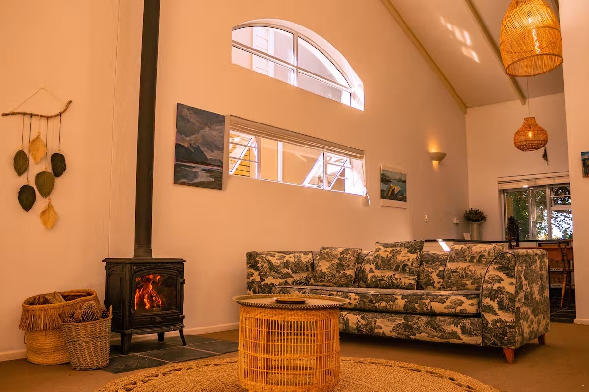 The open-plan living area features high ceilings and a fully equipped kitchen with a fridge-freezer, stove, oven, microwave, cutlery and crockery, as well as tea- and coffee-making facilities. For added convenience, a dishwasher and washing machine are also available. Adjacent to the kitchen is a lounge with a 6-seater dining table, a wood-burning fireplace, and ample comfortable seating, perfect for dining and unwinding after a day of exploring.