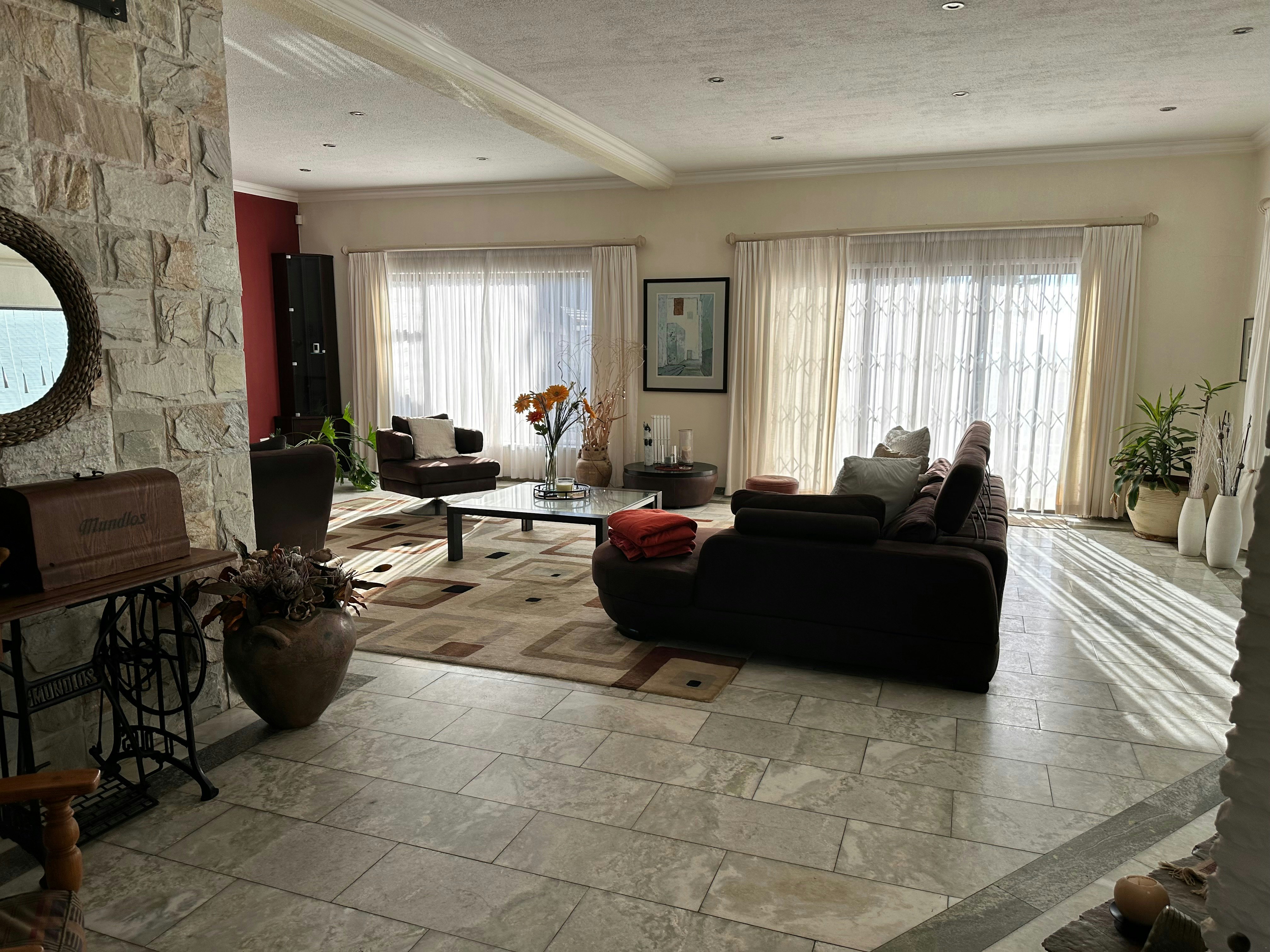 A second entertainment area is also provided, and guests can take advantage of the on-site swimming pool and an undercover patio with comfortable outdoor furniture, perfect for enjoying a late afternoon sundowner. A 3-car garage offers secure off-street parking.