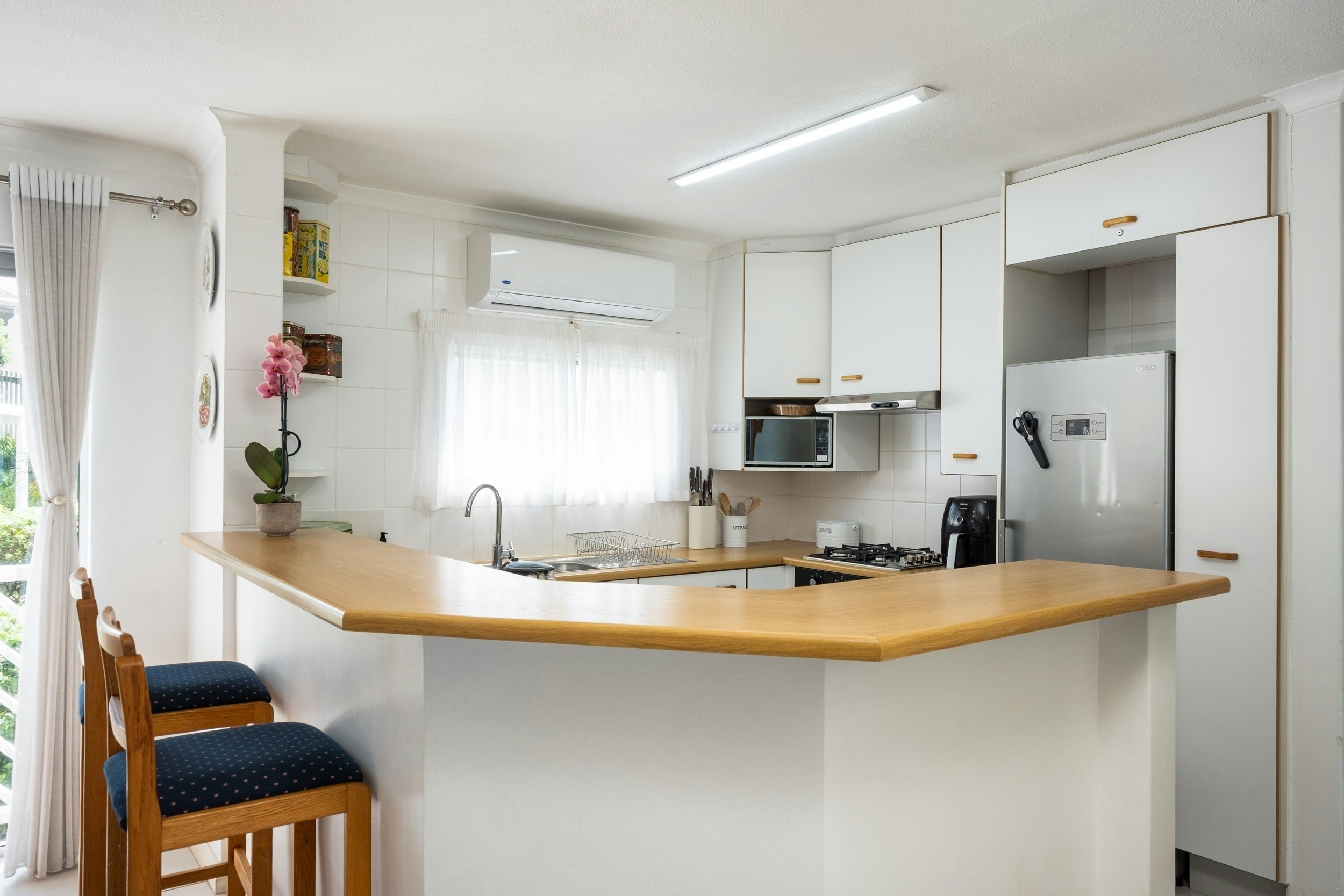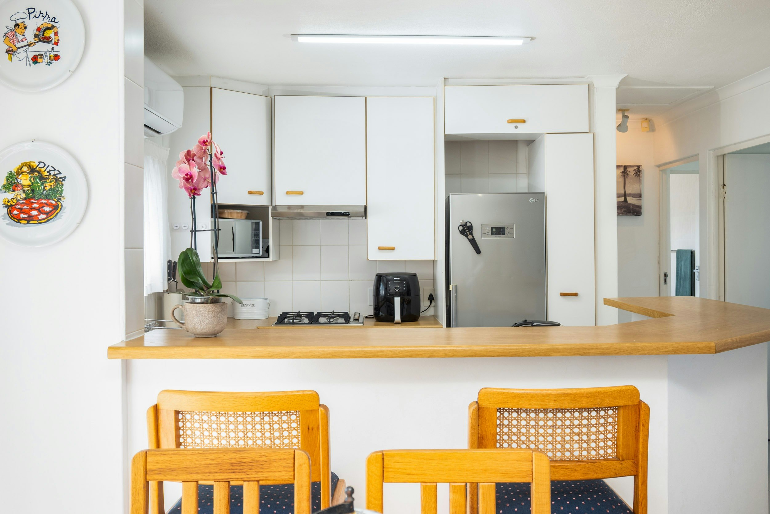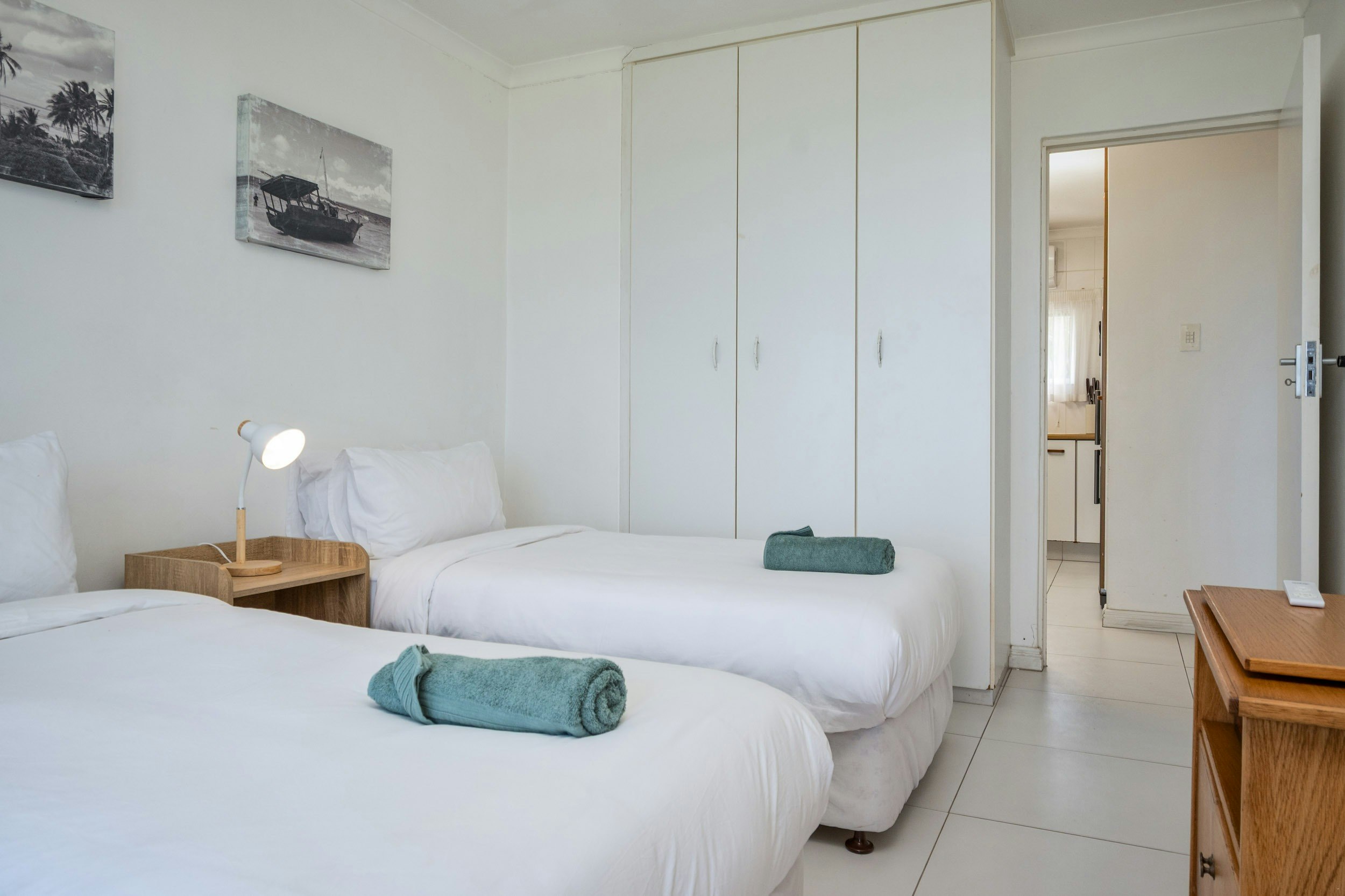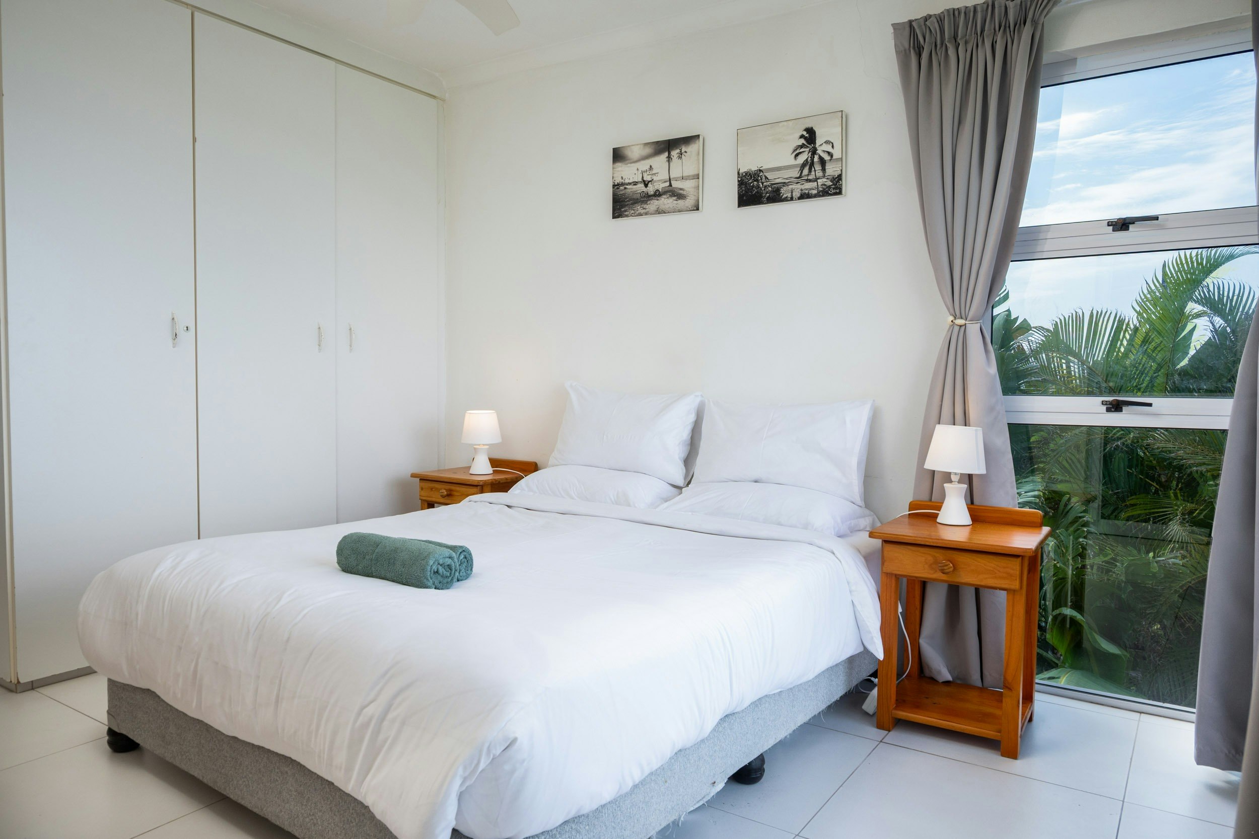The apartment accommodates up to 4 guests in 2 bedrooms and 2 bathrooms. The main bedroom is furnished with a queen-size bed, and the second bedroom is furnished with 2 single beds. Both bedrooms are fitted with ceiling fans. The main bathroom is fitted with a shower, and the second bathroom is fitted with a bath.