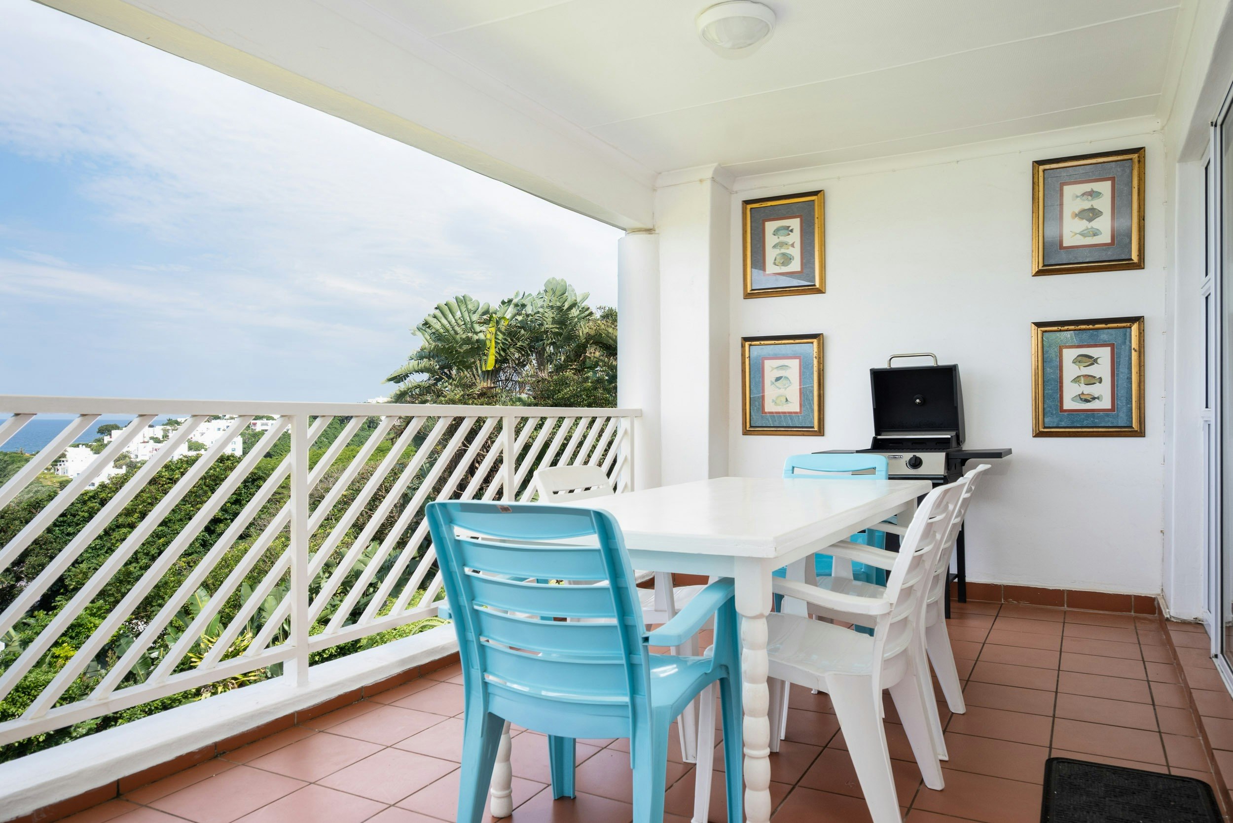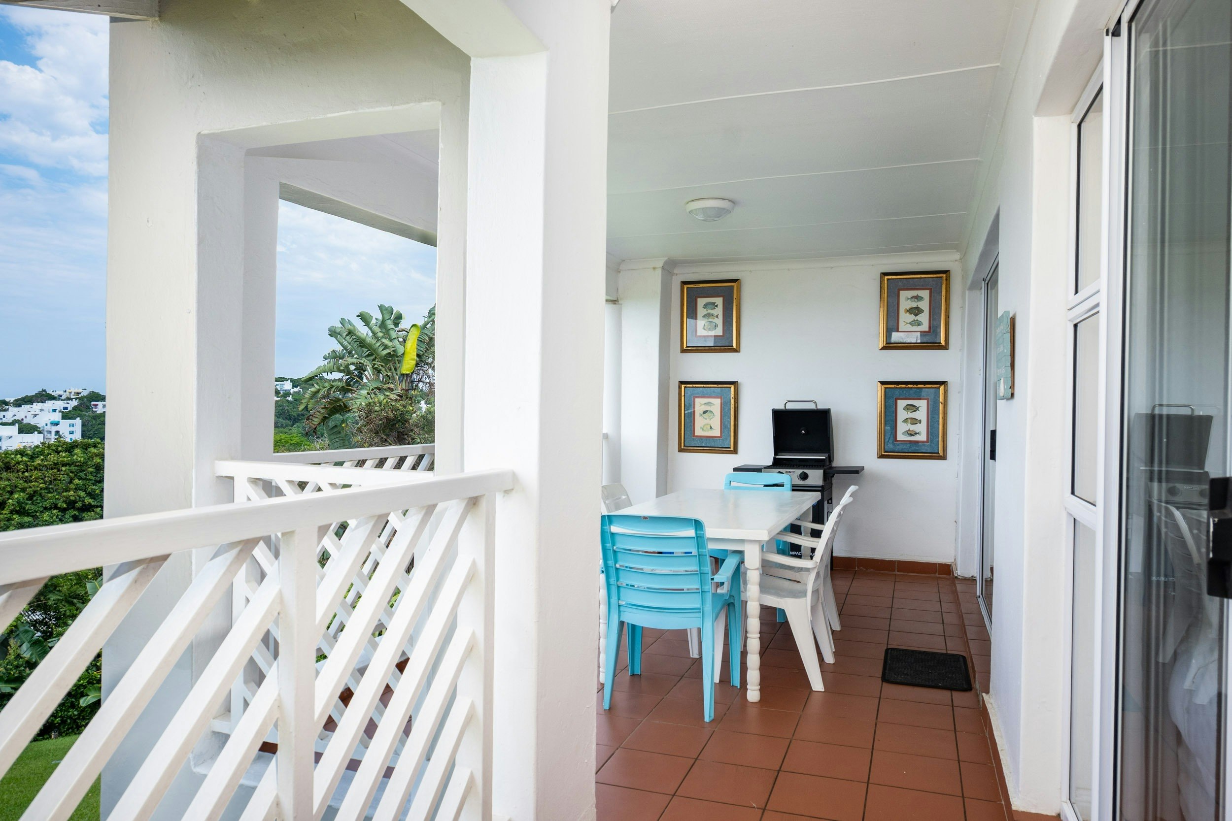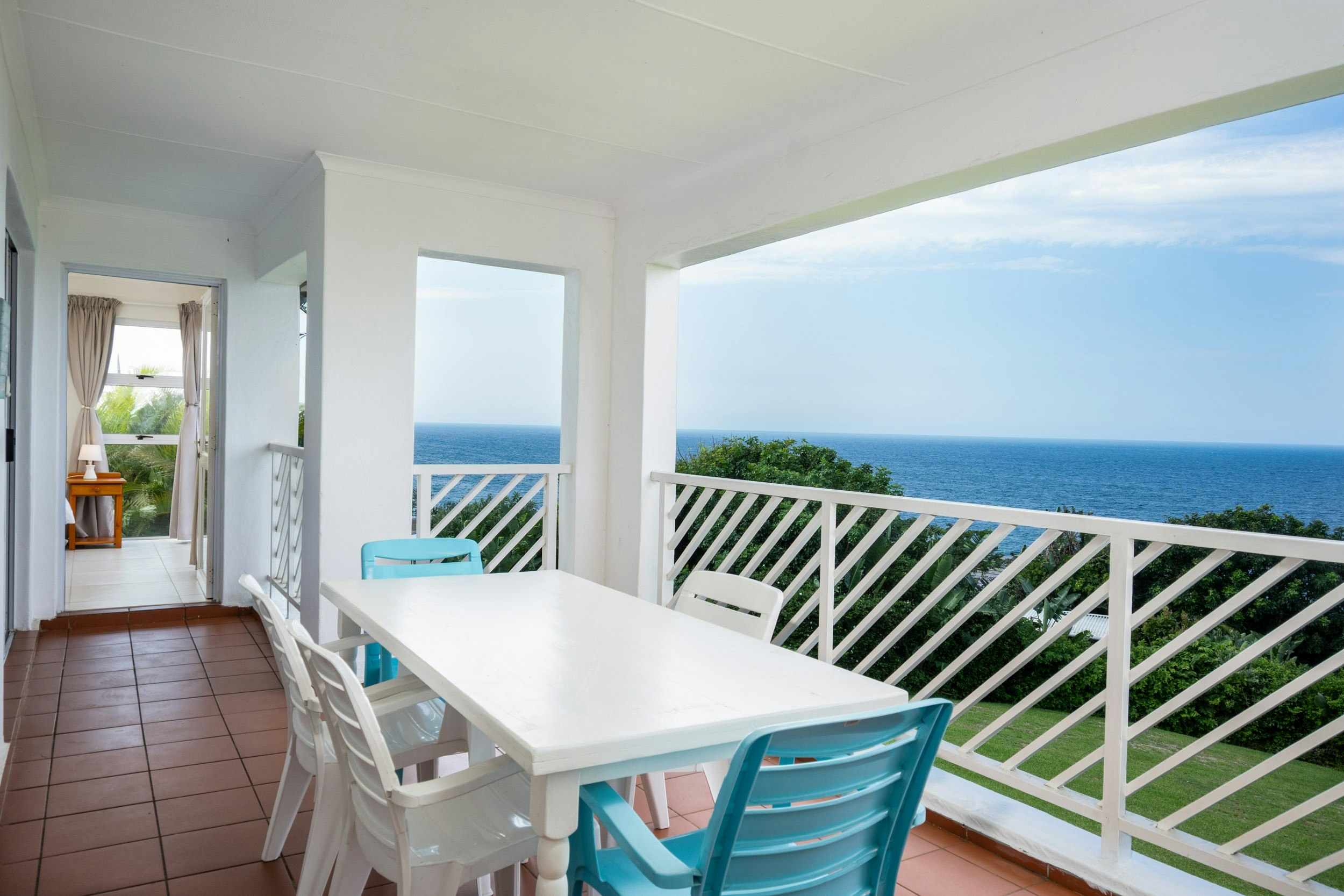 The covered balcony offers breathtaking ocean views and features a gas braai. Guests also have access to the complex’s communal swimming pool, braai facilities, and tennis courts.