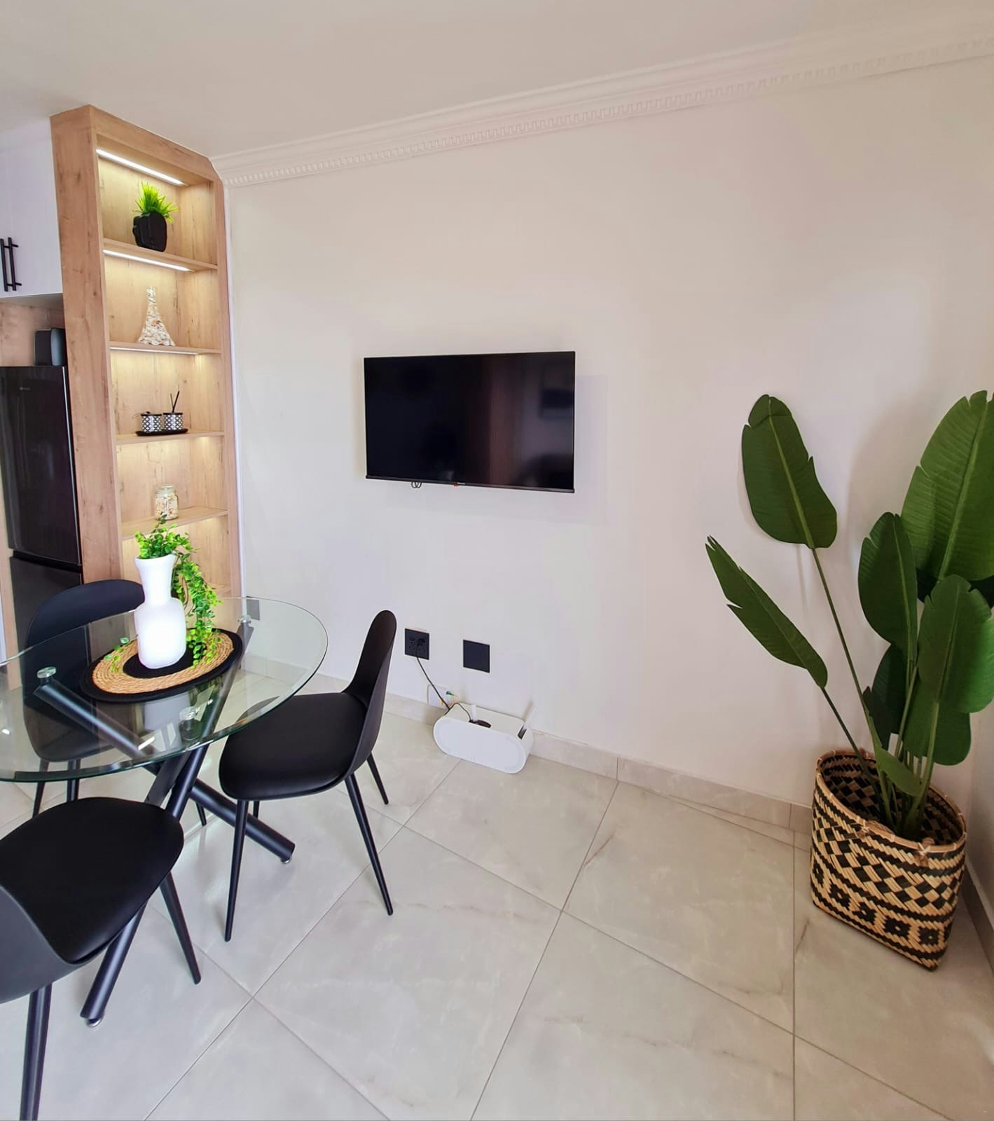 The open-plan living area includes a kitchen with a stove, oven, microwave, fridge-freezer, cutlery, and crockery. A dining table with seating for 3 is located next to the kitchen. The lounge area offers comfortable seating, a smart TV with DStv channels, and free Wi-Fi. Secure parking is provided.