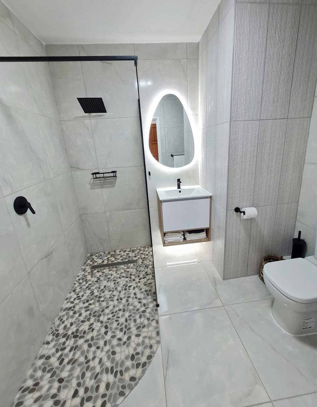 This apartment accommodates 2 adults and 1 child and features 1 bedroom and 1 bathroom. The main bedroom has a queen-size bed, and there is a single sleeper couch suitable for a child. Guests share a bathroom equipped with a shower, basin, and toilet.