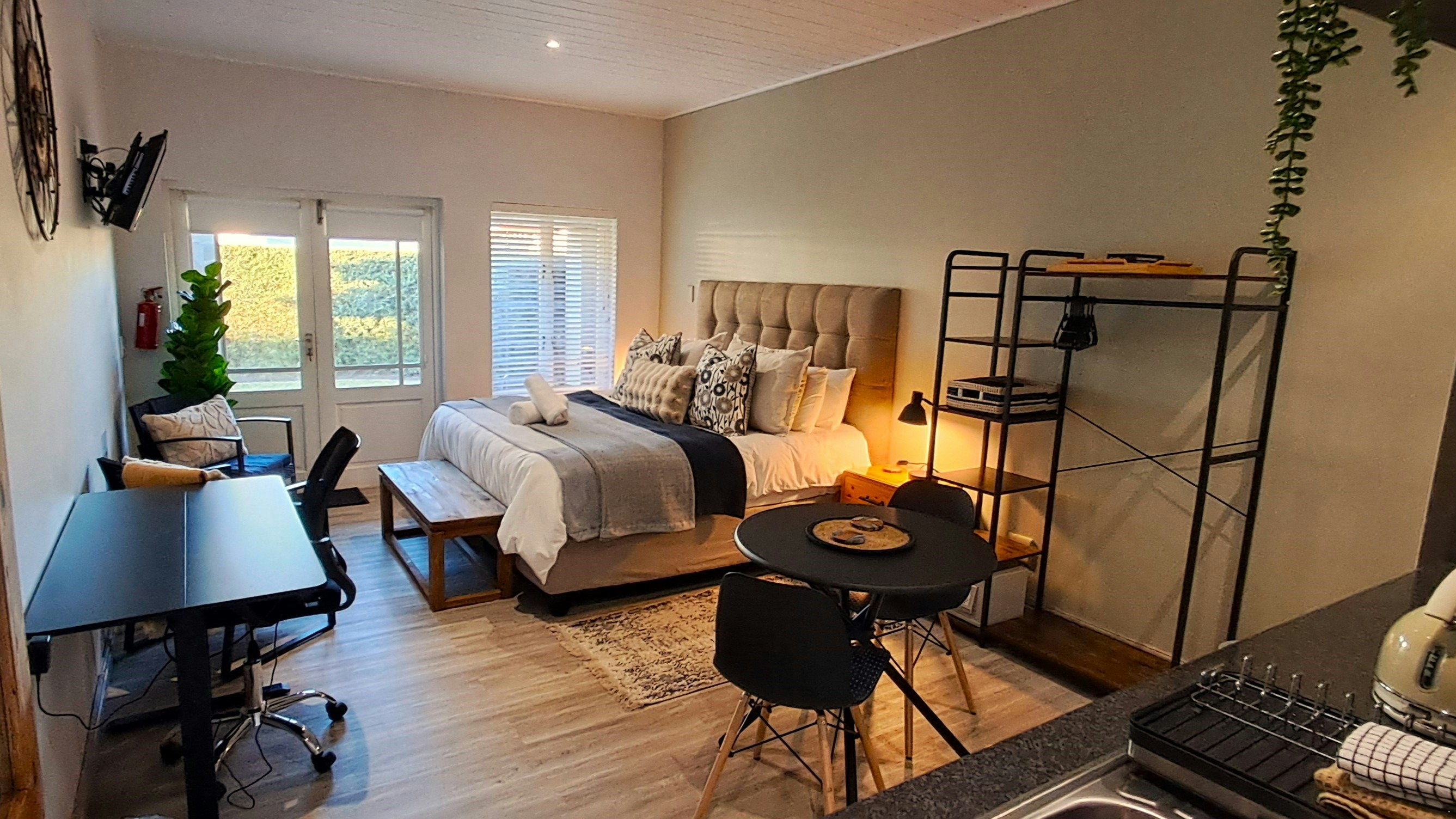 This studio can accommodate 2 guests and features an open-plan sleeping area with an en-suite bathroom. The sleeping area is furnished with a king-size bed that can be converted into 2 single beds, as well as a built-in cupboard. The bathroom is fitted with a shower, toilet, and washbasin. Linen and bath towels are provided.